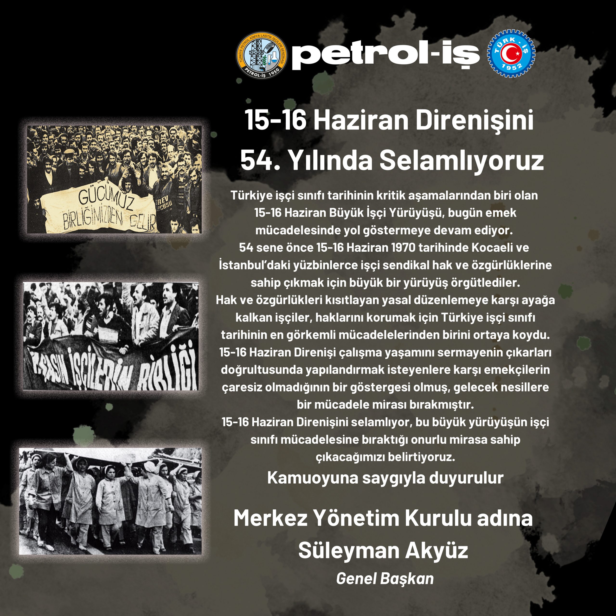 15-16 Haziran Direnişini selamlıyor, bu büyük yürüyüşün işçi sınıfı mücadelesine bıraktığı onurlu mirasa sahip çıkacağımızı belirtiyoruz.