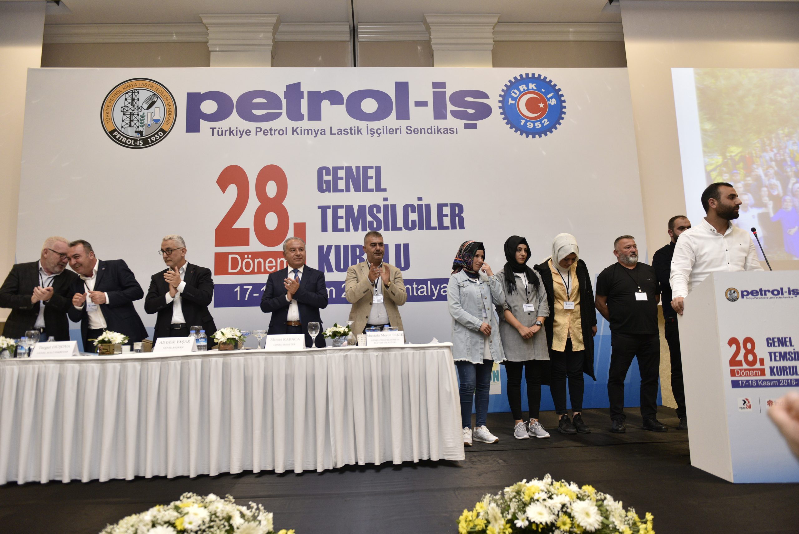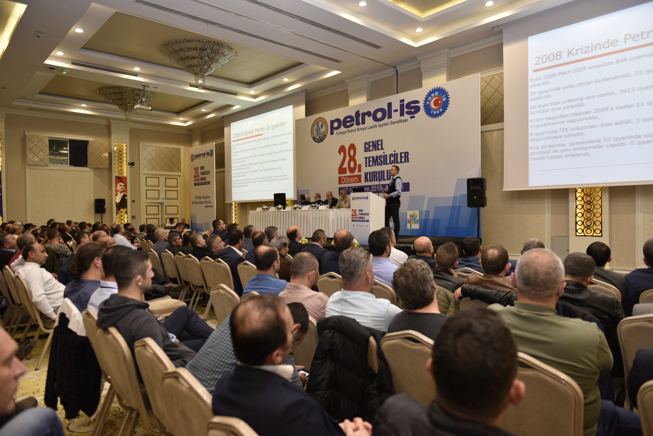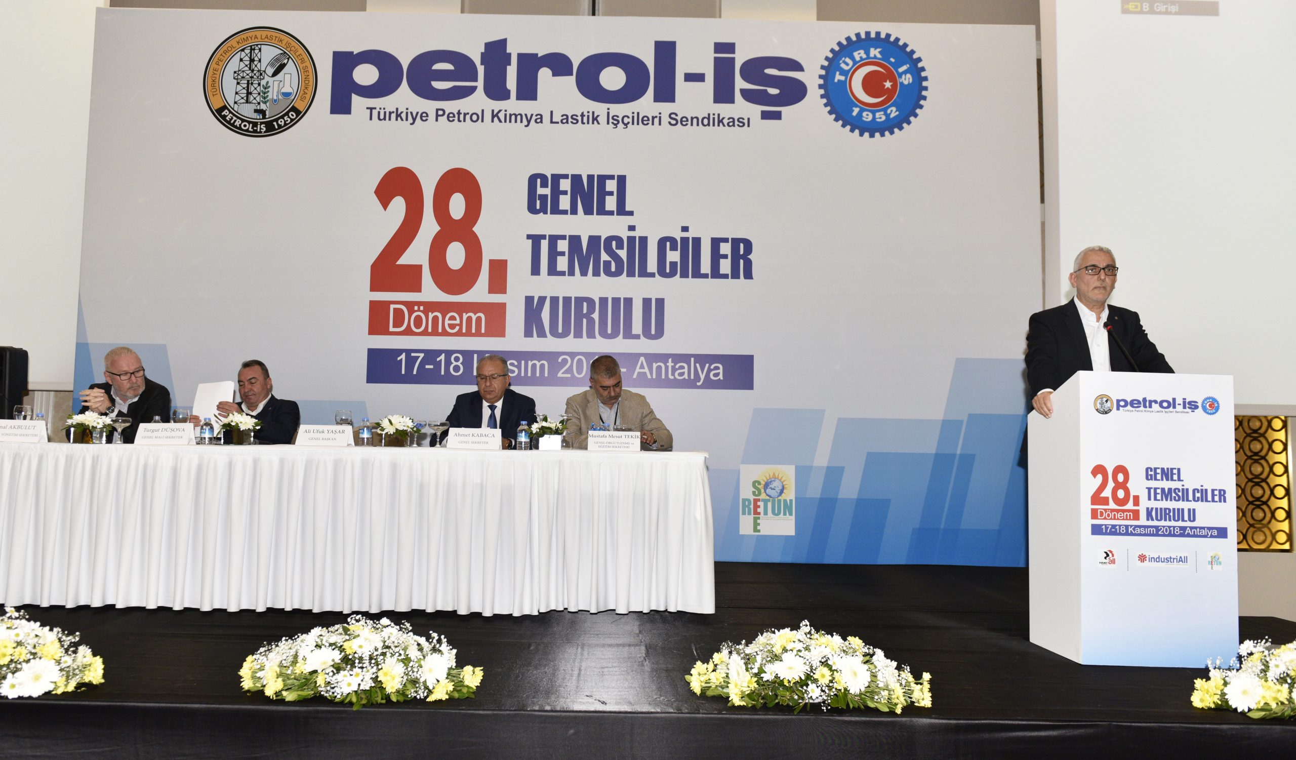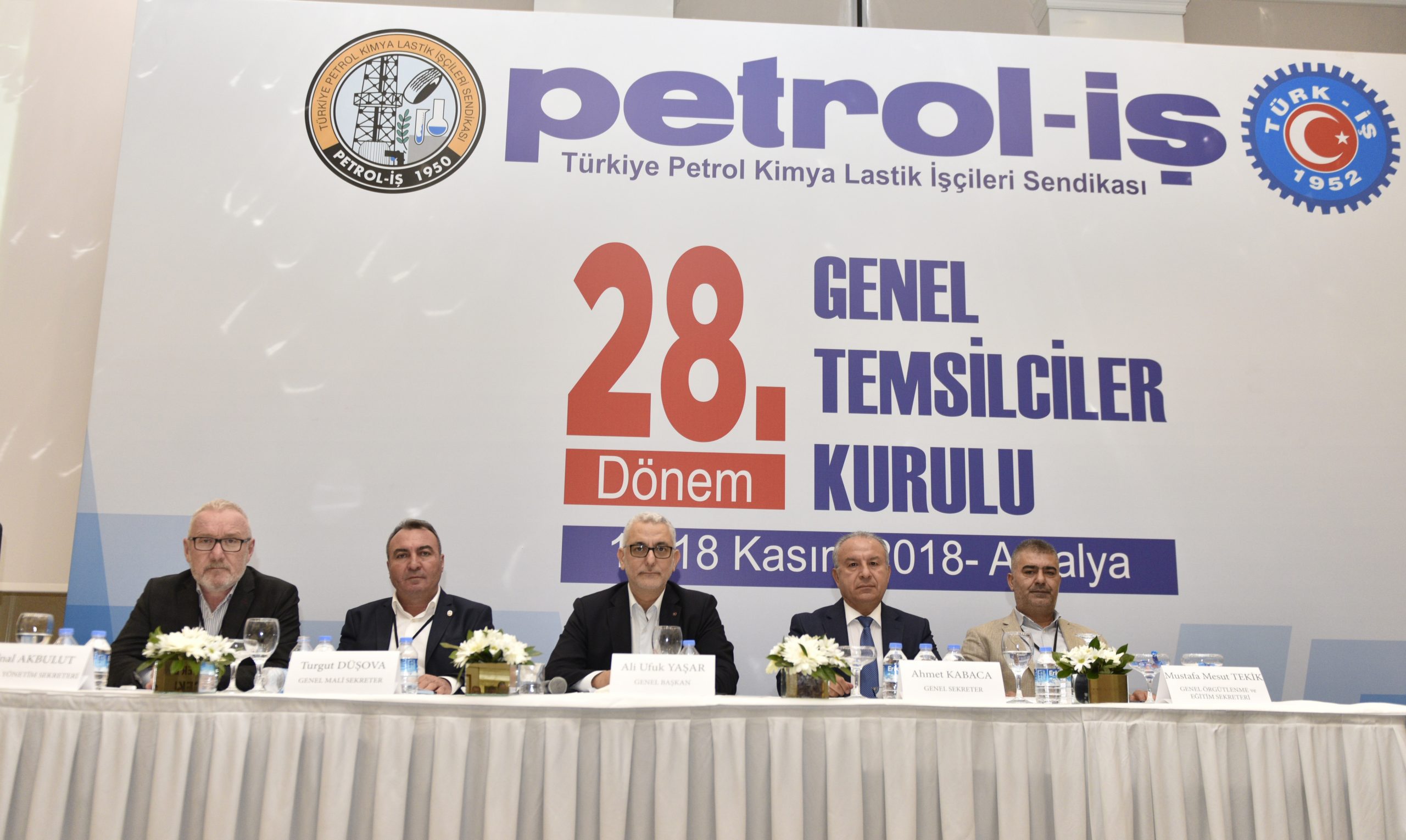 Petrol-İş Sendikası 28. Dönem GENEL TEMSİLCİLER KURULU, 17-18 Kasım 2018 tarihinde Antalya’da, 500’ün üzerinde üyenin katılımıyla toplandı. Her faaliyet döneminde yapılan ve Petrol-İş’in merkez yöneticilerini, merkez denetim ve disiplin kurulu üyelerini; sendikamızın 16 şubesinin örgütlü olduğu işyerlerindeki tüm temsilcileri, şube yöneticilerini, denetim ve disiplin kurulu üyelerini bir araya getiren Genel Temsilciler Kurulu, dünya ve Türkiye’deki gelişmeleri, emeğin ve sendikal hareketin gündemini, sendikamızın örgütsel konularını değerlendirdi. Sendikamızın genel merkez yöneticileri, şube başkan ve yöneticileri ile örgütlü olduğumuz tüm işyerleri baştemsilci ve temsilcilerinin, sendika uzmanlarının, gazetecilerin katıldığı toplantıda, dünyada ve ülkemizde yaşanan siyasi, sosyal ve ekonomik gelişmeler, dünya ve Türkiye sendikal hareketinin bugünkü durumu ve atılması gereken adımlar üzerinde ayrıntılı tartışmalar yürütüldü. Genel Temsilciler Kurulu, örgütlü olduğumuz işyerlerinde yaşanan sorunları da gündemine alarak izlenecek politika ve stratejileri saptadı. Sendikalaştıkları için işlerinden atılan ve altıncı ayını geride bırakan Flormar Direnişi de toplantıda ayrıntılı olarak değerlendirilirken, Flormar işçileri de söz alarak direnişteki kararlılıklarını yinelediler.