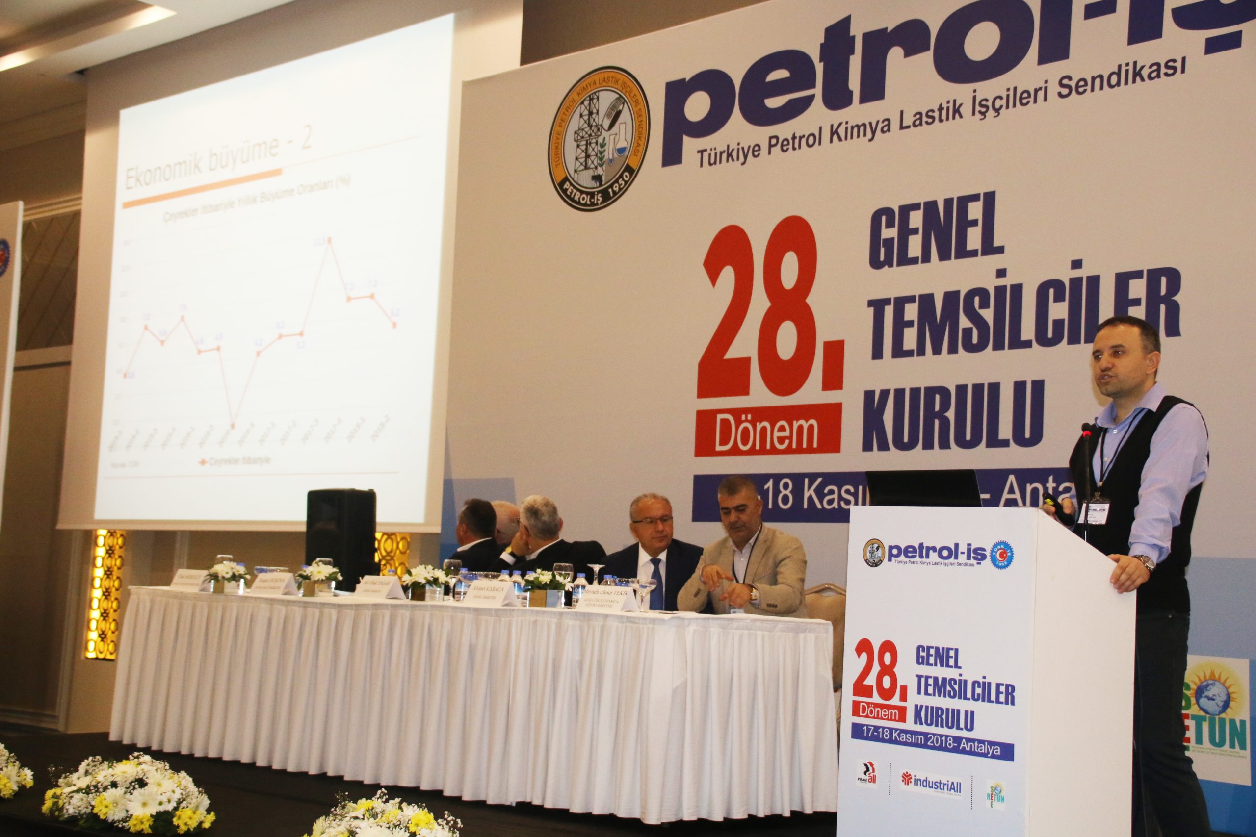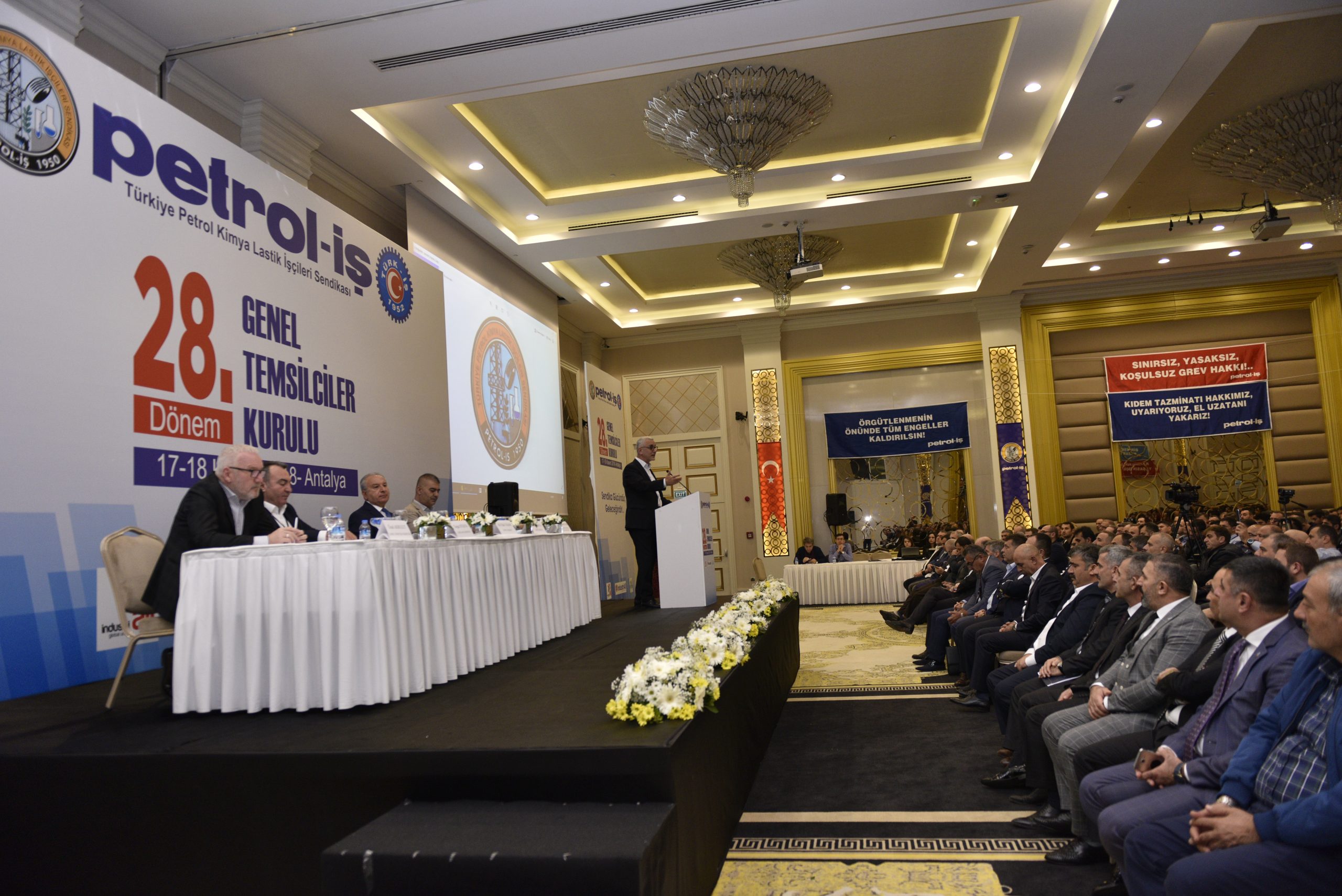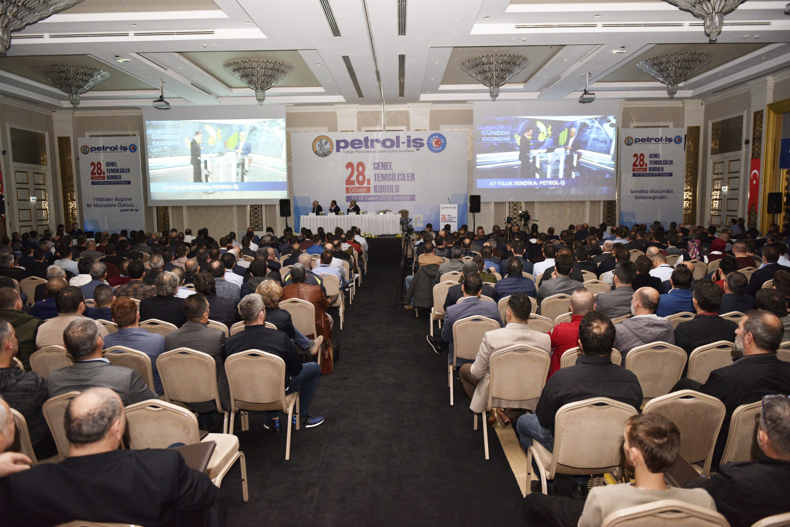 Petrol-İş Sendikası 28. Dönem GENEL TEMSİLCİLER KURULU, 17-18 Kasım 2018 tarihinde Antalya’da, 500’ün üzerinde üyenin katılımıyla toplandı. Her faaliyet döneminde yapılan ve Petrol-İş’in merkez yöneticilerini, merkez denetim ve disiplin kurulu üyelerini; sendikamızın 16 şubesinin örgütlü olduğu işyerlerindeki tüm temsilcileri, şube yöneticilerini, denetim ve disiplin kurulu üyelerini bir araya getiren Genel Temsilciler Kurulu, dünya ve Türkiye’deki gelişmeleri, emeğin ve sendikal hareketin gündemini, sendikamızın örgütsel konularını değerlendirdi. Sendikamızın genel merkez yöneticileri, şube başkan ve yöneticileri ile örgütlü olduğumuz tüm işyerleri baştemsilci ve temsilcilerinin, sendika uzmanlarının, gazetecilerin katıldığı toplantıda, dünyada ve ülkemizde yaşanan siyasi, sosyal ve ekonomik gelişmeler, dünya ve Türkiye sendikal hareketinin bugünkü durumu ve atılması gereken adımlar üzerinde ayrıntılı tartışmalar yürütüldü. Genel Temsilciler Kurulu, örgütlü olduğumuz işyerlerinde yaşanan sorunları da gündemine alarak izlenecek politika ve stratejileri saptadı. Sendikalaştıkları için işlerinden atılan ve altıncı ayını geride bırakan Flormar Direnişi de toplantıda ayrıntılı olarak değerlendirilirken, Flormar işçileri de söz alarak direnişteki kararlılıklarını yinelediler.