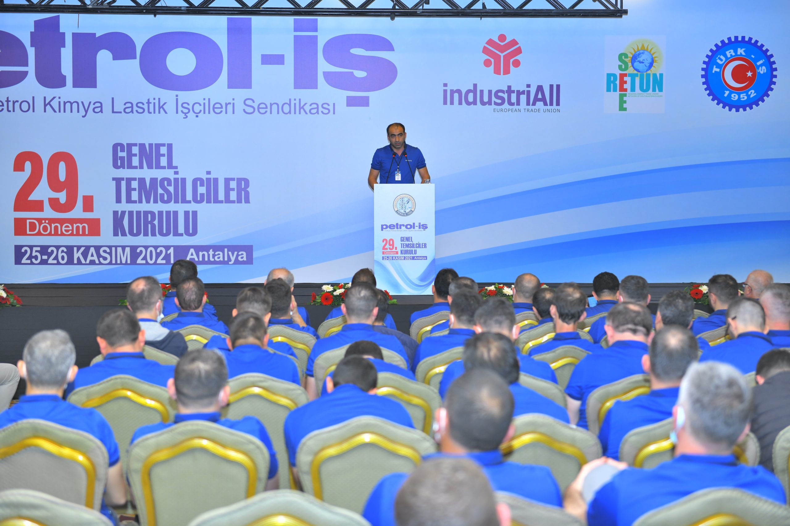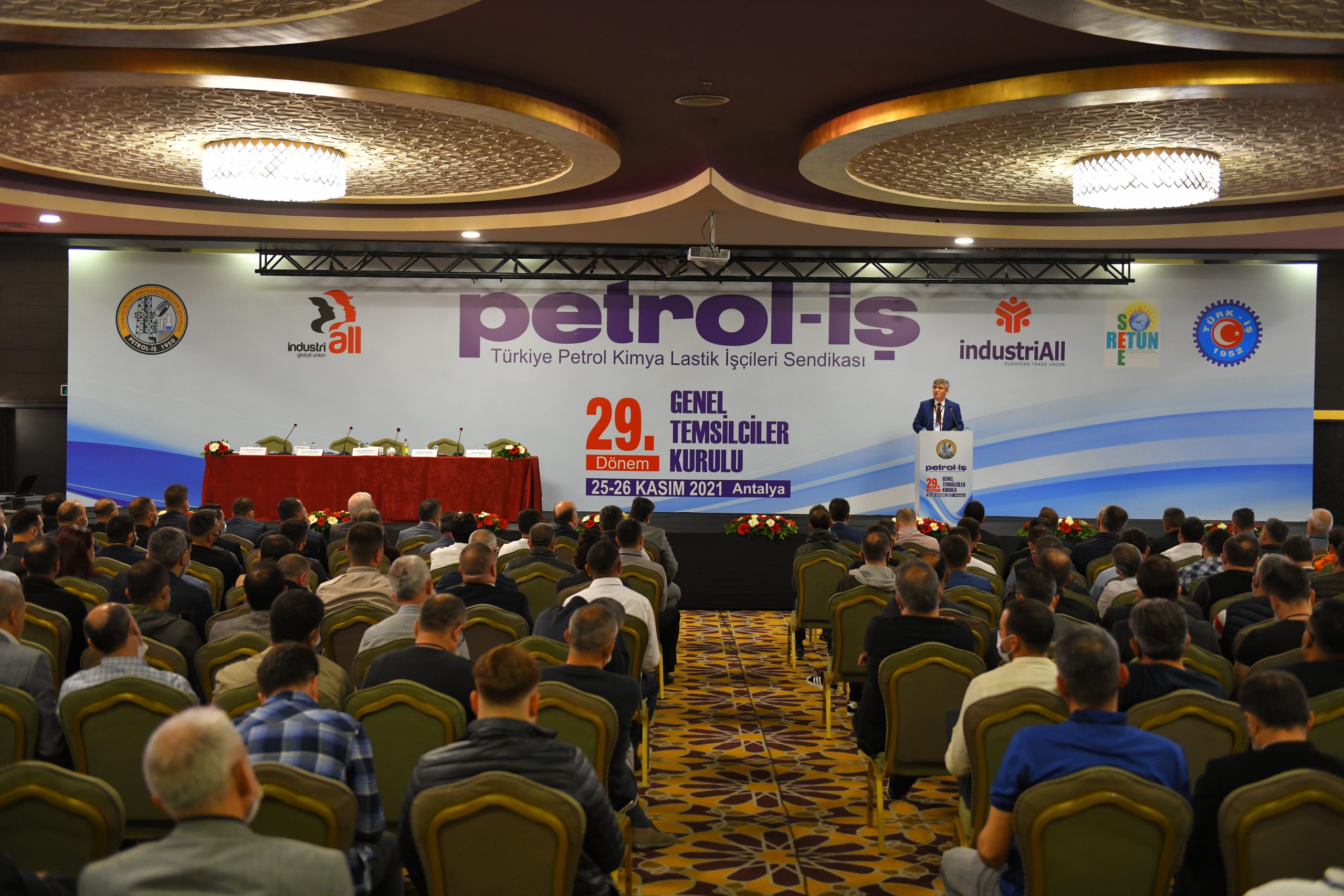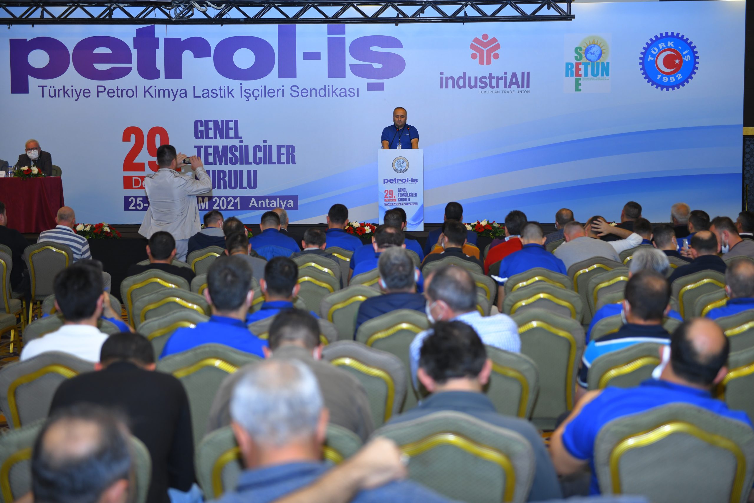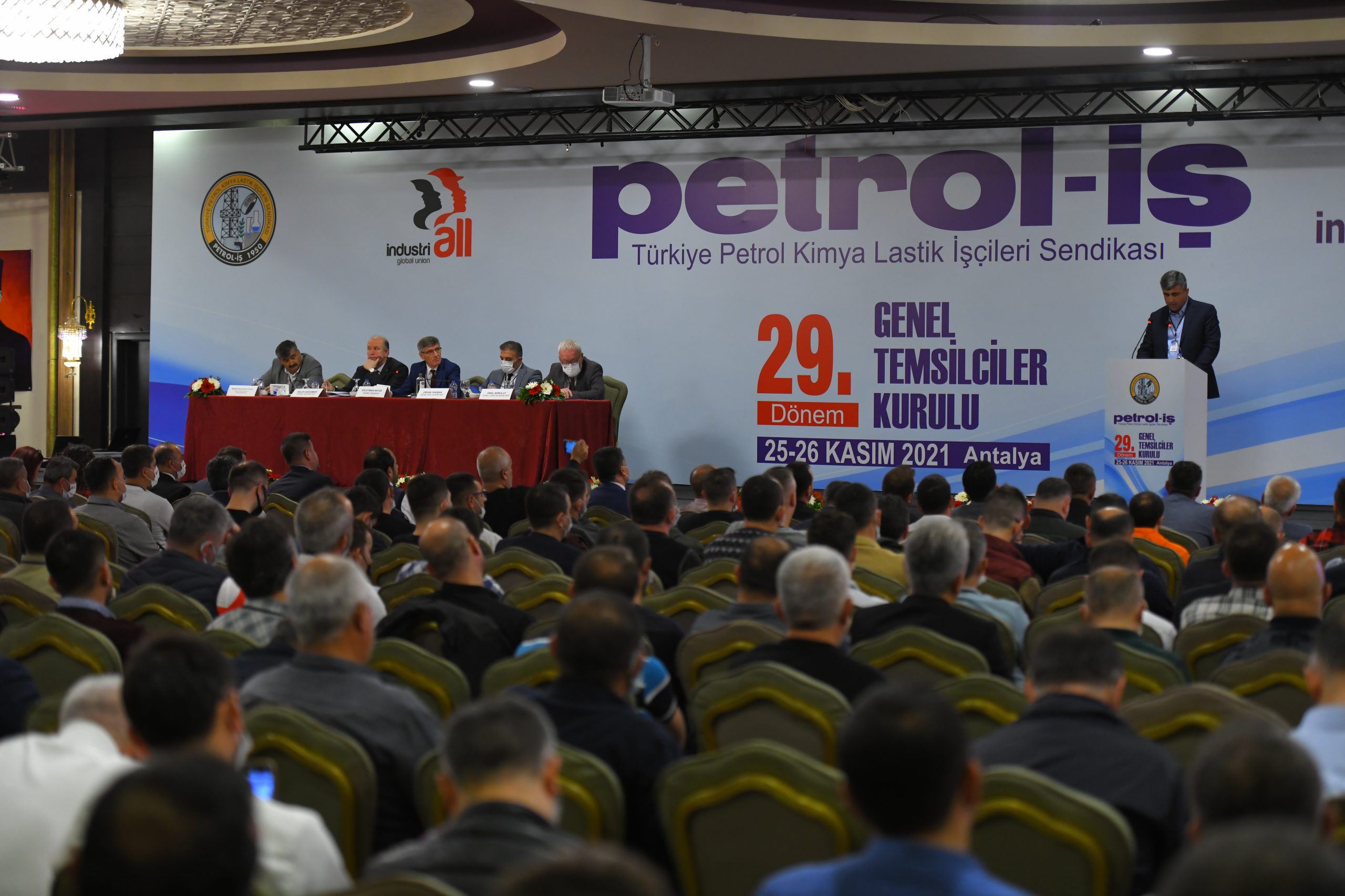 Petrol-İş Sendikası 29. Dönem GENEL TEMSİLCİLER KURULU, 25-26 Kasım 2021 tarihinde Antalya’da 500’i aşkın kişinin katılımıyla toplanmıştır. Her faaliyet döneminde yapılan ve Petrol-İş’in merkez yöneticilerini, merkez denetim ve disiplin kurulu üyelerini; sendikamızın 18 şubesinin örgütlü olduğu işyerlerindeki tüm temsilcileri, şube yöneticilerini, denetim ve disiplin kurulu üyelerini bir araya getiren Genel Temsilciler Kurulu, dünya ve Türkiye’deki gelişmeleri, emeğin ve sendikal hareketin gündemini, sendikamızın örgütsel konularını değerlendirmiştir. Kurul, bu değerlendirmeler ışığında, aşağıda yer alan karar, görüş ve önerileri kamuoyuna iletmeyi uygun bulmuştur:
