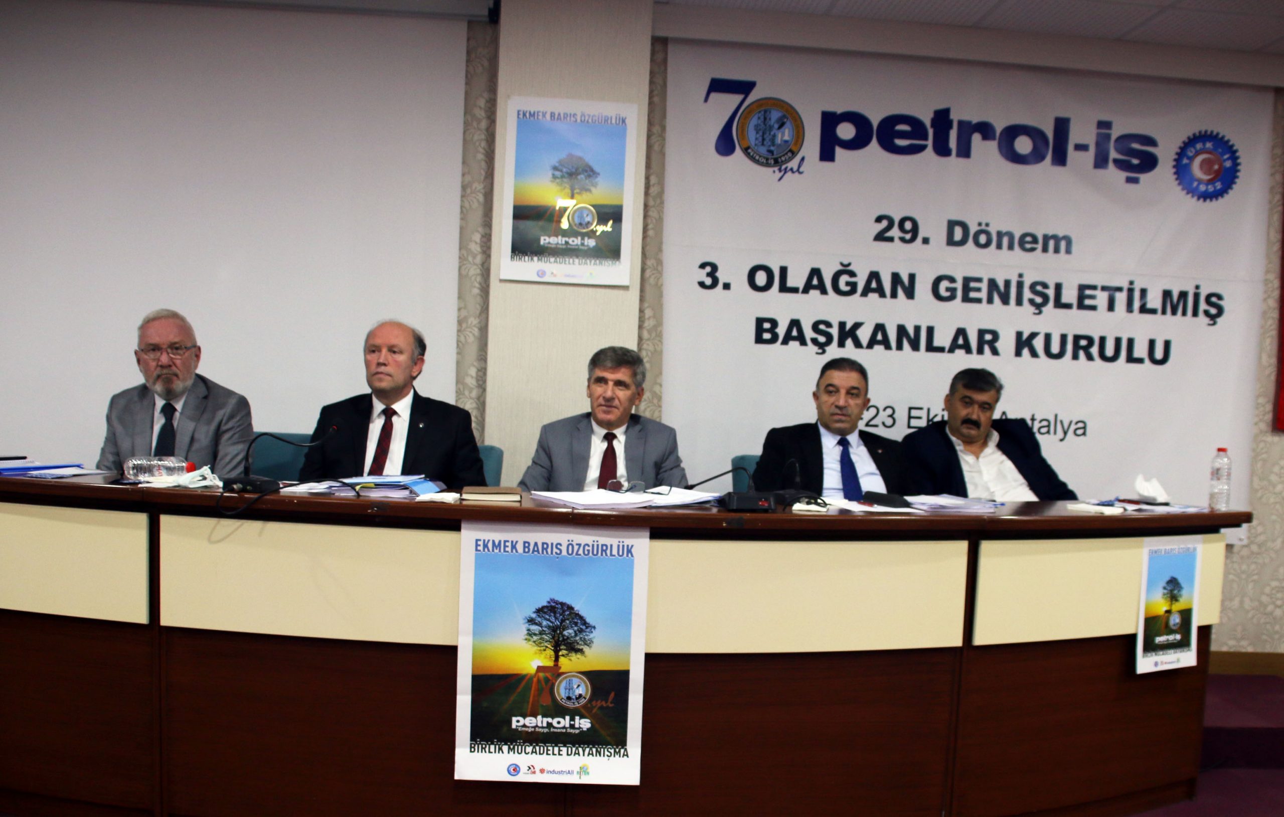 Petrol-İş Genişletilmiş Başkanlar Kurulu 22-23 Ekim tarihlerinde Antalya/Manavgat’ta toplanarak dünyadaki ve ülkedeki gelişmeleri, örgütlenme faaliyetlerini, toplu iş sözleşmelerini, çalışma hayatını ilgilendiren yasa ve tasarıları, örgüt içinde yaşanan aksaklıkları ve örgütsel yapının güçlendirilmesi gibi birçok önemli gündem başlığı ile toplandı.
