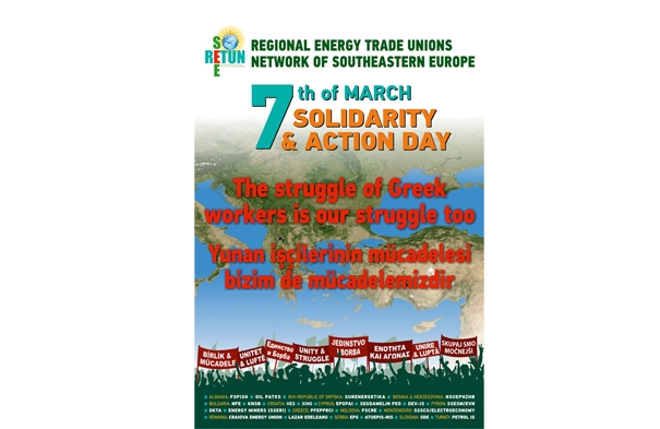 Sendikamız Petrol-İş’in de üyesi olduğu Güneydoğu Avrupa Enerji Sendikaları Bölge Ağı RETUNSEE 11 Şubat 2012 günü Yunanistan’ın Kavala kentinde yapılan 4. Genel Kurulunda oybirliğiyle aldığı kararla, 7 Mart 2012’yi Yunanistan İşçileriyle Dayanışma ve Ortak Eylem Günü olarak belirledi. RETUNSEE 13 ülkeden 23 enerji sendikasının yaklaşık 200 bin üyesini çatısı altında topluyor. Bölge ağı şu ülkeleri kapsıyor: Arnavutluk, Bosna-Hersek, Bulgaristan, Hırvatistan, Kıbrıs, Makedonya, Yunanistan, Moldova, Karadağ, Sırbistan, Romanya, Slovenya, Türkiye.