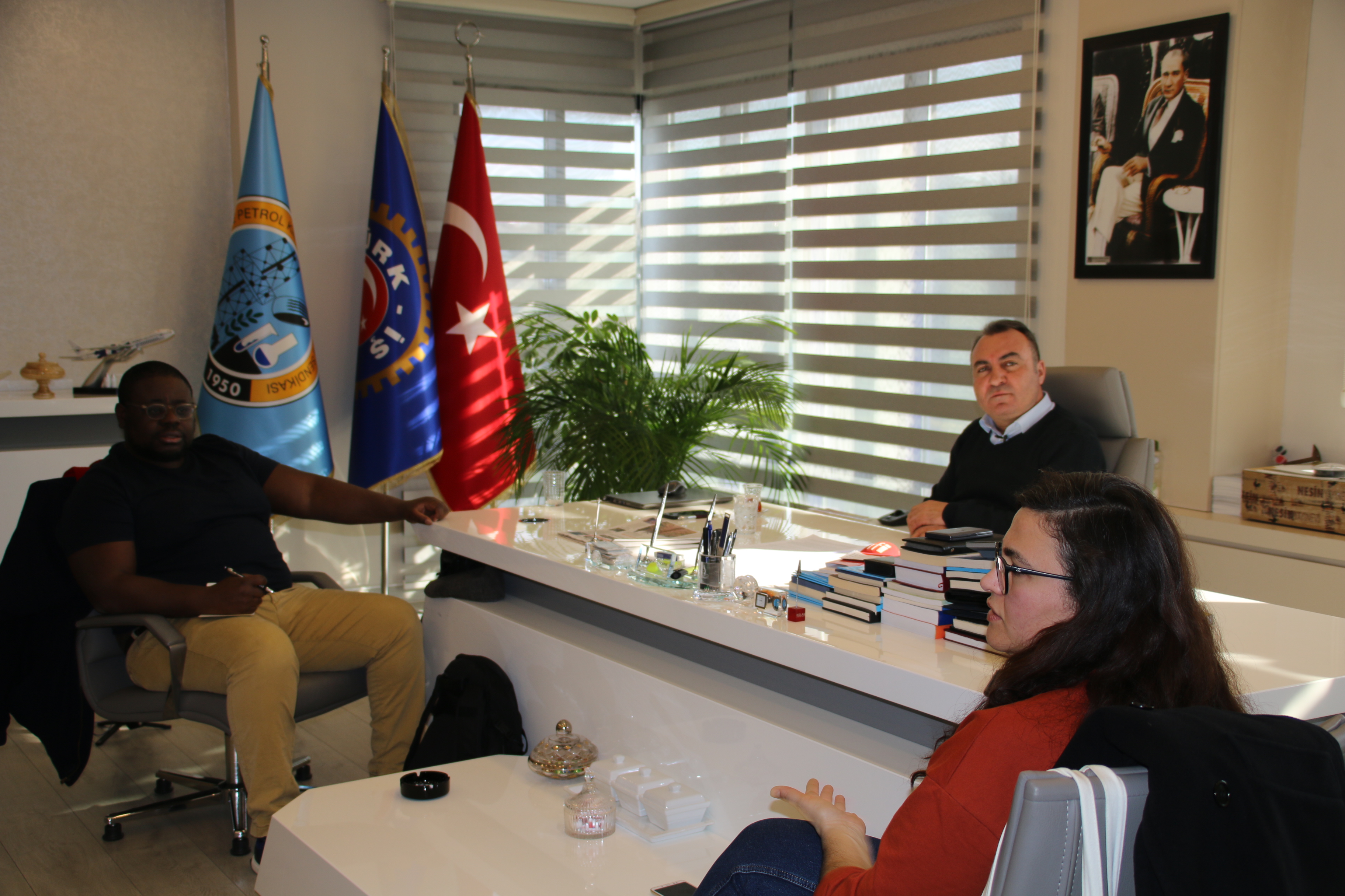 Fransa’dan gelen heyet, Türkiye’de bulunan Fransız gazeteci Alexandre Billette ile birlikte önce Petrol-İş Genel Merkezine geldiler. Burada Petrol-İş Sendikası Genel Mali Sekreteri Turgut Düşova ile Petrol-İş’in ;Yves Rocher/Flormar direnişi üzerine yaklaşık yarım saat süren bir röportaj yaptılar.