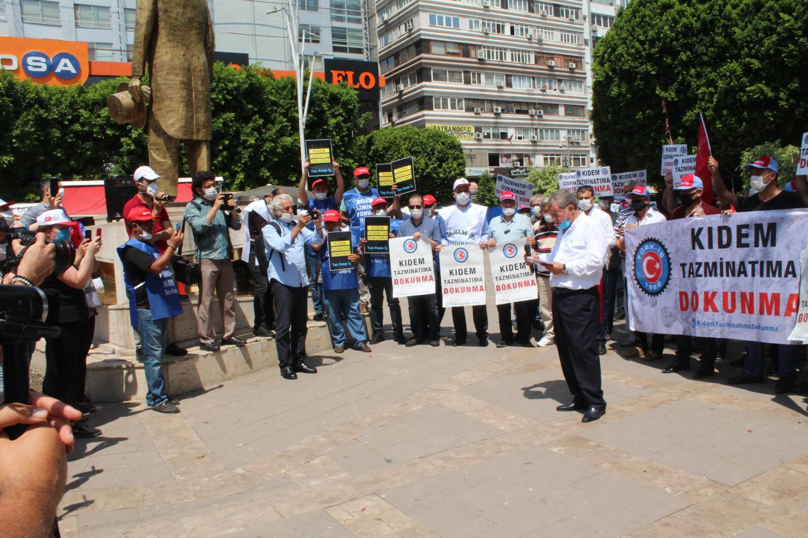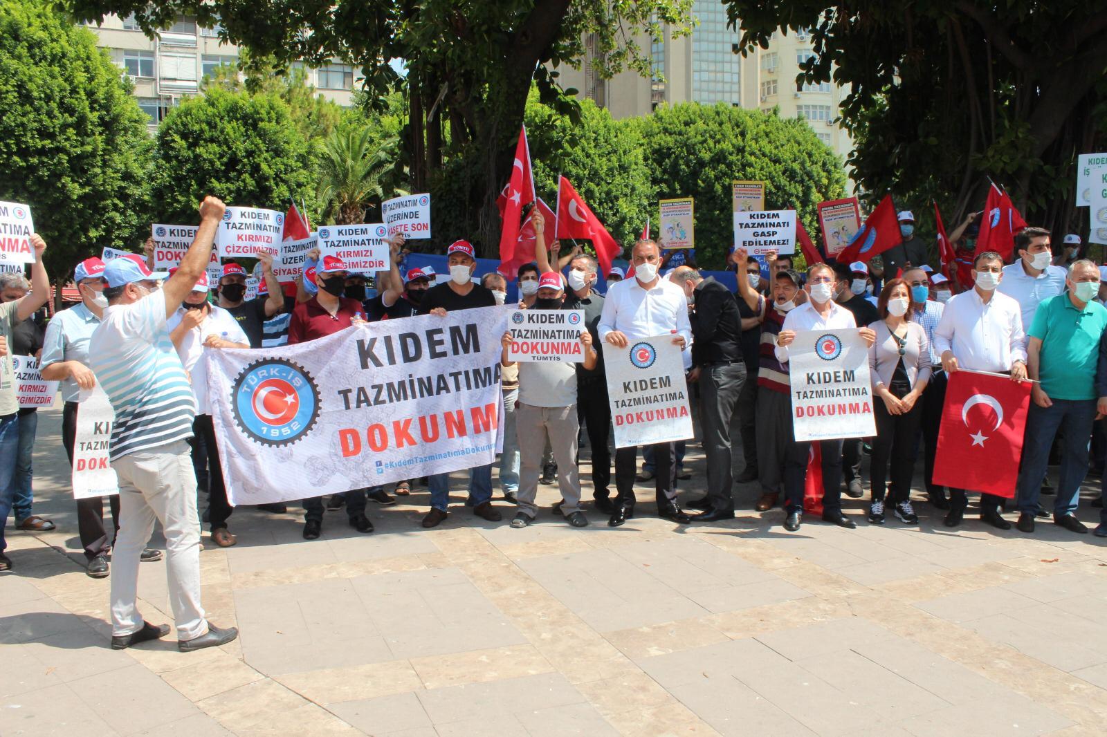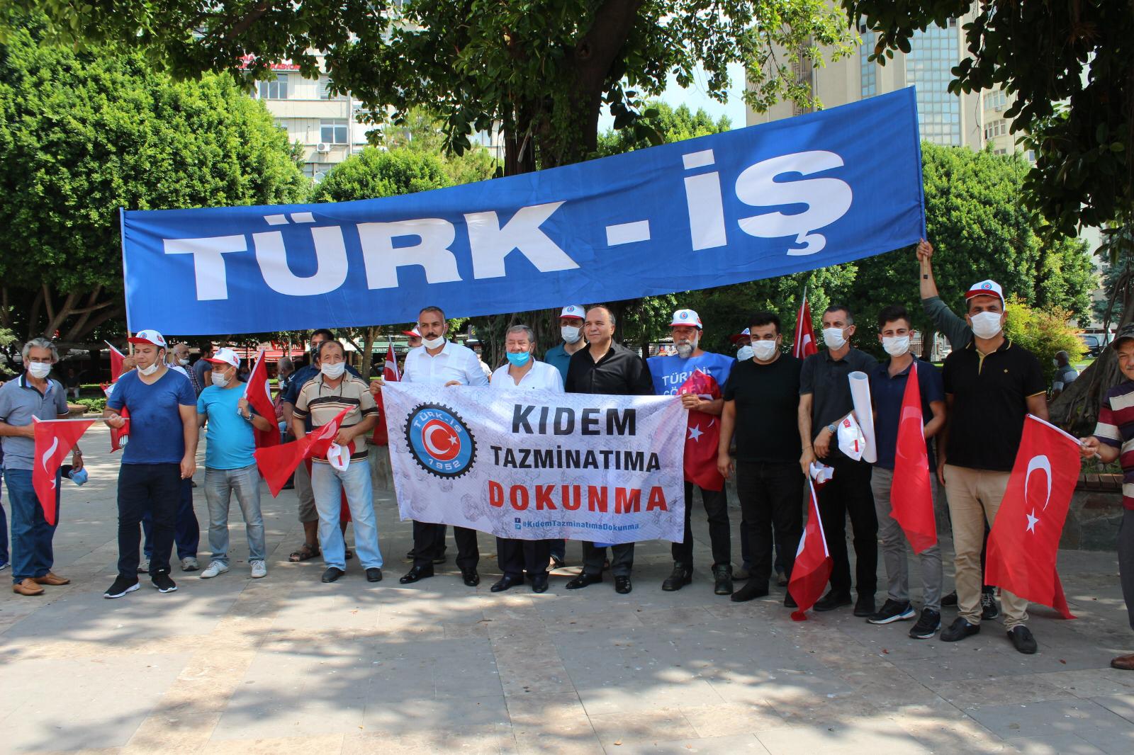 Adana Şubemiz de bugün saat 11.00’de yapılan basın açıklamasına katılarak kıdem tazminatı hakkına sahip çıktı. Basın açıklamasında bugün çalışanlar ve gelecekte çalışacaklar için kıdem tazminatının mevcut haliyle korunması talep edildi. Kıdem tazminatının Türkiye işçi sınıfı ve Türk-İş’in kırmızı çizgisi olduğu bir kez daha vurgulandı. Kıdem tazminatının fona devredilmesi, süresinin azaltılması, 25 yaş altı ve 50 yaş üstü çalışanlara belirli süreli iş sözleşmesi yaptırılması gibi, bu hakkın tasfiyesi ya da zayıflatılmasına yönelik her türlü girişimin karşısında olunacağı söylendi.