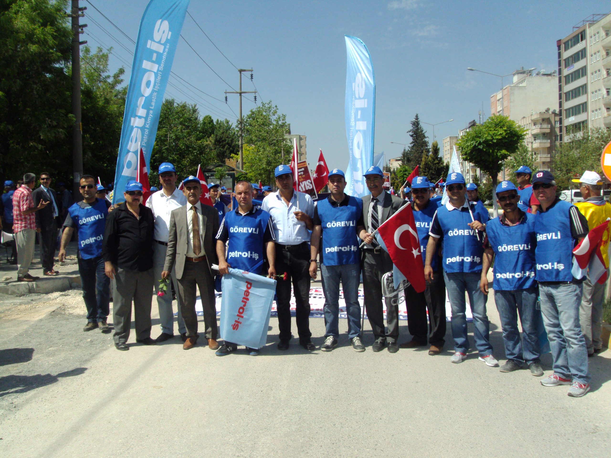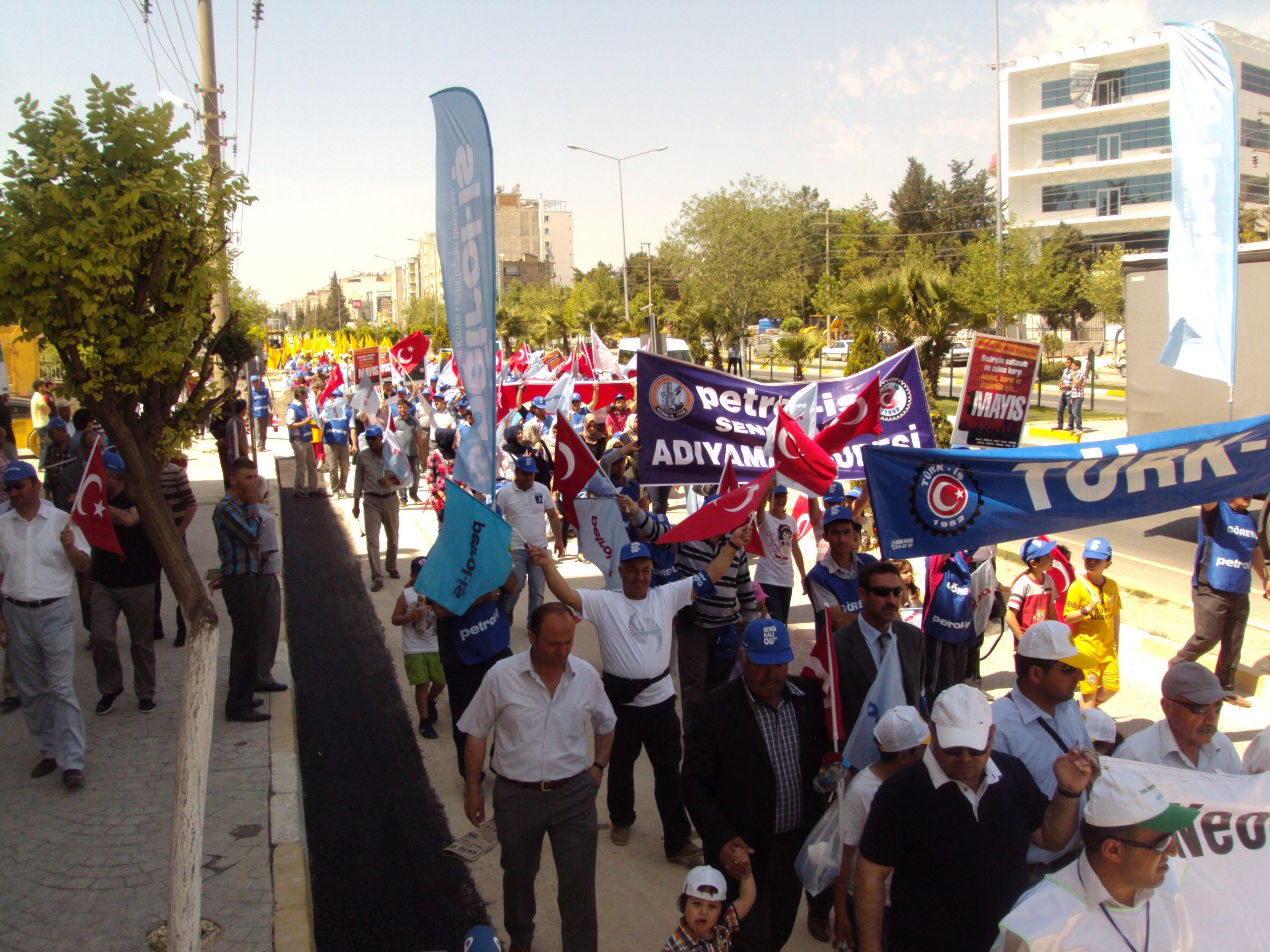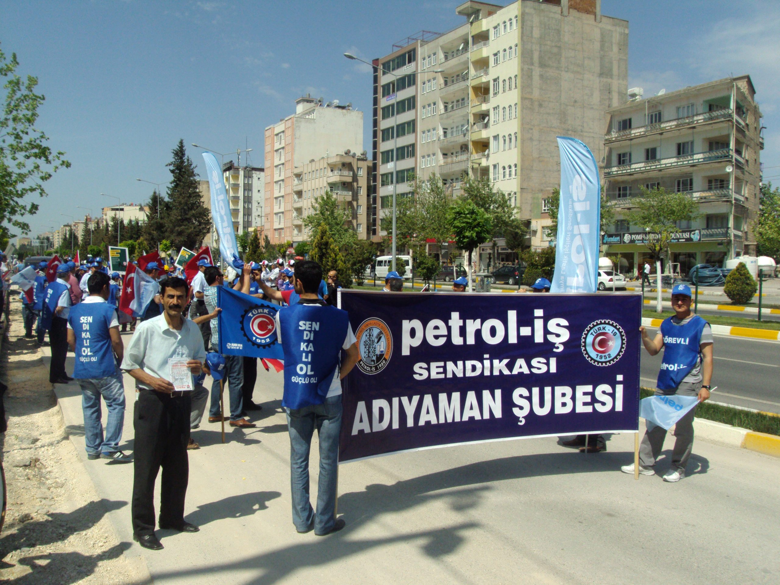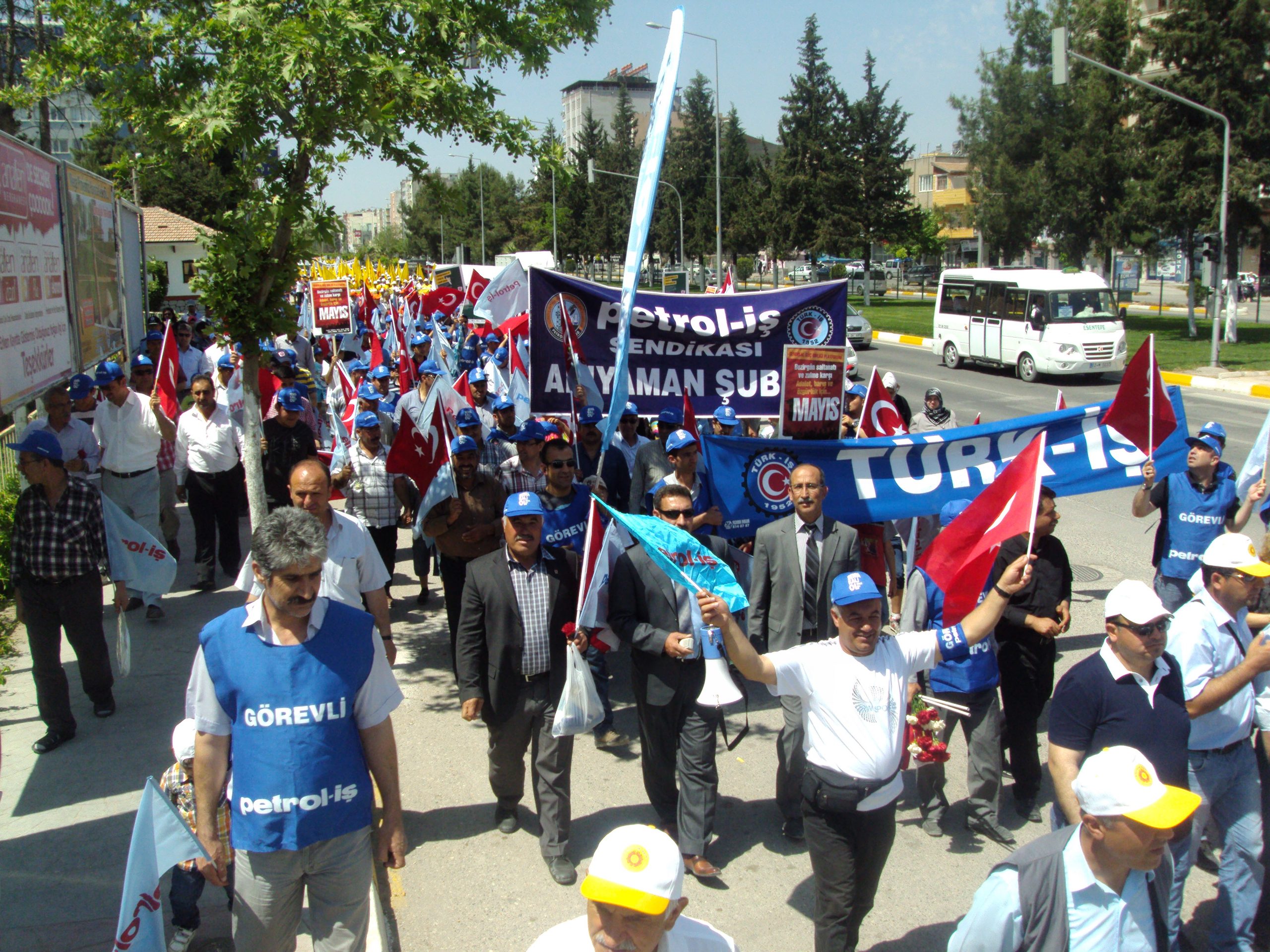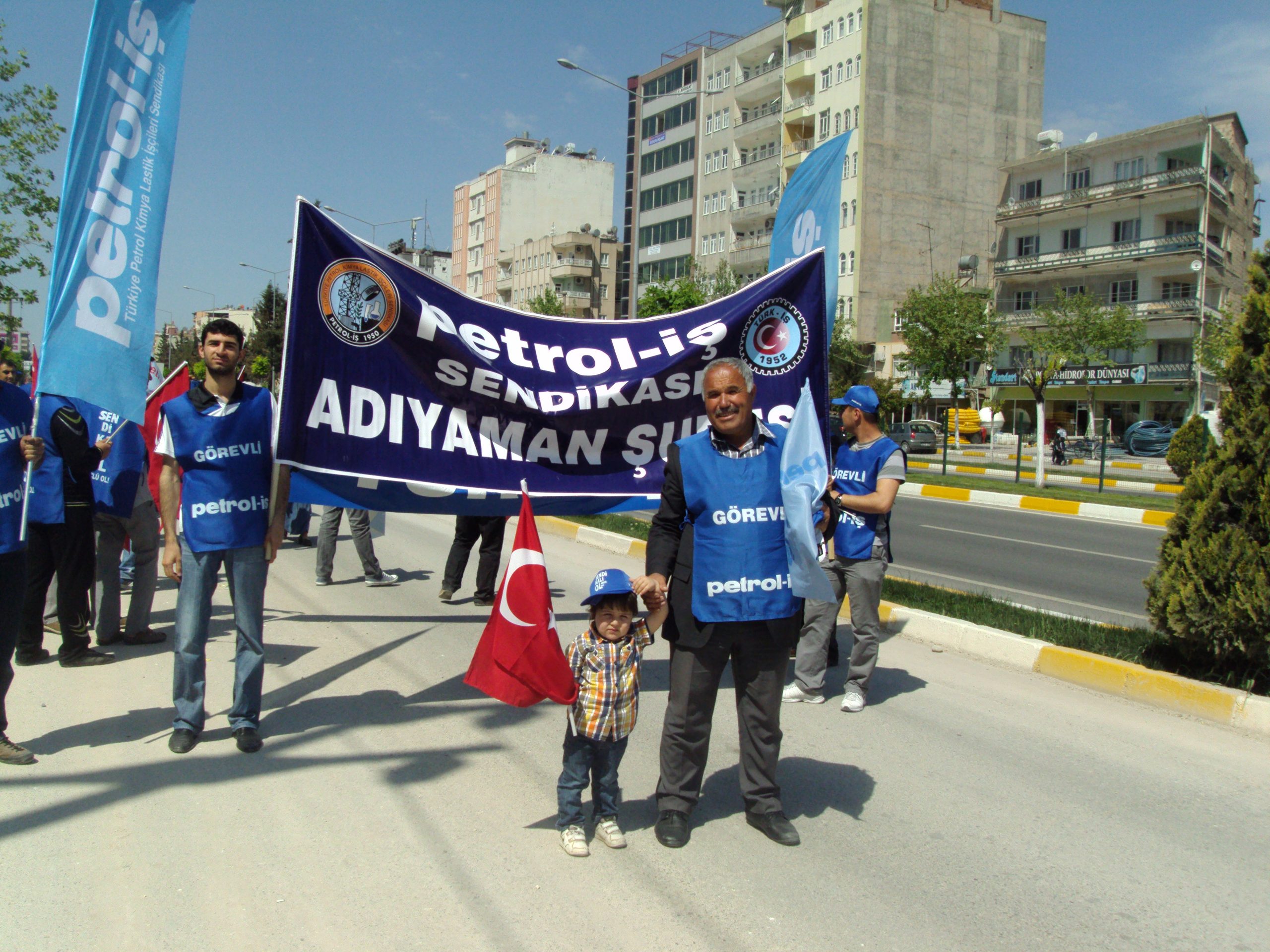 Bu meydanlara hakkı müdaafa günü olan 1 Mayıs’da  AVM şantiyelerinde yanan işçileri anmak için, barajlarda boğulan işçileri anmak için, sigortasız işçinin yetim çocuğunun gözyaşını silmek için, işçinin alınteri kurumadan ücretini verin buyuran yüce önderin mesajını iletmek için. Emeğin hesabını sormak için, alınterinin hesabını sormak için ekmeğini yediğimiz vatanın bayrağı ile 1 Mayıs işçi bayramına Adıyaman Petrol-İş Sendikası olarak katıldık.