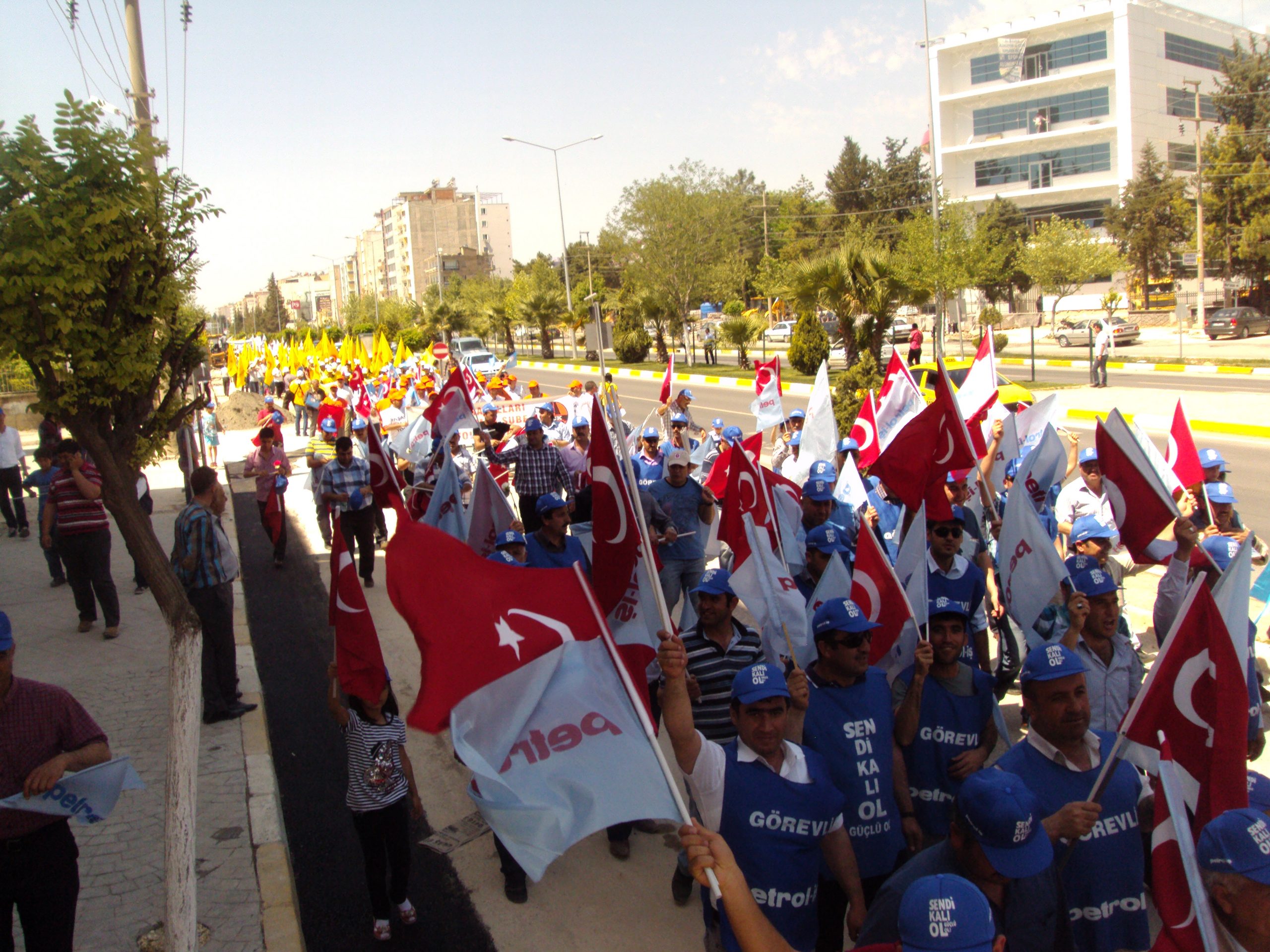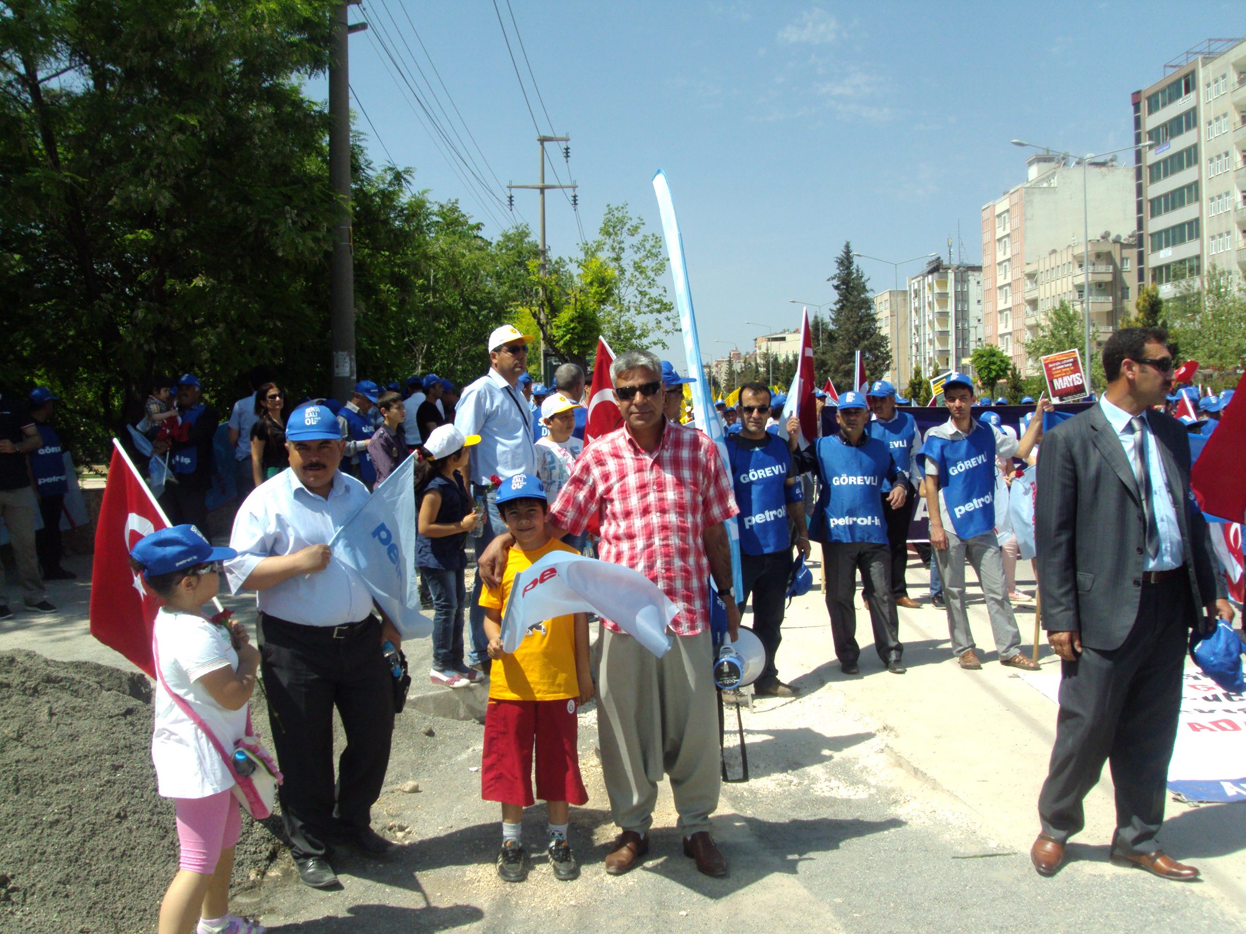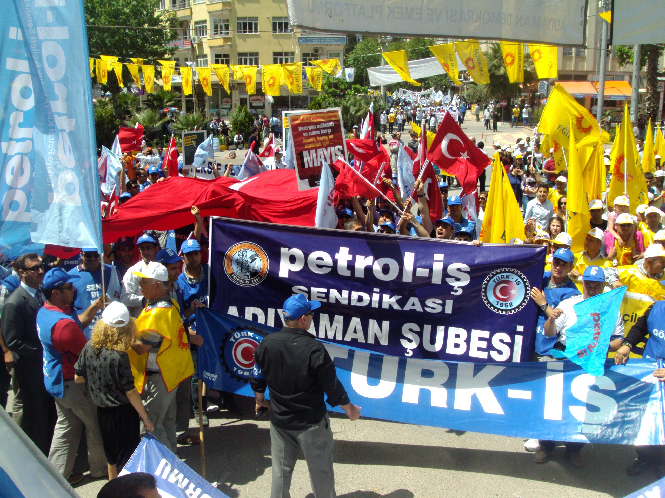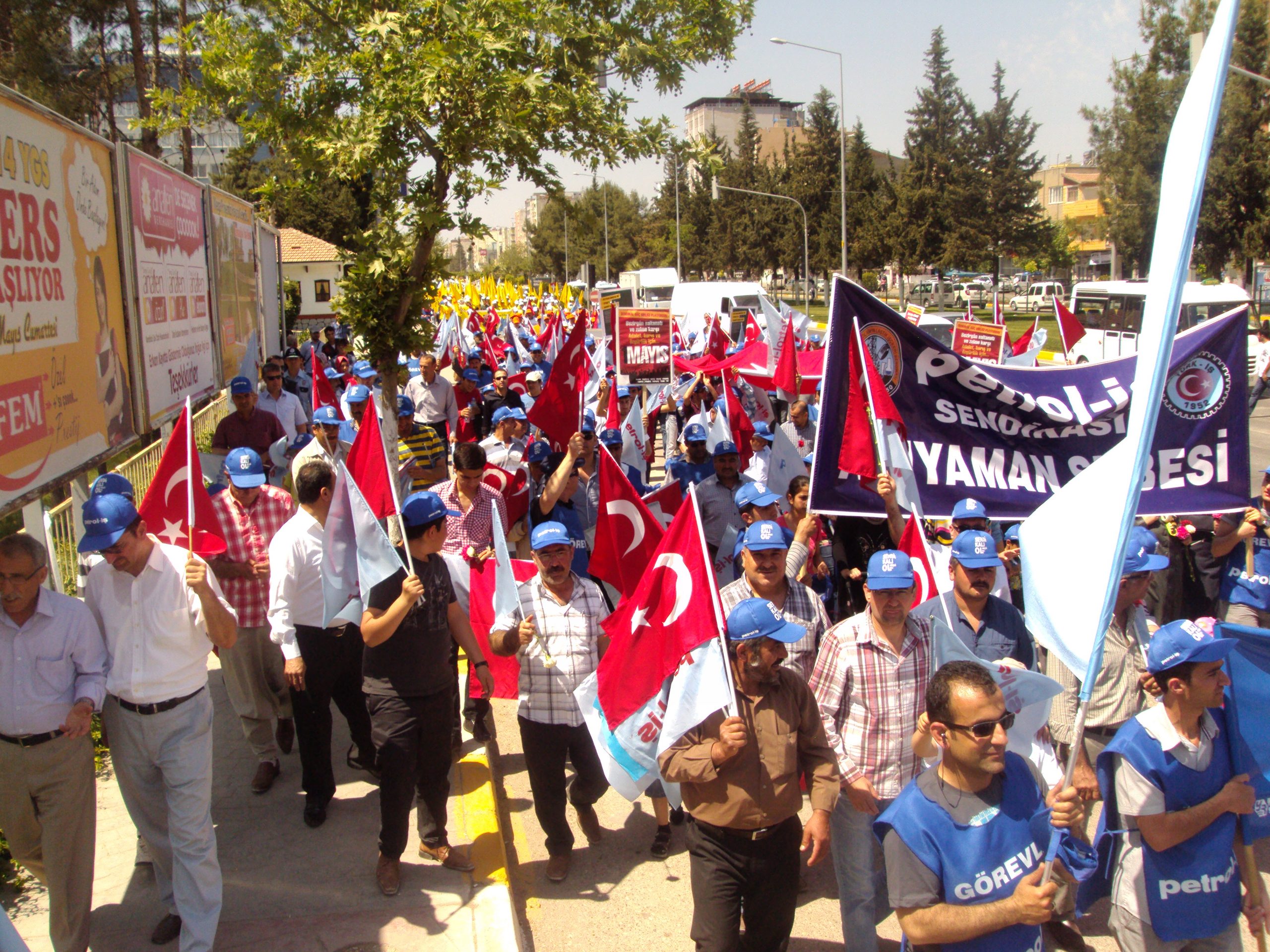 Bu meydanlara hakkı müdaafa günü olan 1 Mayıs’da  AVM şantiyelerinde yanan işçileri anmak için, barajlarda boğulan işçileri anmak için, sigortasız işçinin yetim çocuğunun gözyaşını silmek için, işçinin alınteri kurumadan ücretini verin buyuran yüce önderin mesajını iletmek için. Emeğin hesabını sormak için, alınterinin hesabını sormak için ekmeğini yediğimiz vatanın bayrağı ile 1 Mayıs işçi bayramına Adıyaman Petrol-İş Sendikası olarak katıldık.