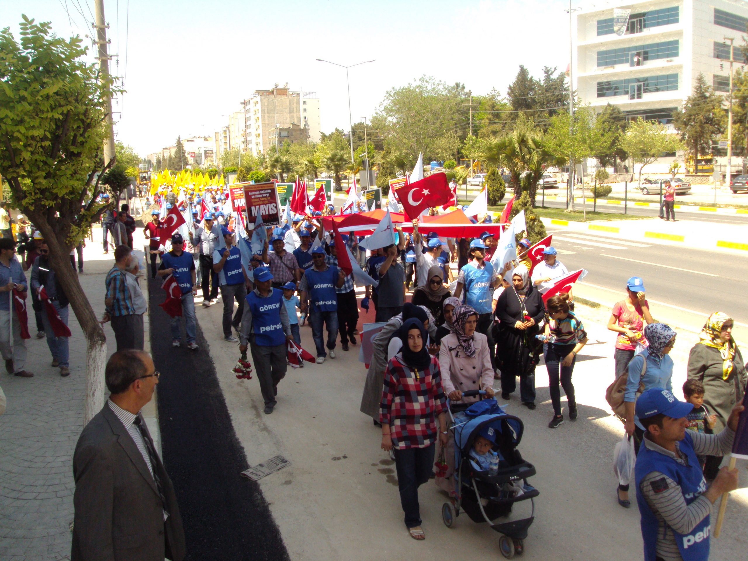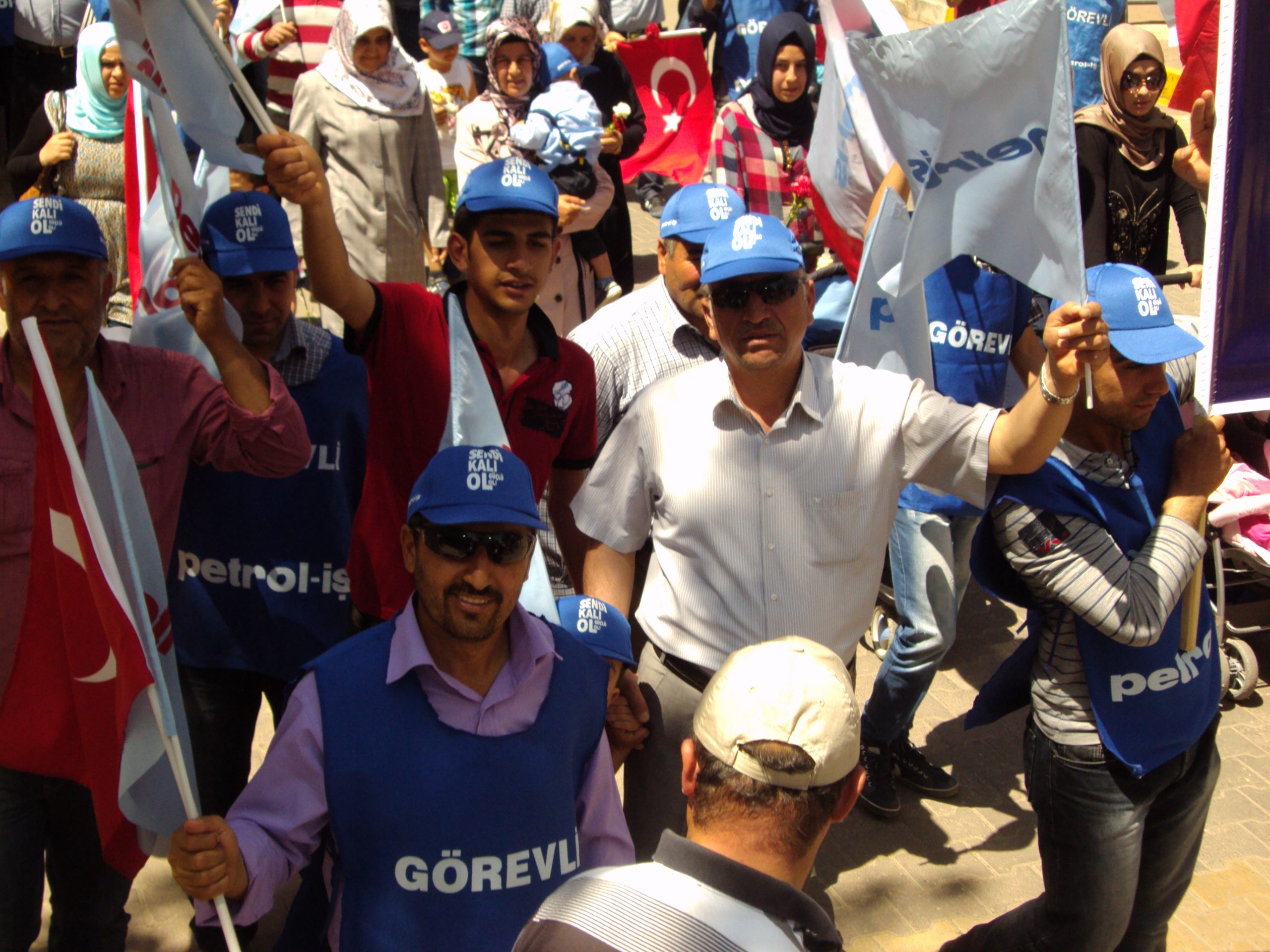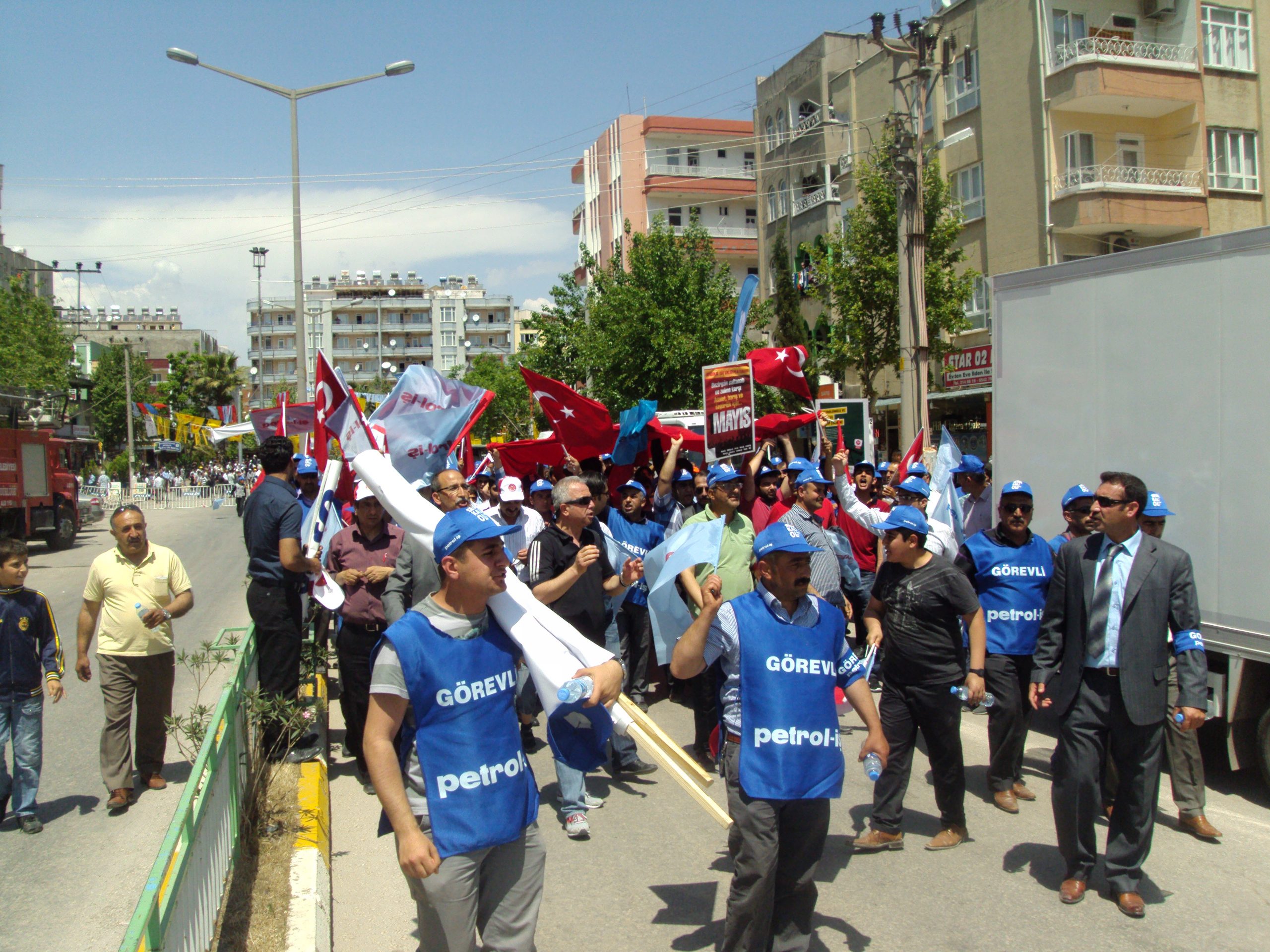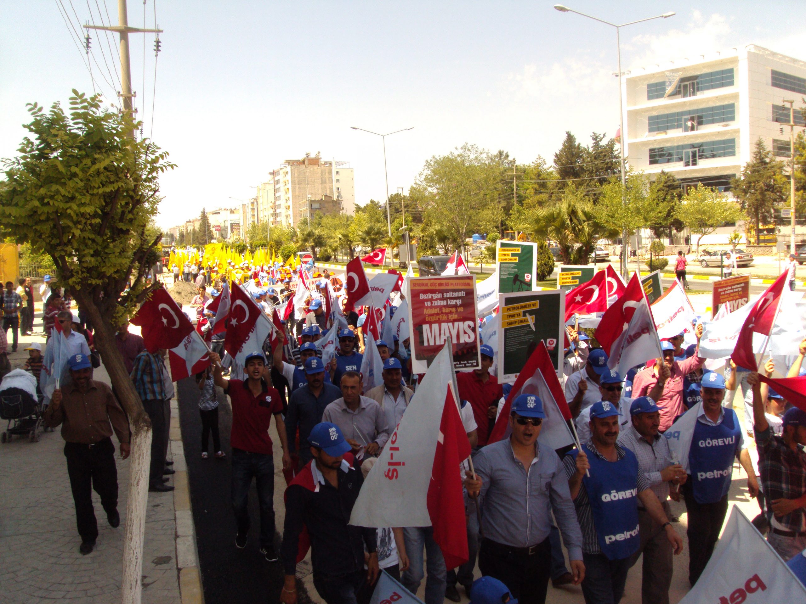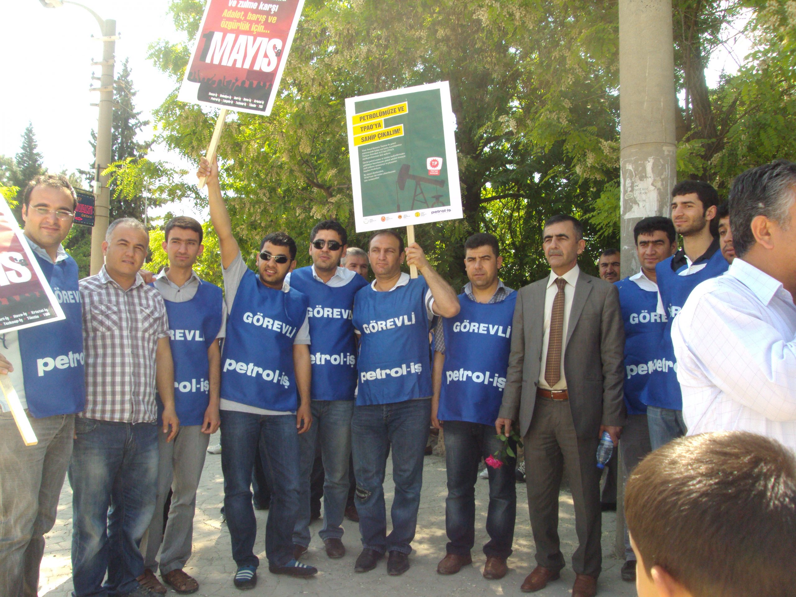 Bu meydanlara hakkı müdaafa günü olan 1 Mayıs’da  AVM şantiyelerinde yanan işçileri anmak için, barajlarda boğulan işçileri anmak için, sigortasız işçinin yetim çocuğunun gözyaşını silmek için, işçinin alınteri kurumadan ücretini verin buyuran yüce önderin mesajını iletmek için. Emeğin hesabını sormak için, alınterinin hesabını sormak için ekmeğini yediğimiz vatanın bayrağı ile 1 Mayıs işçi bayramına Adıyaman Petrol-İş Sendikası olarak katıldık.