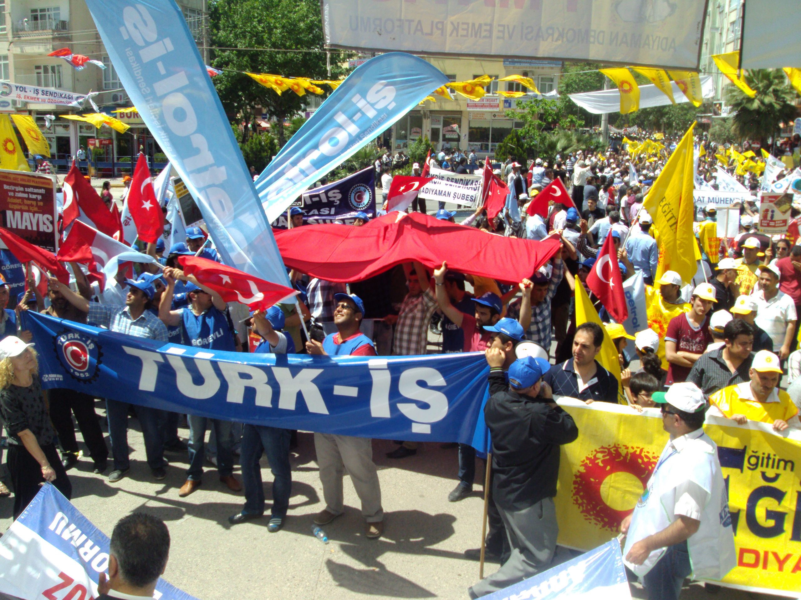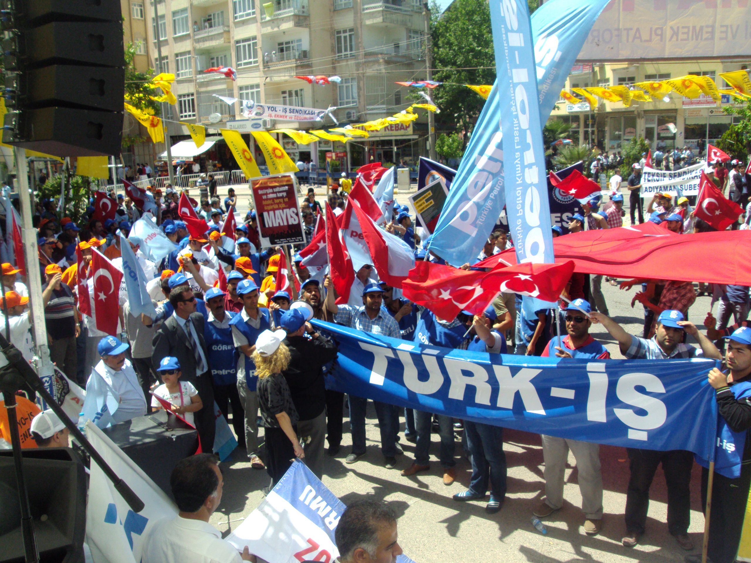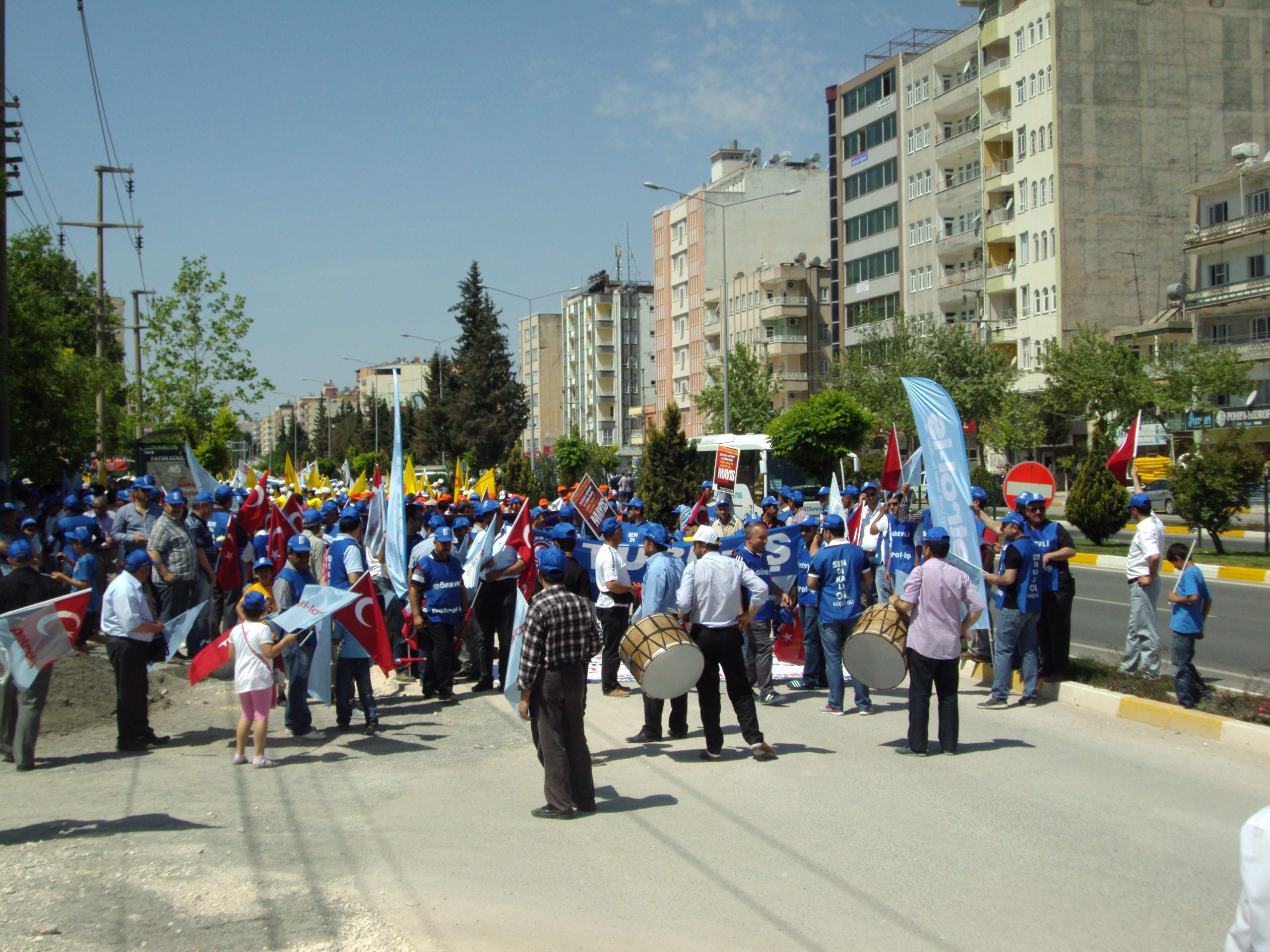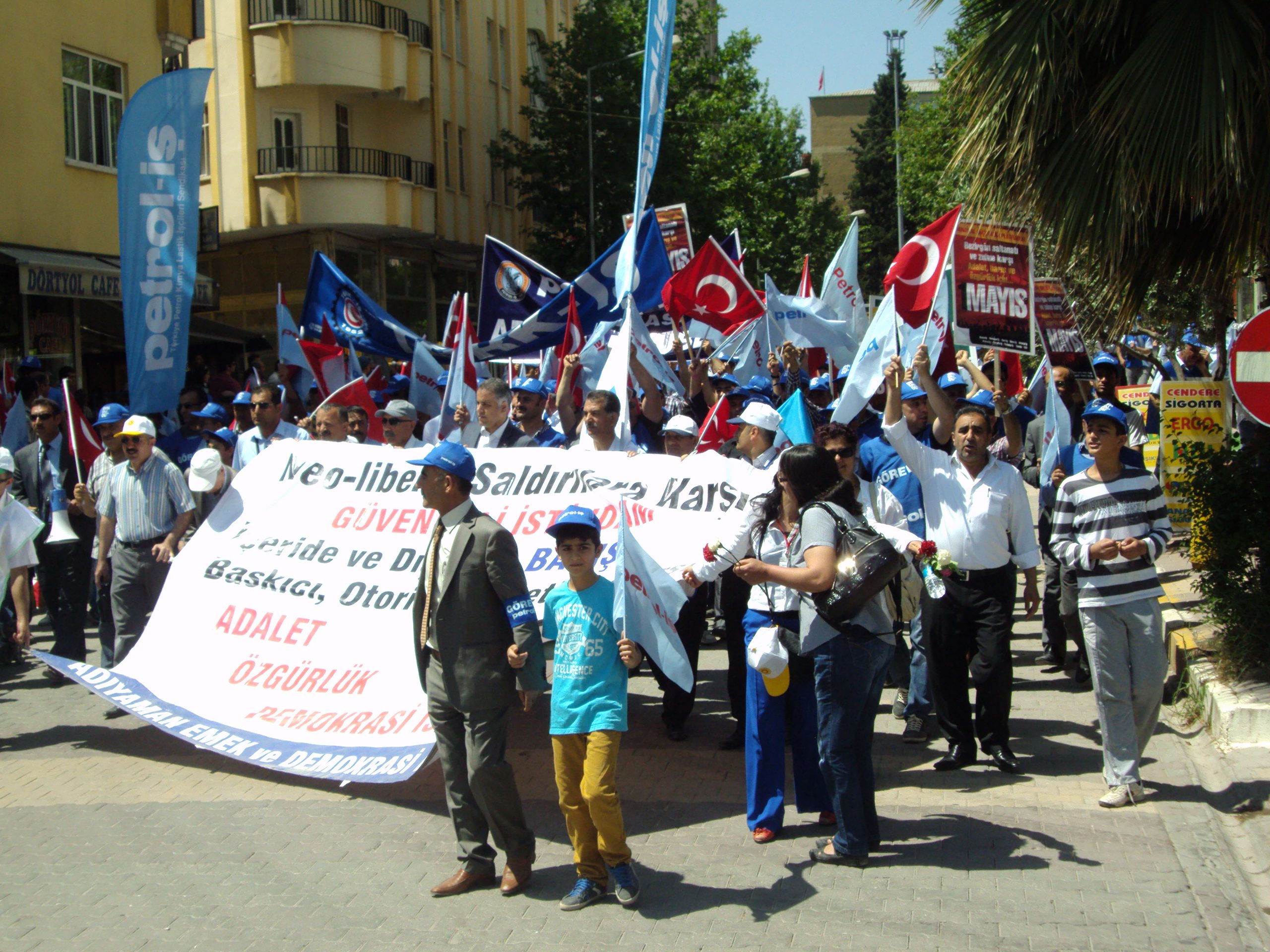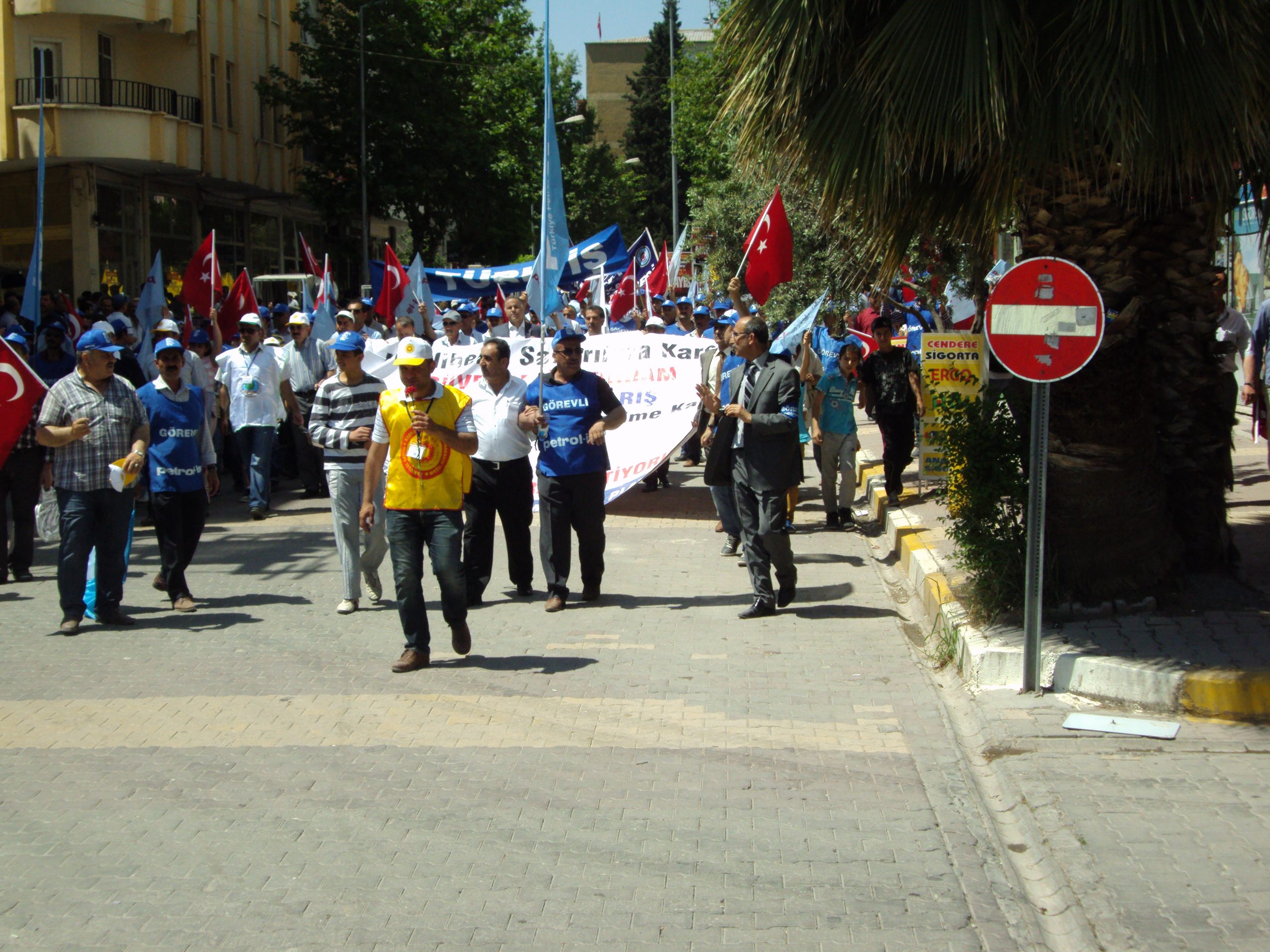 Bu meydanlara hakkı müdaafa günü olan 1 Mayıs’da  AVM şantiyelerinde yanan işçileri anmak için, barajlarda boğulan işçileri anmak için, sigortasız işçinin yetim çocuğunun gözyaşını silmek için, işçinin alınteri kurumadan ücretini verin buyuran yüce önderin mesajını iletmek için. Emeğin hesabını sormak için, alınterinin hesabını sormak için ekmeğini yediğimiz vatanın bayrağı ile 1 Mayıs işçi bayramına Adıyaman Petrol-İş Sendikası olarak katıldık.