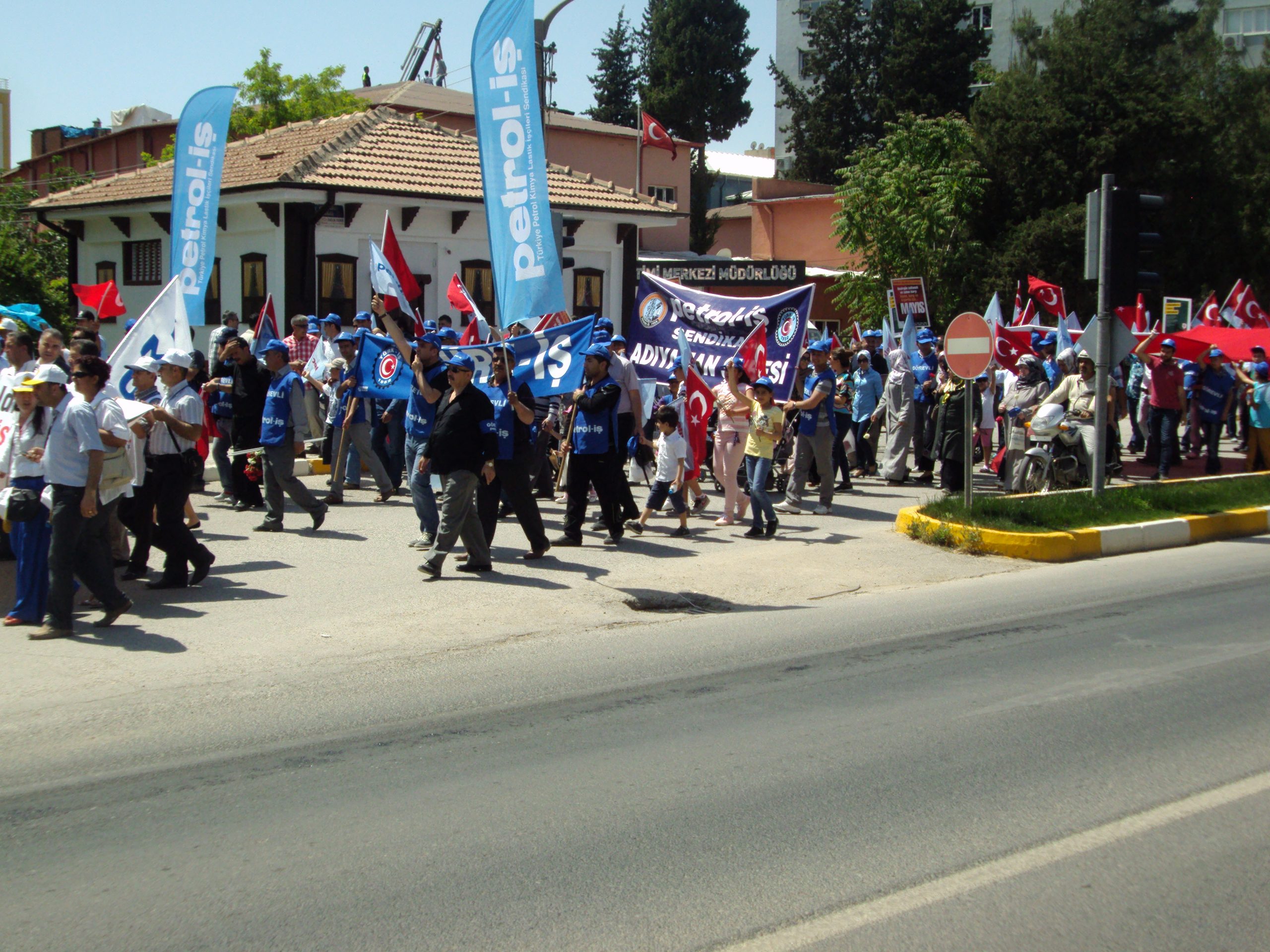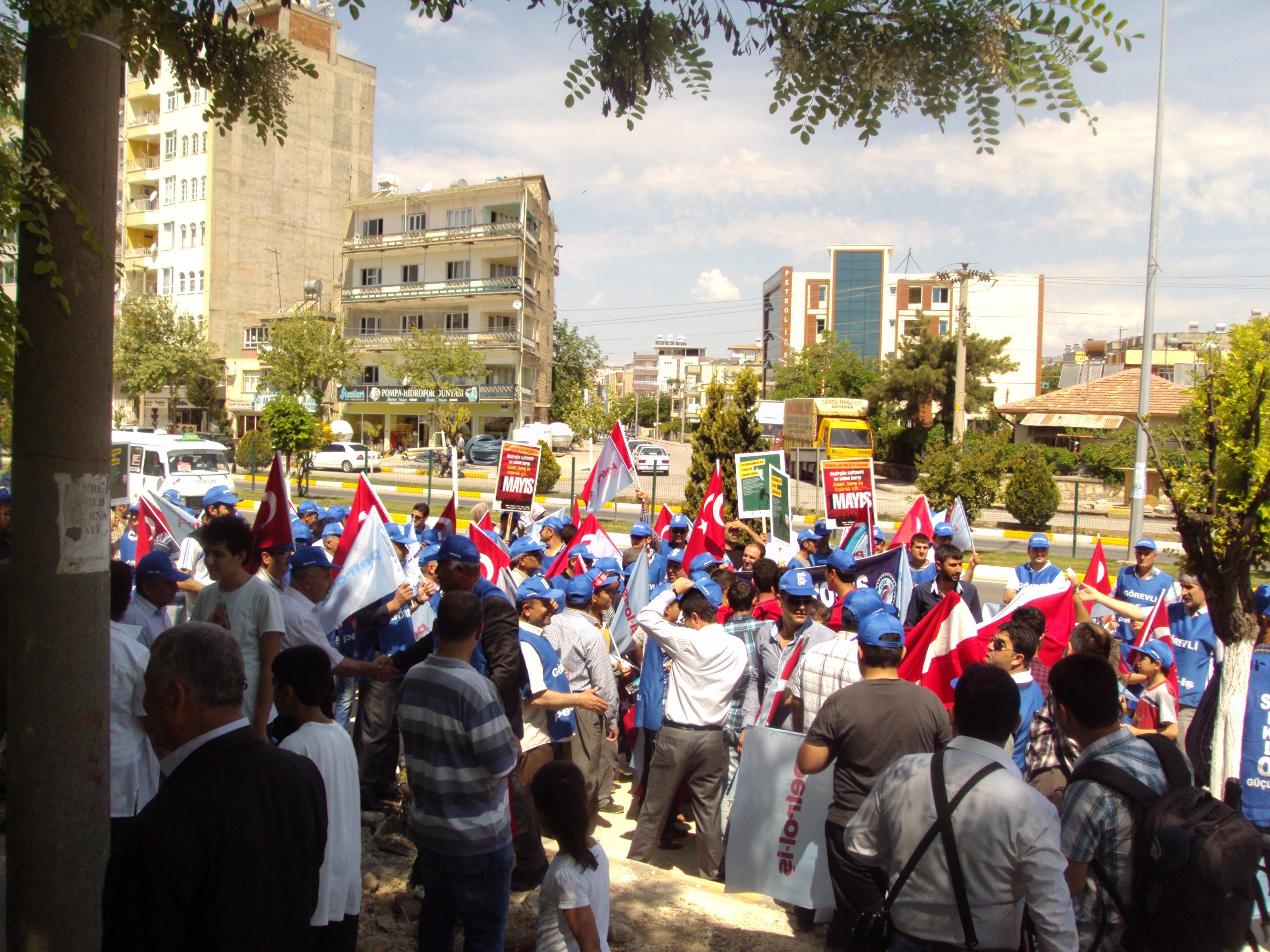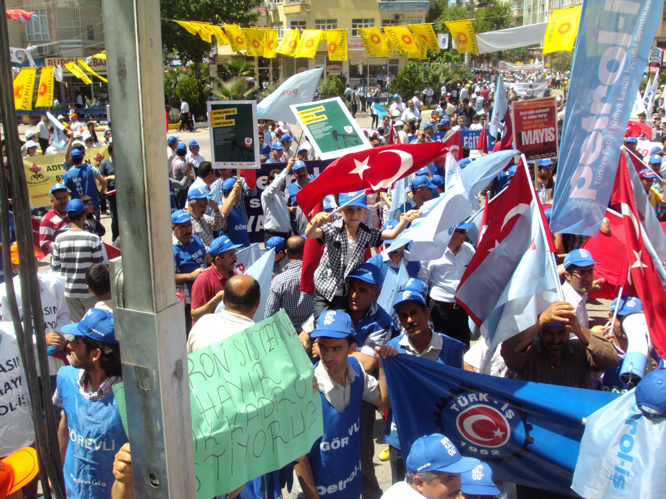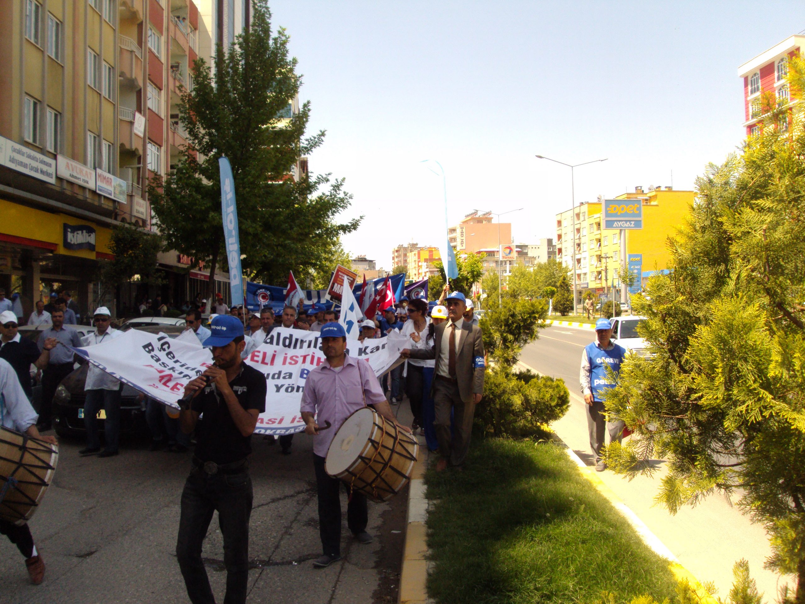 Bu meydanlara hakkı müdaafa günü olan 1 Mayıs’da  AVM şantiyelerinde yanan işçileri anmak için, barajlarda boğulan işçileri anmak için, sigortasız işçinin yetim çocuğunun gözyaşını silmek için, işçinin alınteri kurumadan ücretini verin buyuran yüce önderin mesajını iletmek için. Emeğin hesabını sormak için, alınterinin hesabını sormak için ekmeğini yediğimiz vatanın bayrağı ile 1 Mayıs işçi bayramına Adıyaman Petrol-İş Sendikası olarak katıldık.