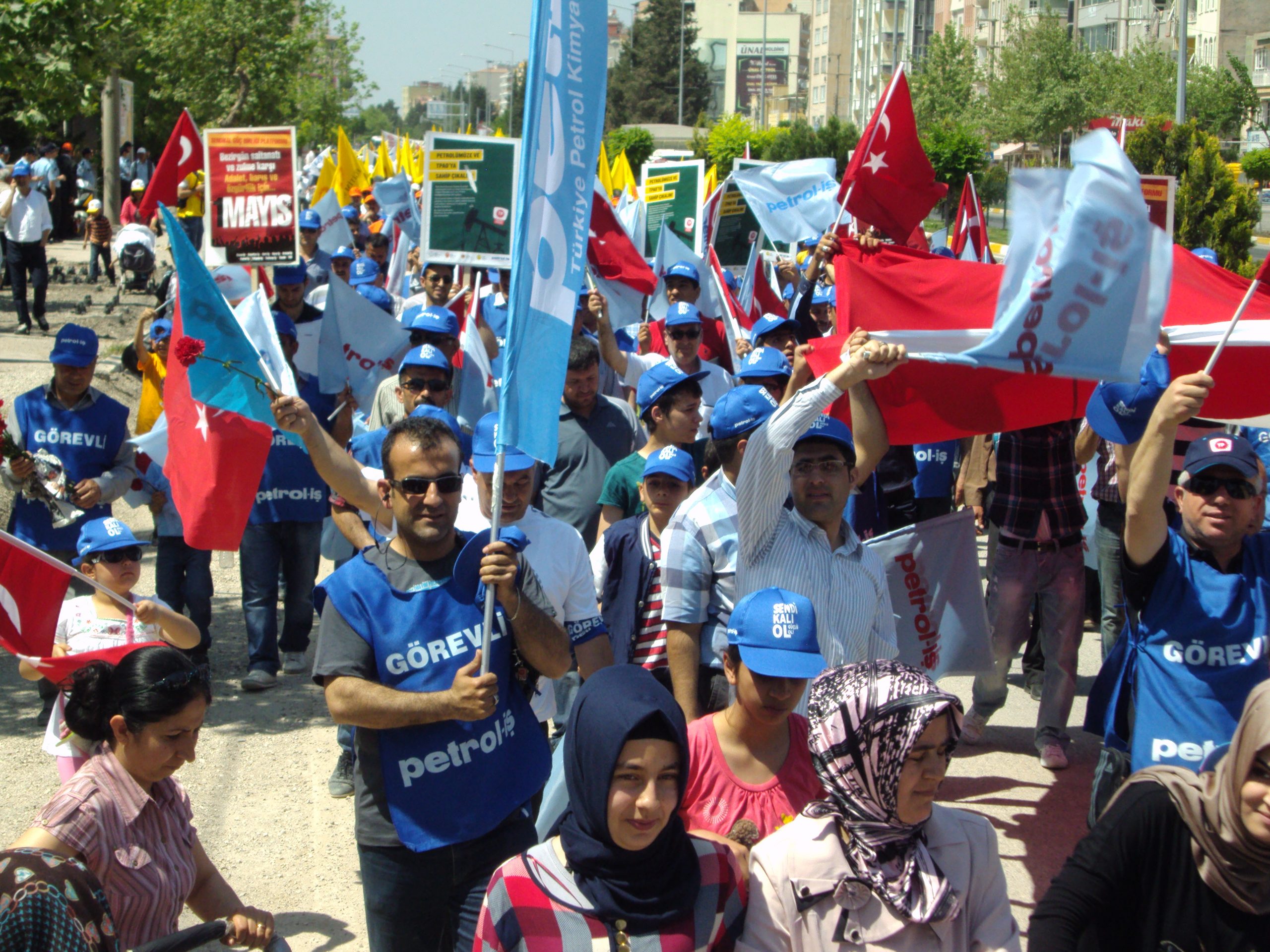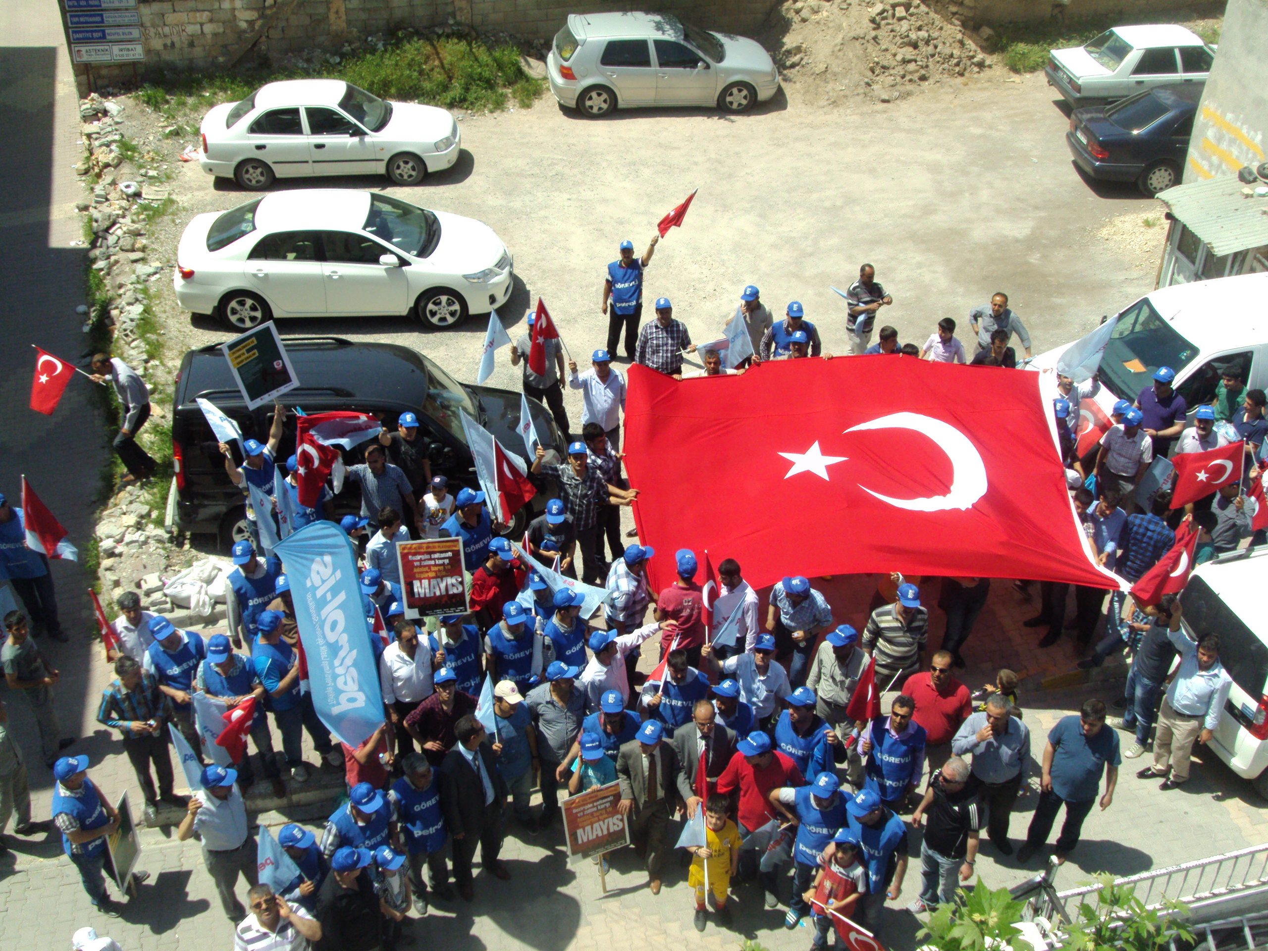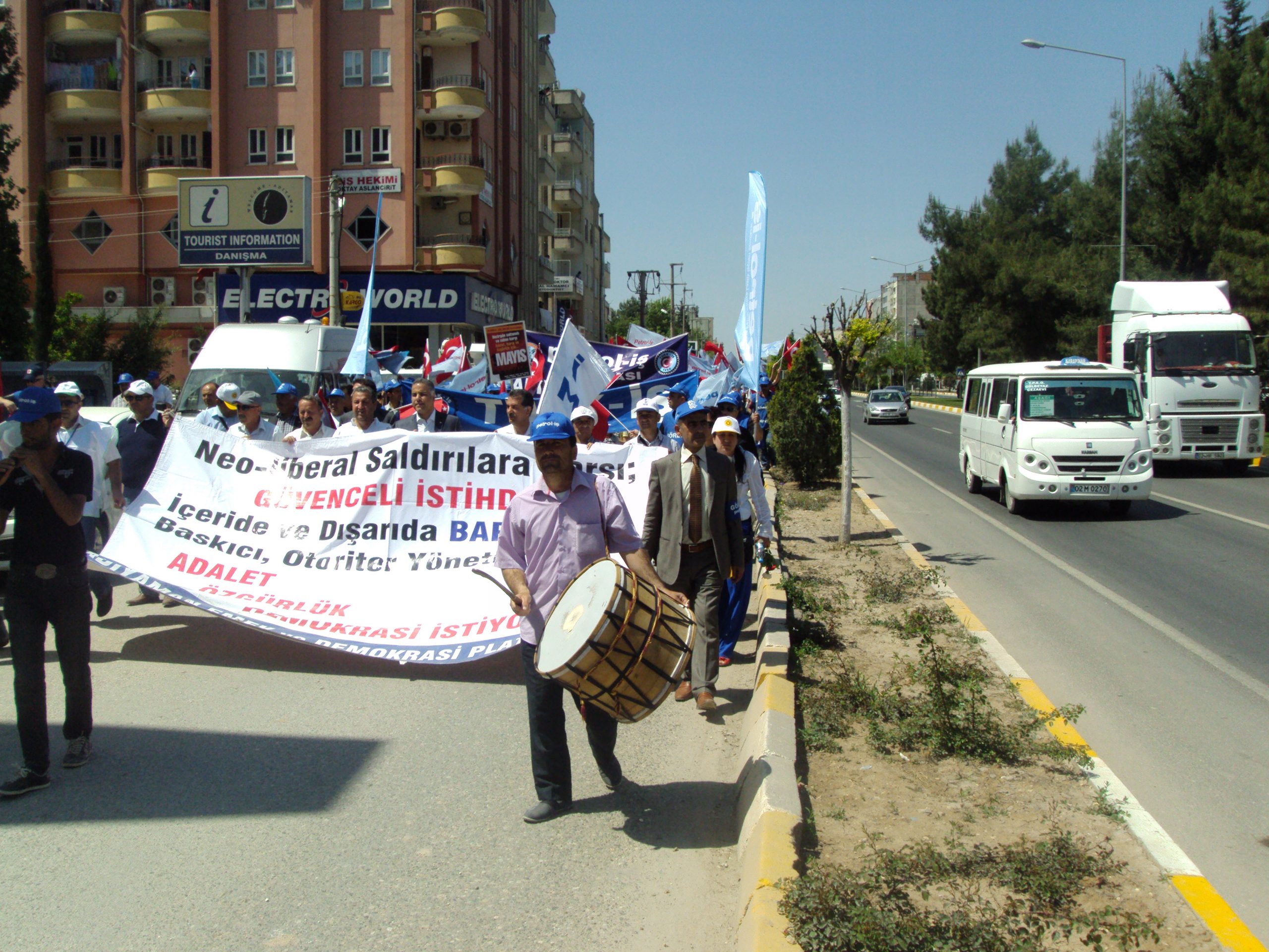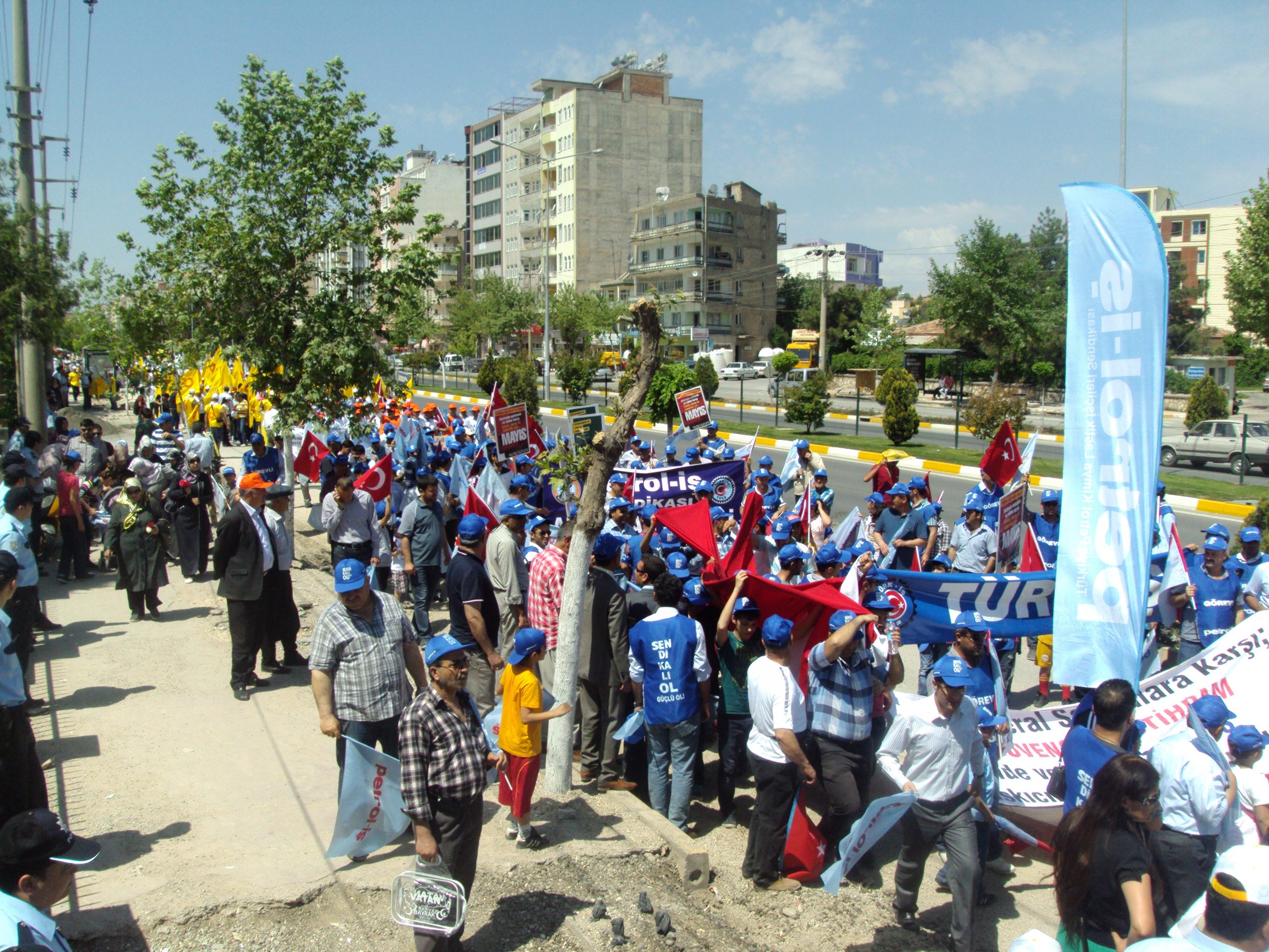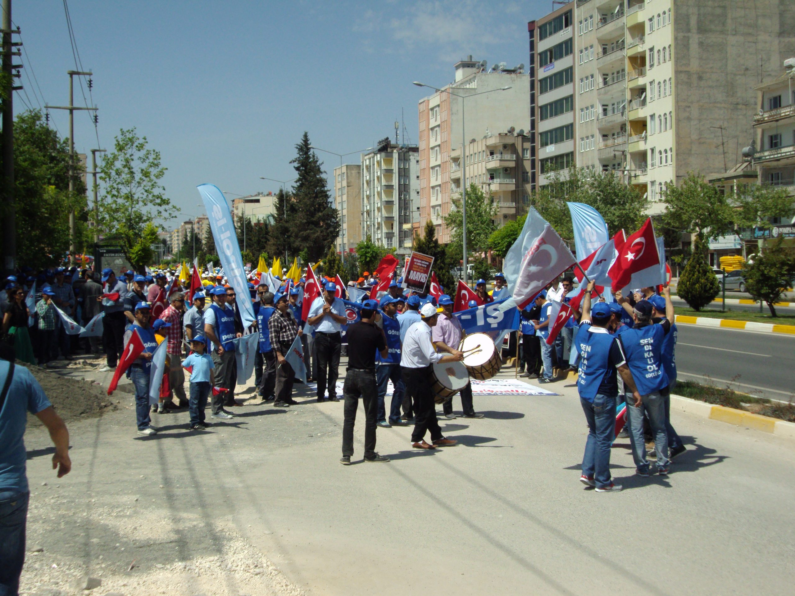 Bu meydanlara hakkı müdaafa günü olan 1 Mayıs’da  AVM şantiyelerinde yanan işçileri anmak için, barajlarda boğulan işçileri anmak için, sigortasız işçinin yetim çocuğunun gözyaşını silmek için, işçinin alınteri kurumadan ücretini verin buyuran yüce önderin mesajını iletmek için. Emeğin hesabını sormak için, alınterinin hesabını sormak için ekmeğini yediğimiz vatanın bayrağı ile 1 Mayıs işçi bayramına Adıyaman Petrol-İş Sendikası olarak katıldık.