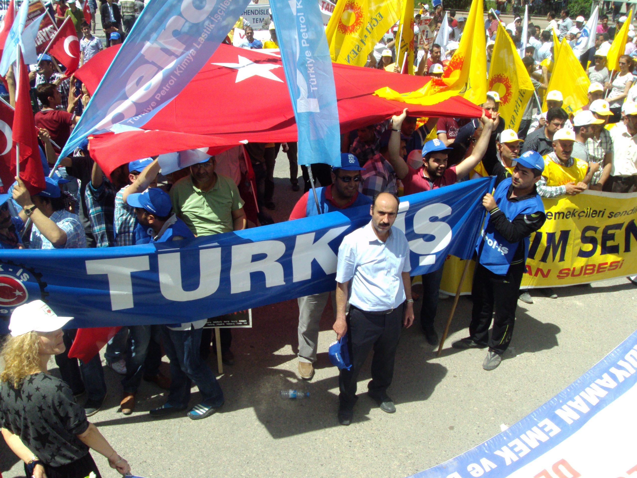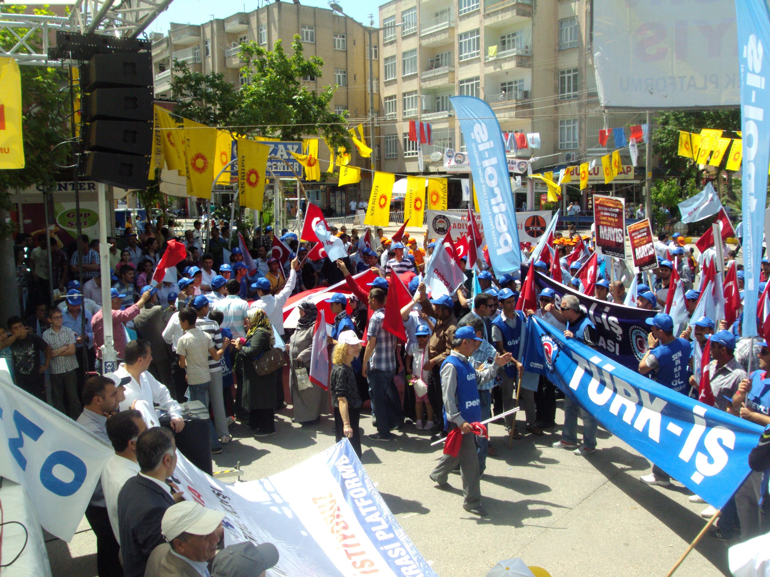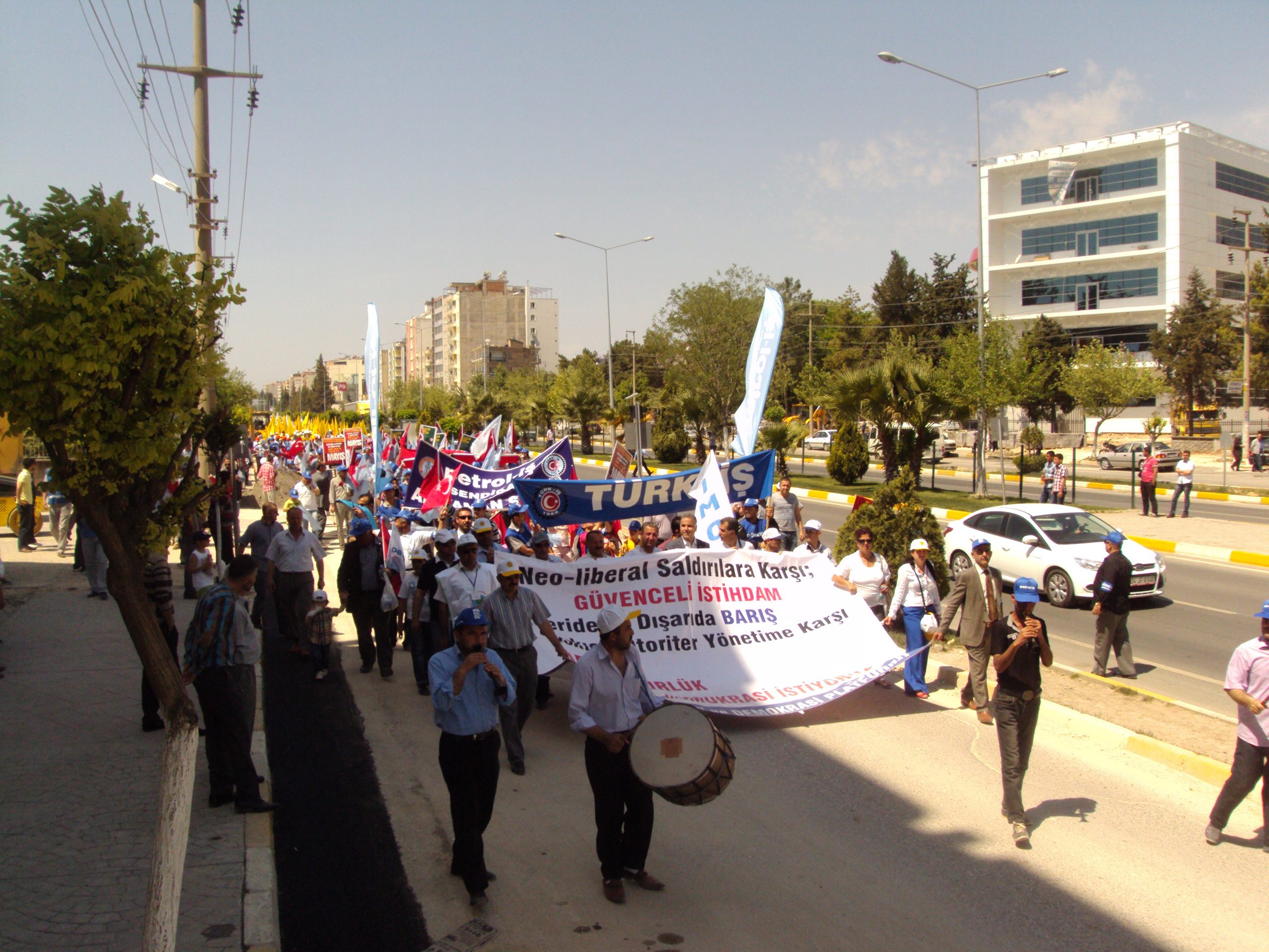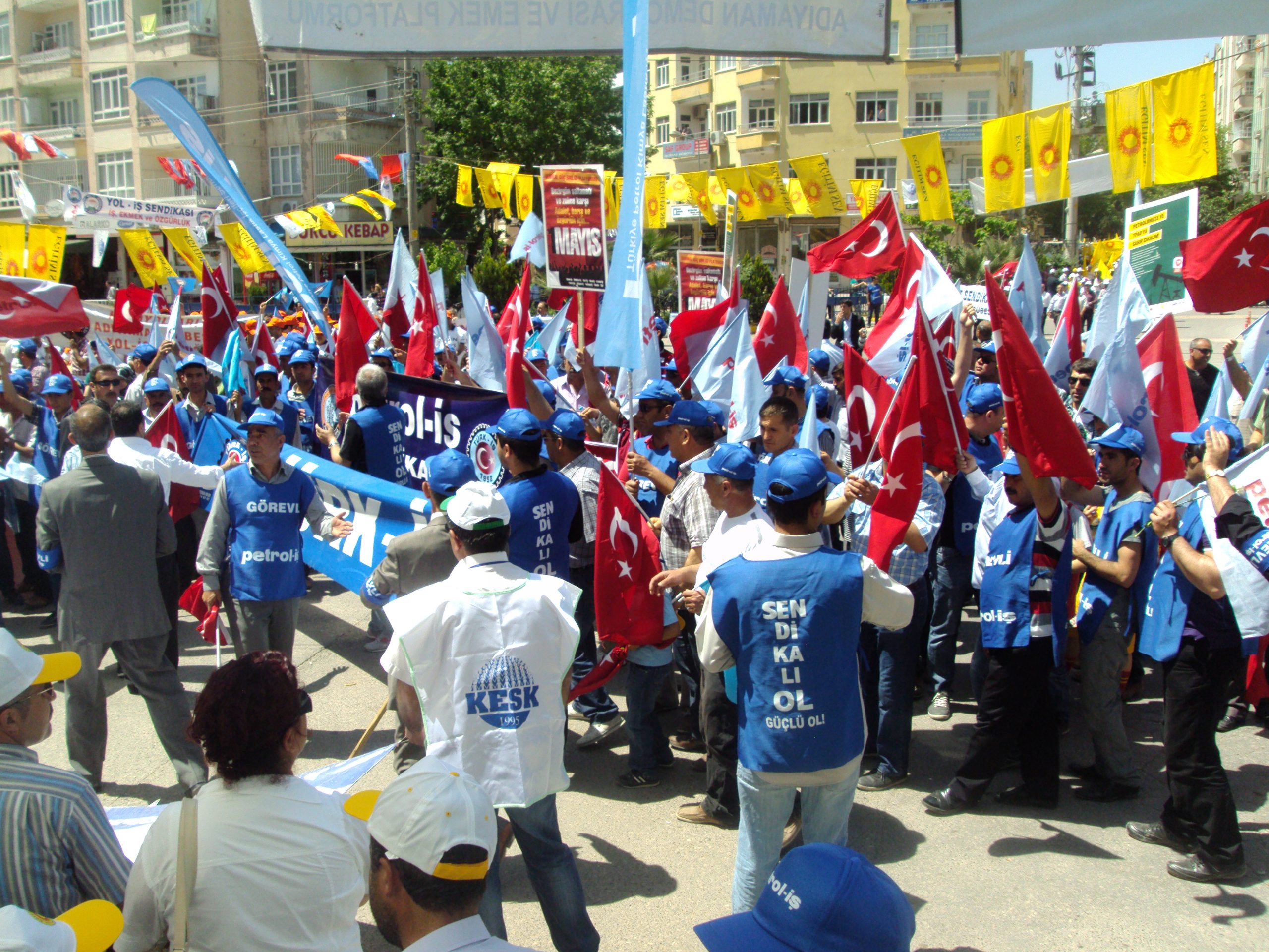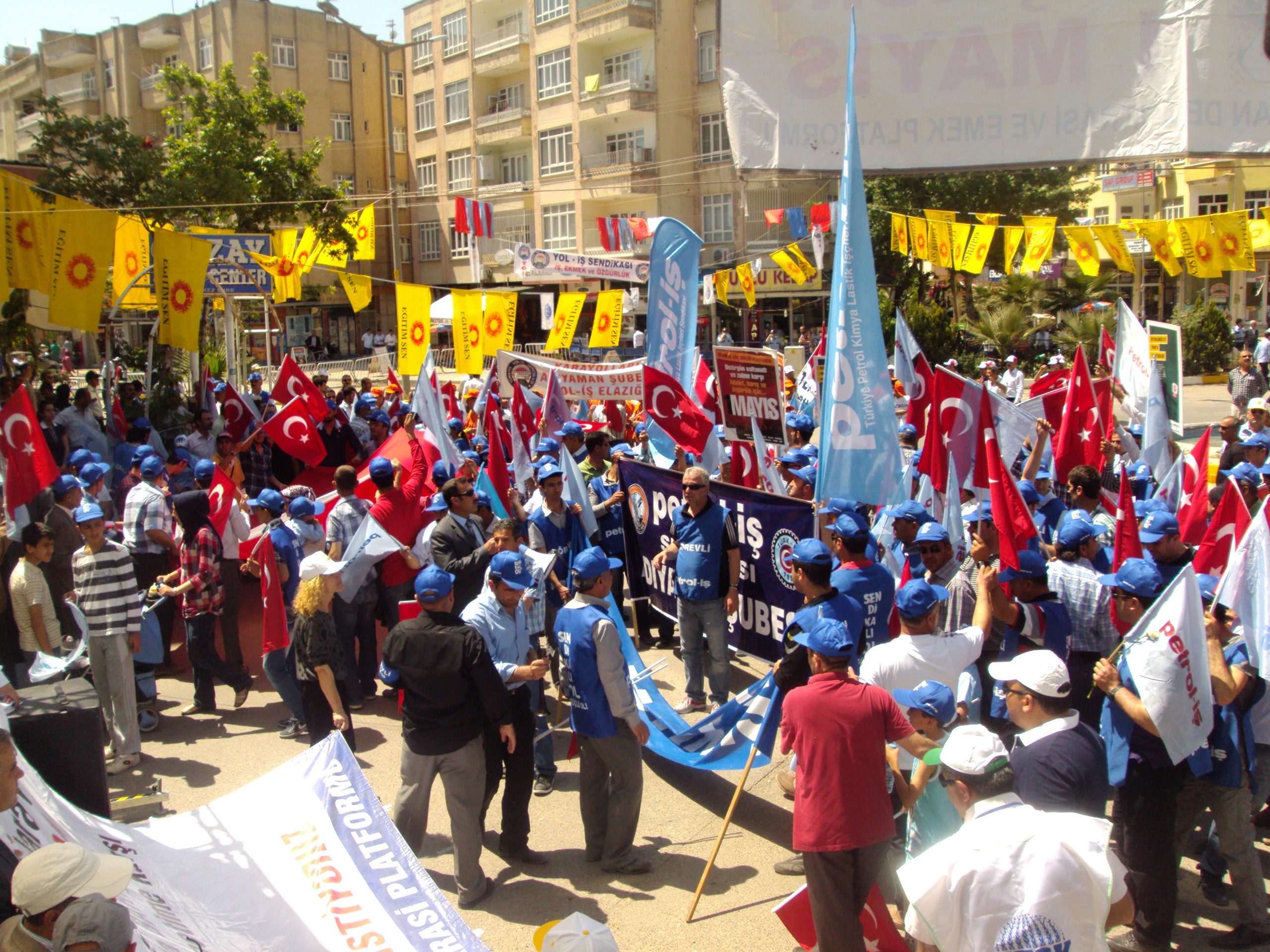 Bu meydanlara hakkı müdaafa günü olan 1 Mayıs’da  AVM şantiyelerinde yanan işçileri anmak için, barajlarda boğulan işçileri anmak için, sigortasız işçinin yetim çocuğunun gözyaşını silmek için, işçinin alınteri kurumadan ücretini verin buyuran yüce önderin mesajını iletmek için. Emeğin hesabını sormak için, alınterinin hesabını sormak için ekmeğini yediğimiz vatanın bayrağı ile 1 Mayıs işçi bayramına Adıyaman Petrol-İş Sendikası olarak katıldık.