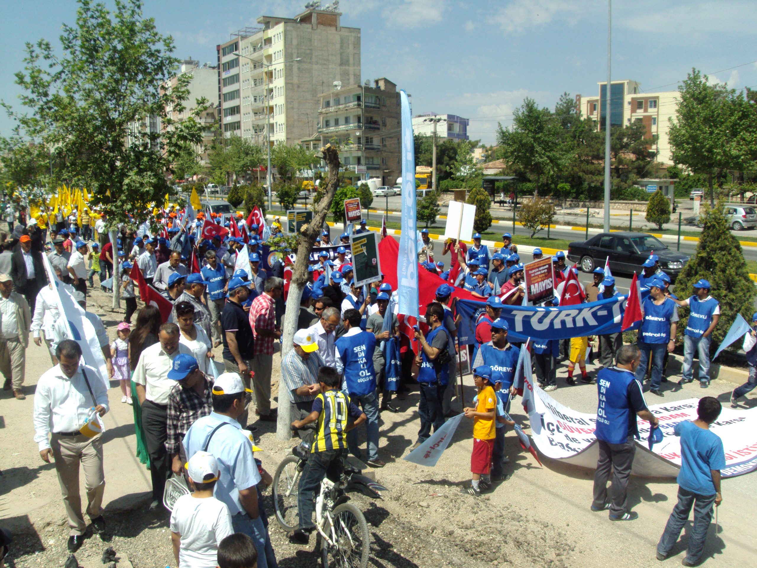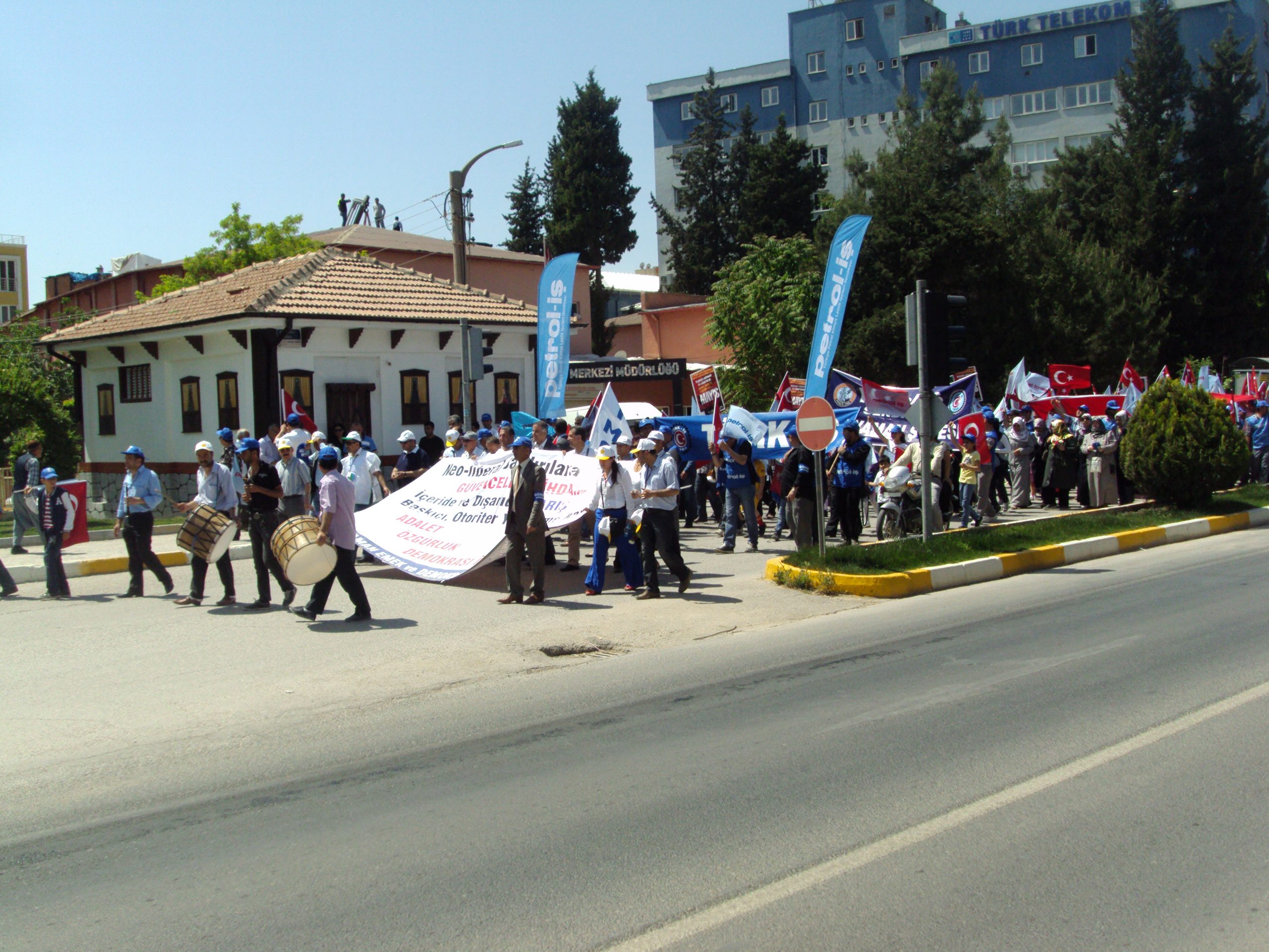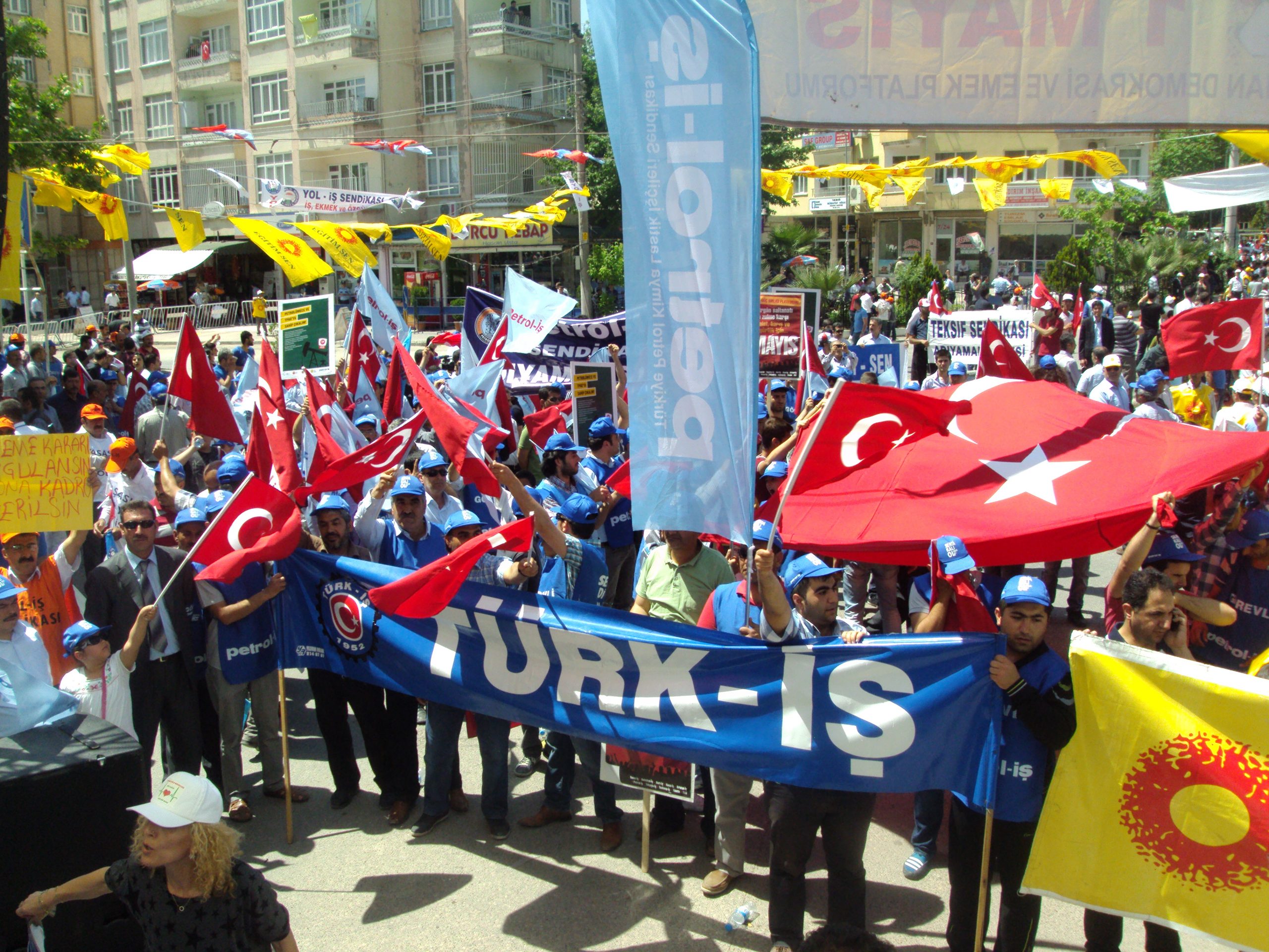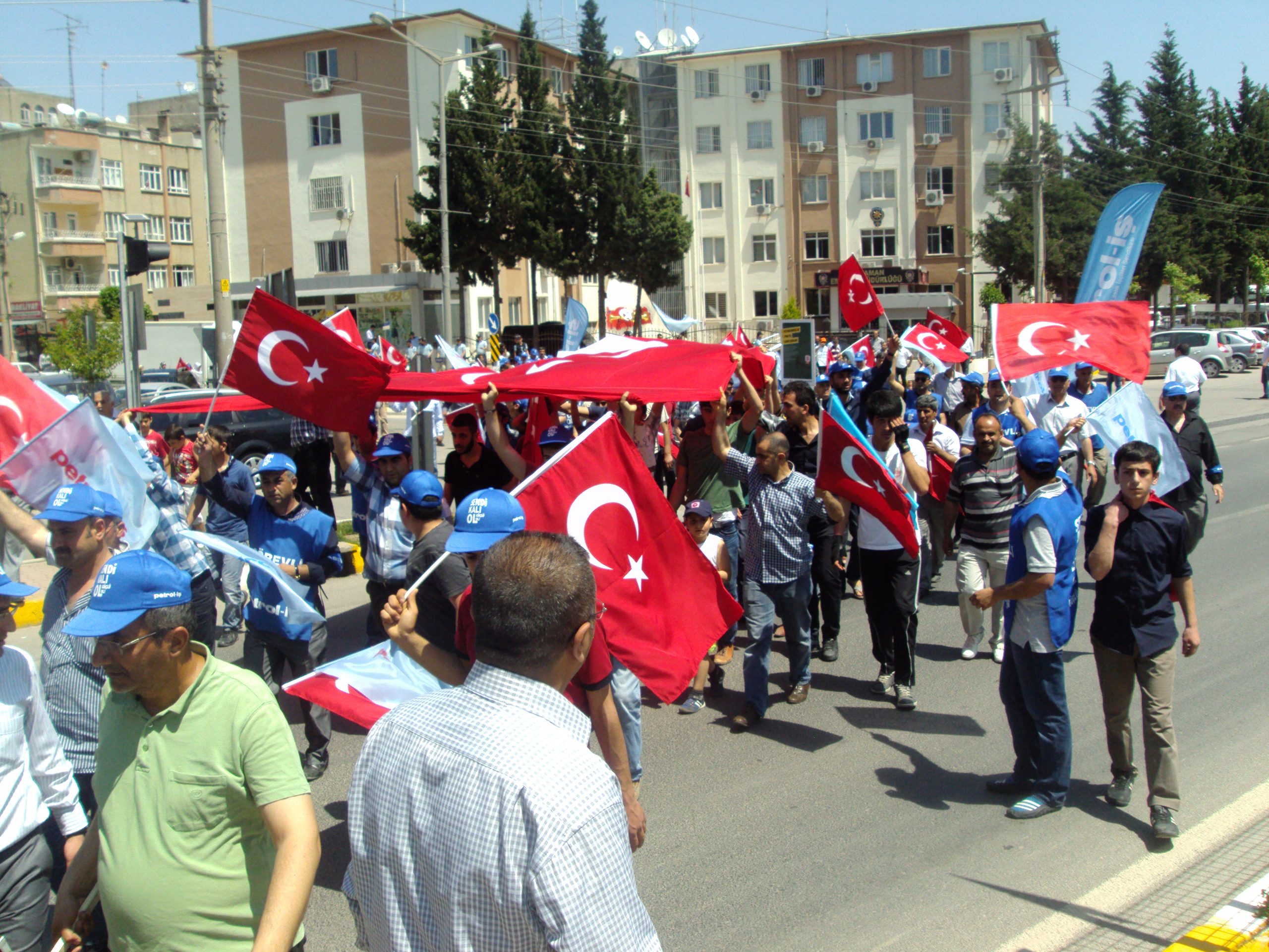 Bu meydanlara hakkı müdaafa günü olan 1 Mayıs’da  AVM şantiyelerinde yanan işçileri anmak için, barajlarda boğulan işçileri anmak için, sigortasız işçinin yetim çocuğunun gözyaşını silmek için, işçinin alınteri kurumadan ücretini verin buyuran yüce önderin mesajını iletmek için. Emeğin hesabını sormak için, alınterinin hesabını sormak için ekmeğini yediğimiz vatanın bayrağı ile 1 Mayıs işçi bayramına Adıyaman Petrol-İş Sendikası olarak katıldık.