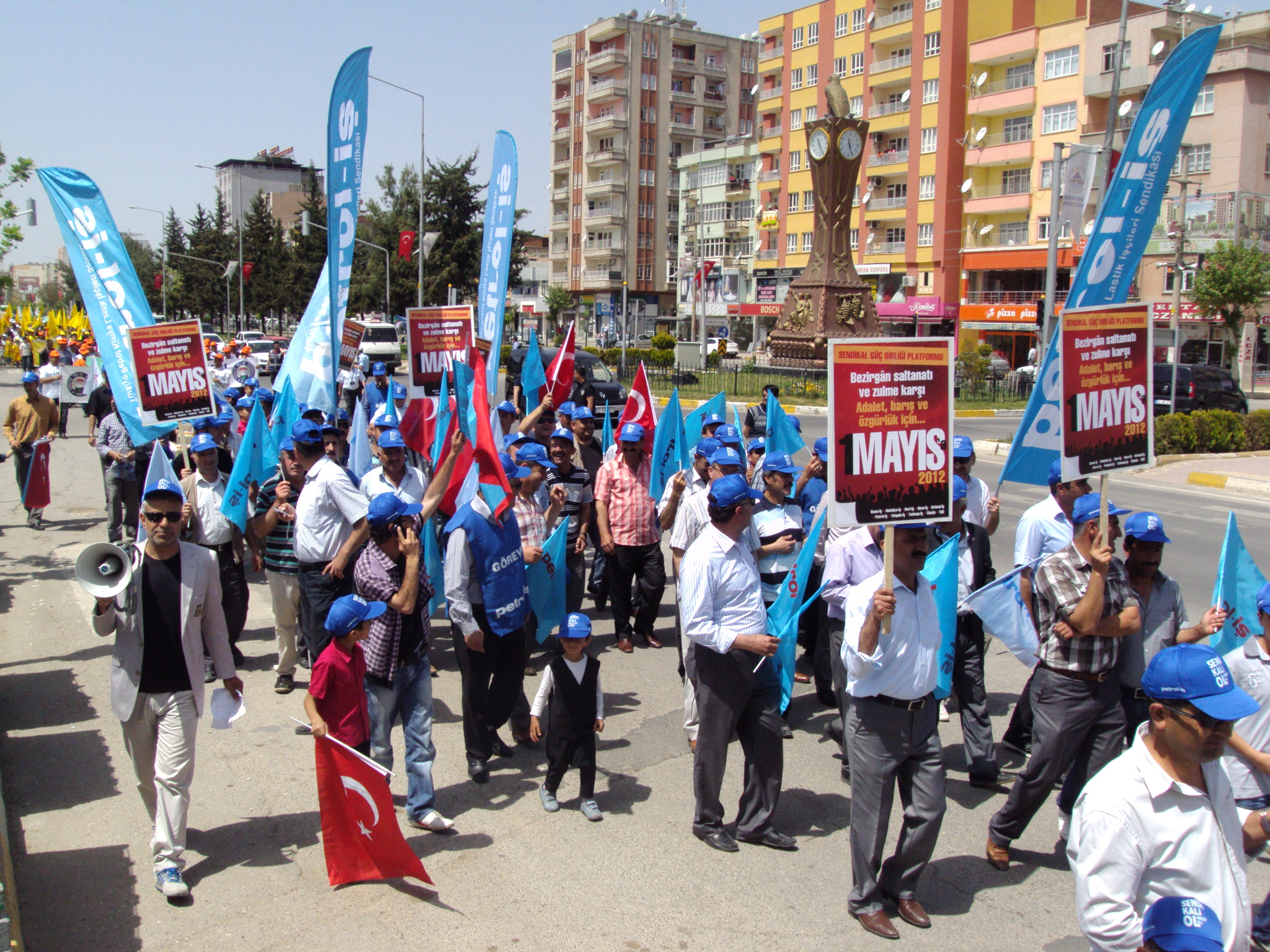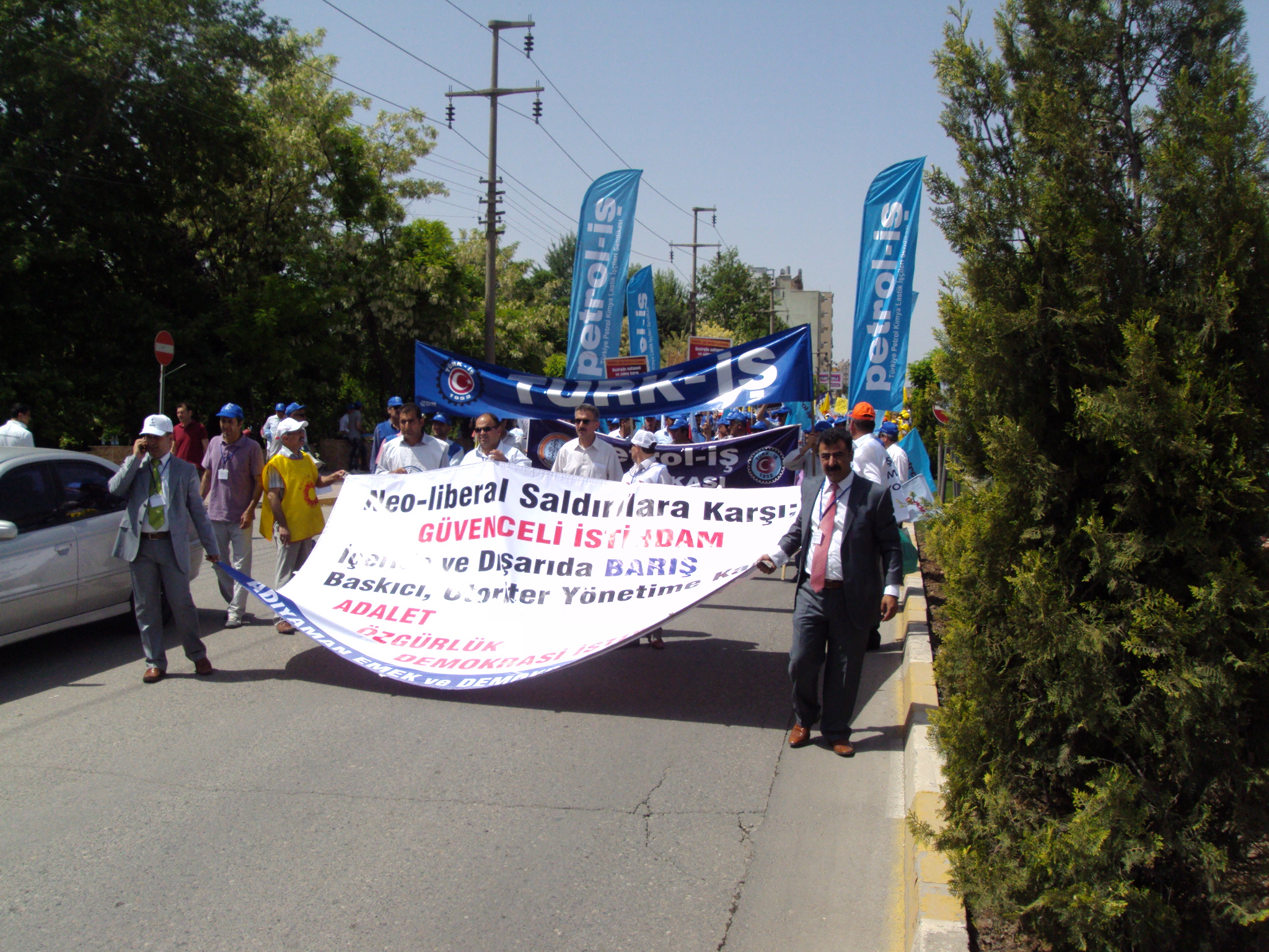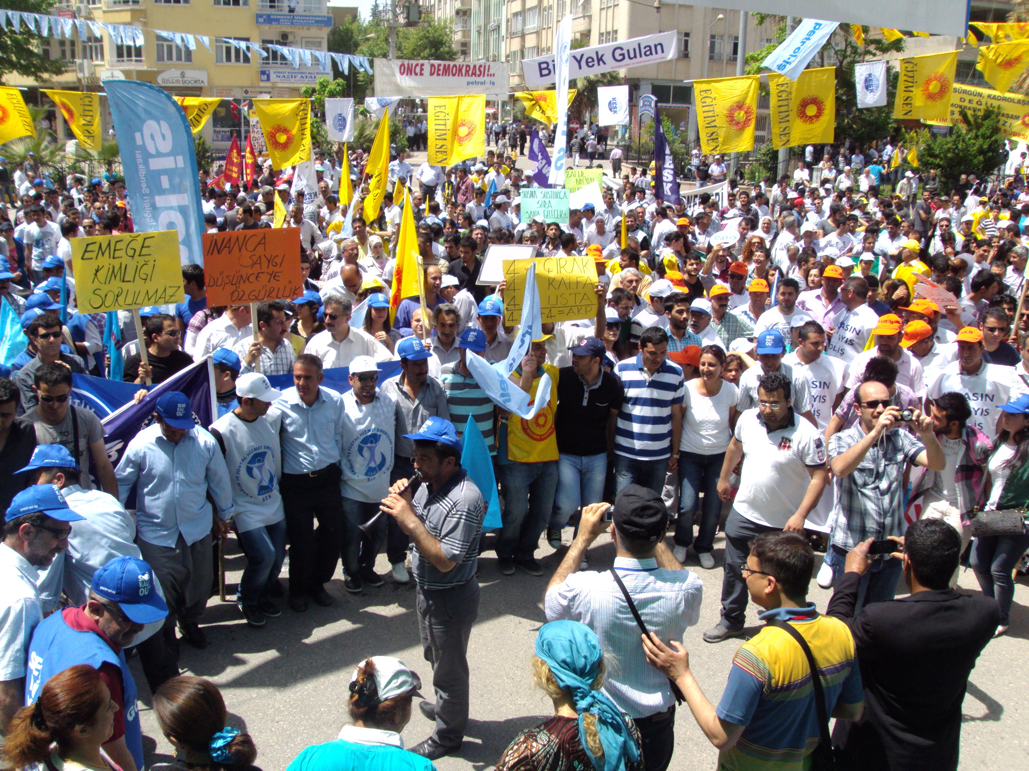 1 Mayıs kutlamalarına Sendikal Güç Birliği Platformu (SGBP) adına katılan Petrol – İş Sendikası Merkez Yönetim Kurulu Üyesi, Genel Mali Sekreterimiz İbrahim Doğangül 1 Mayıs mitinginde yaptığı konuşmada, kendilerinin de bağlı olduğu Türk – İş’in konuşma metninde anlaşma sağlanamaması bahanesiyle, emekçilerin 1 Mayıs’ı birlikte kutlamalarını engellemeye çalıştığını, bundan dolayı Türk İş’i kınadığını söyledi. Kürt sorununda hükümetin çözümsüzlüğü dayattığını belirten Doğangül, Kürt sorununun demokratik ve barışçıl yollarla çözümünü talep ettiklerini vurguladı.