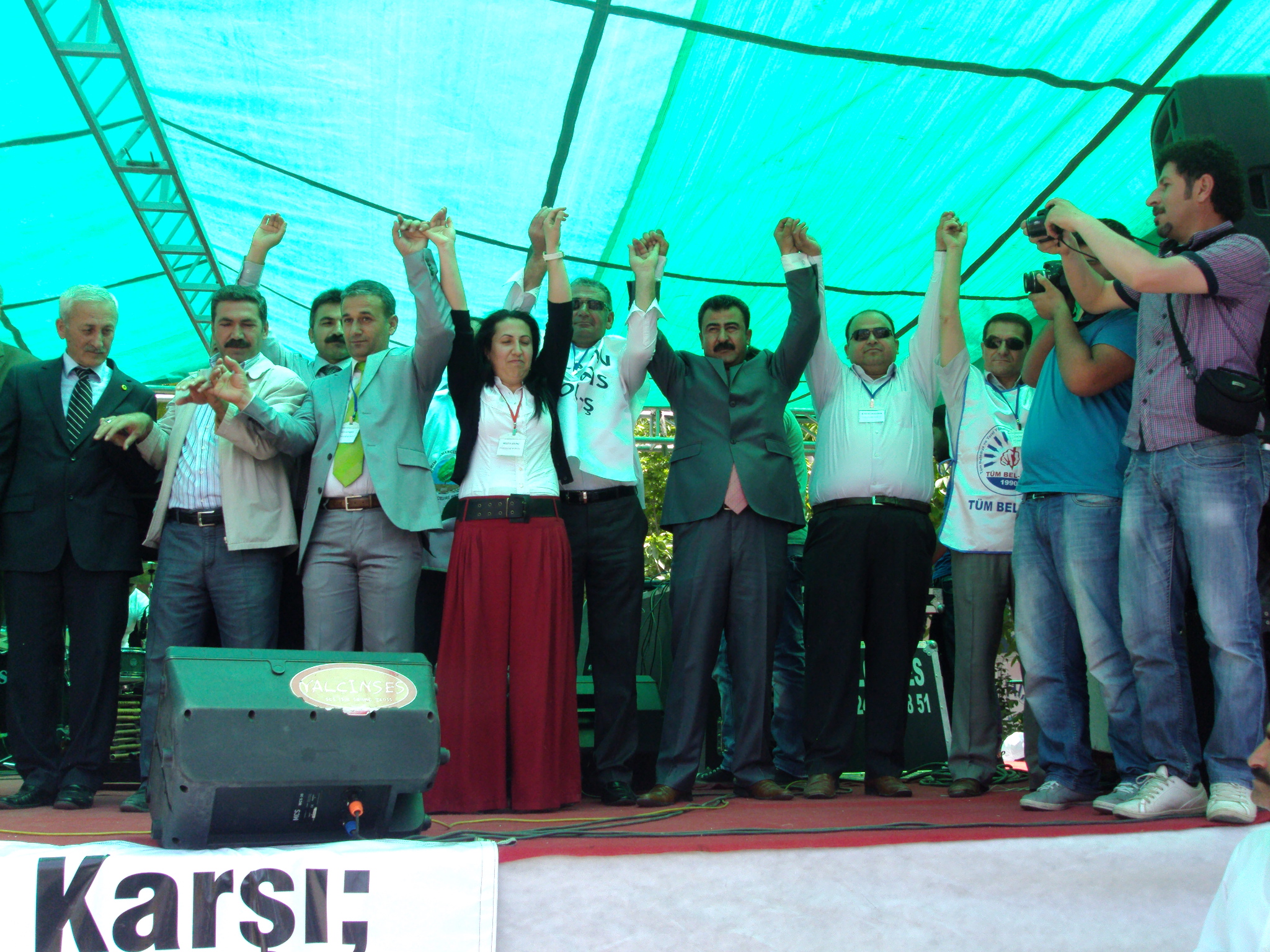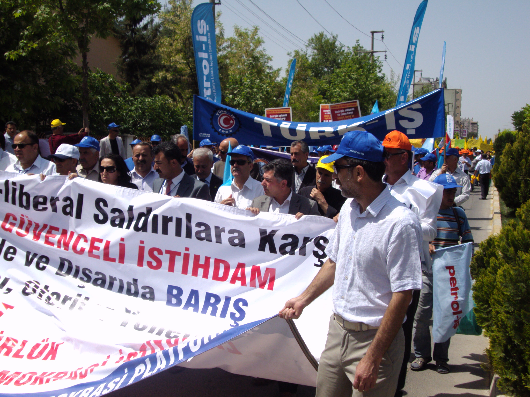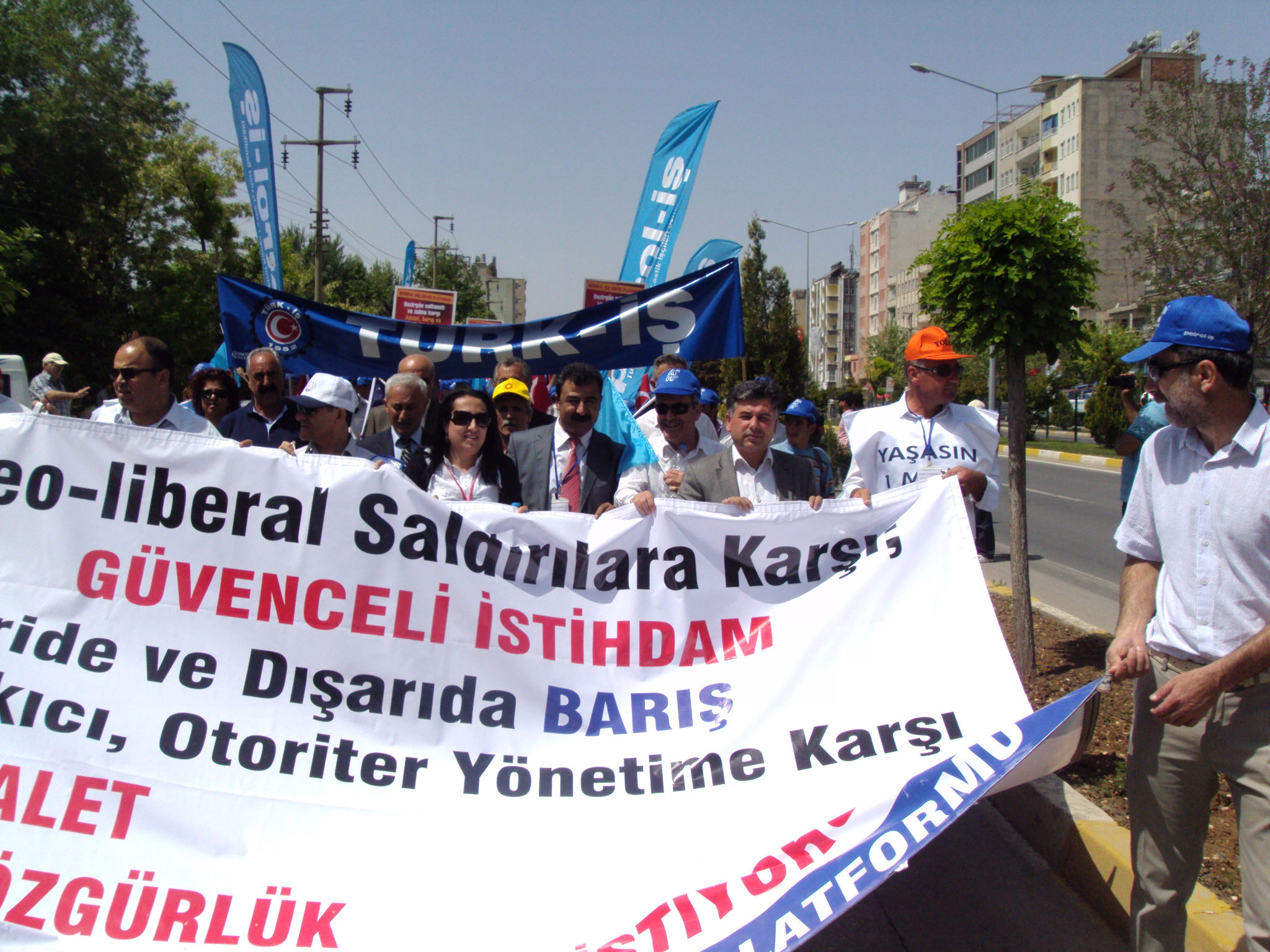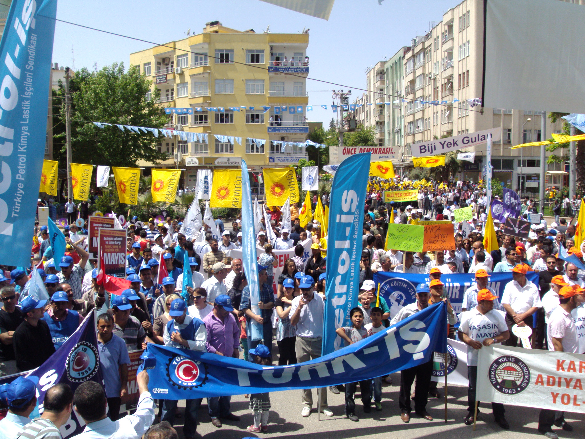 1 Mayıs kutlamalarına Sendikal Güç Birliği Platformu (SGBP) adına katılan Petrol – İş Sendikası Merkez Yönetim Kurulu Üyesi, Genel Mali Sekreterimiz İbrahim Doğangül 1 Mayıs mitinginde yaptığı konuşmada, kendilerinin de bağlı olduğu Türk – İş’in konuşma metninde anlaşma sağlanamaması bahanesiyle, emekçilerin 1 Mayıs’ı birlikte kutlamalarını engellemeye çalıştığını, bundan dolayı Türk İş’i kınadığını söyledi. Kürt sorununda hükümetin çözümsüzlüğü dayattığını belirten Doğangül, Kürt sorununun demokratik ve barışçıl yollarla çözümünü talep ettiklerini vurguladı.