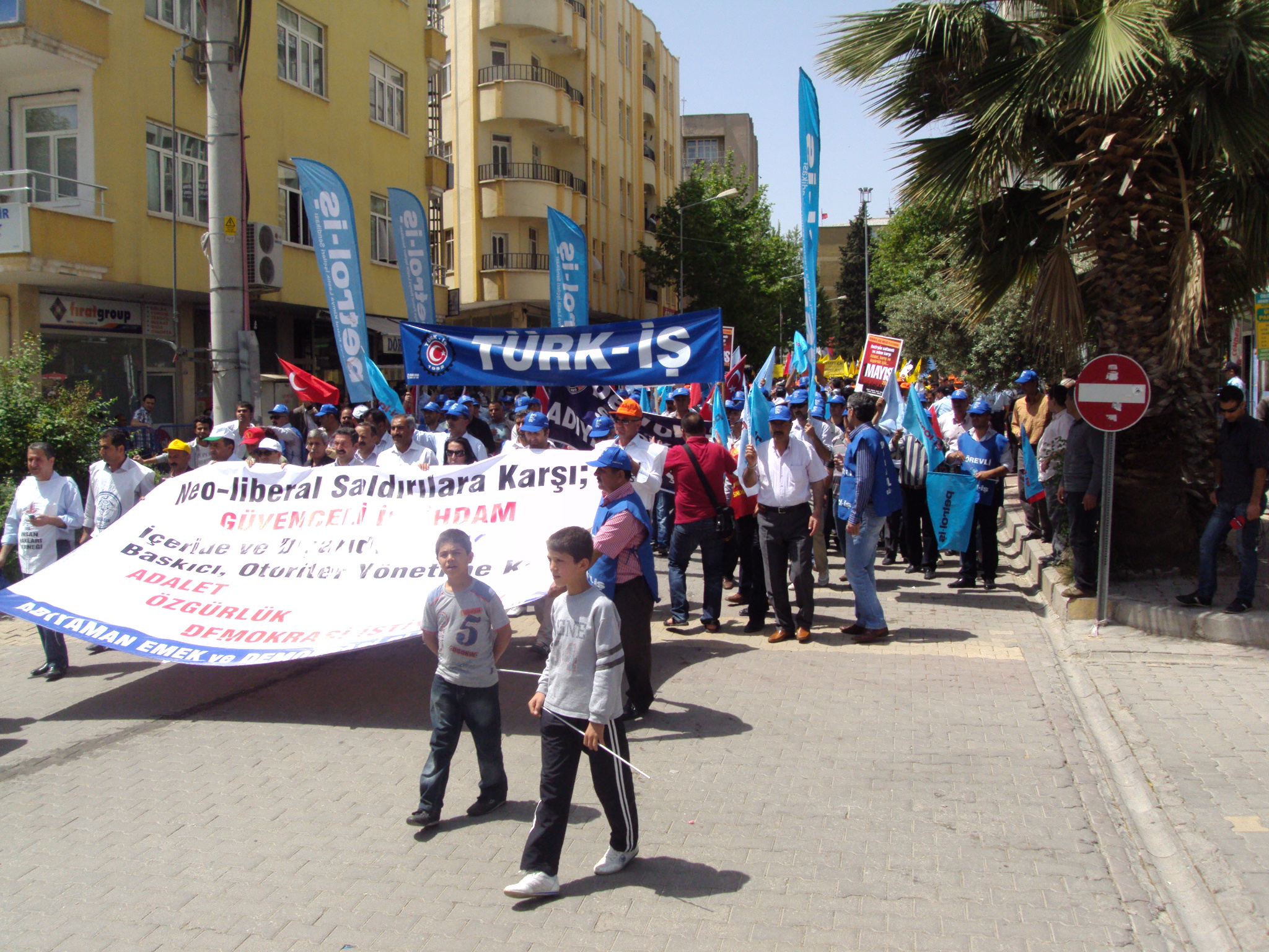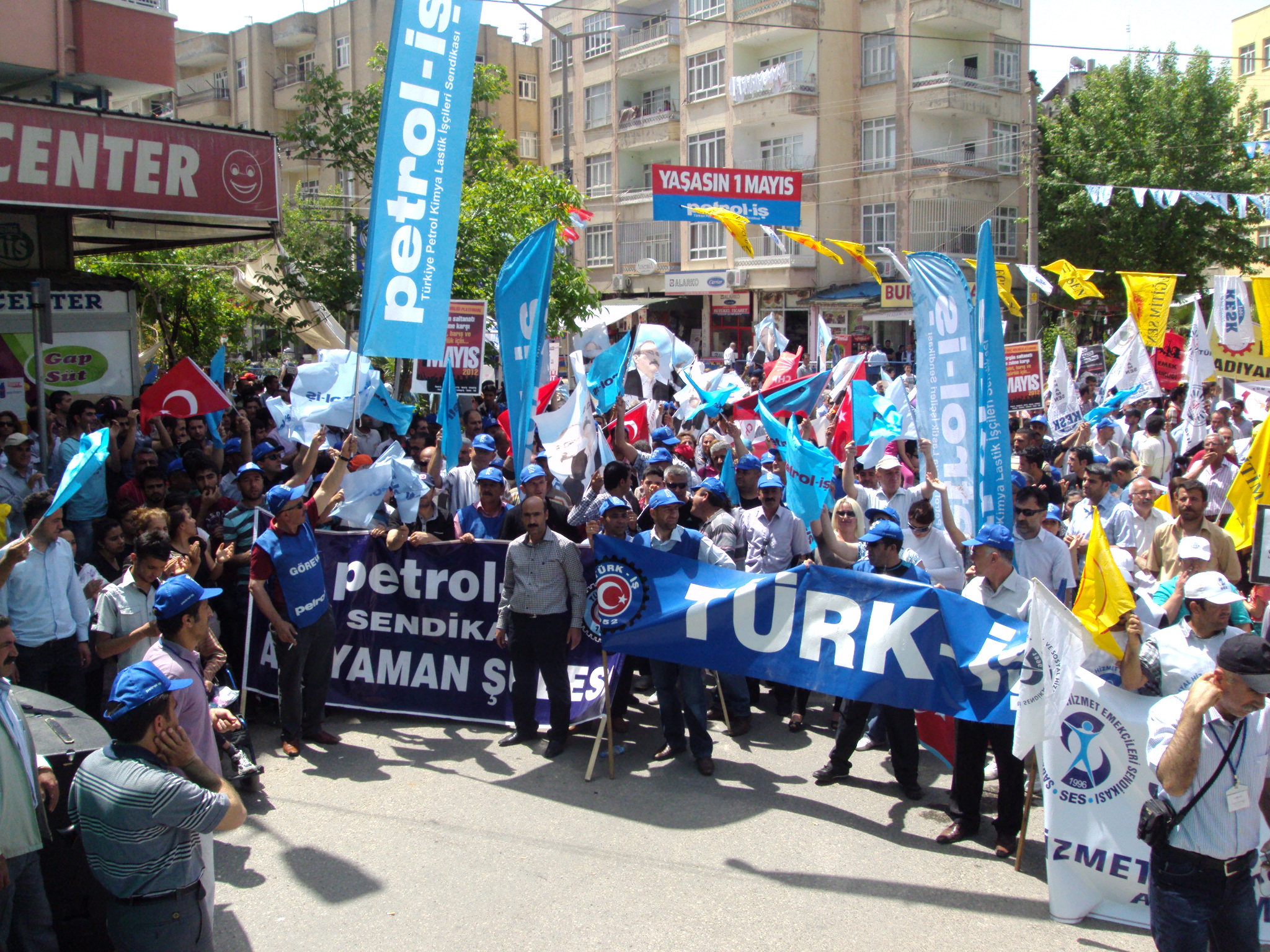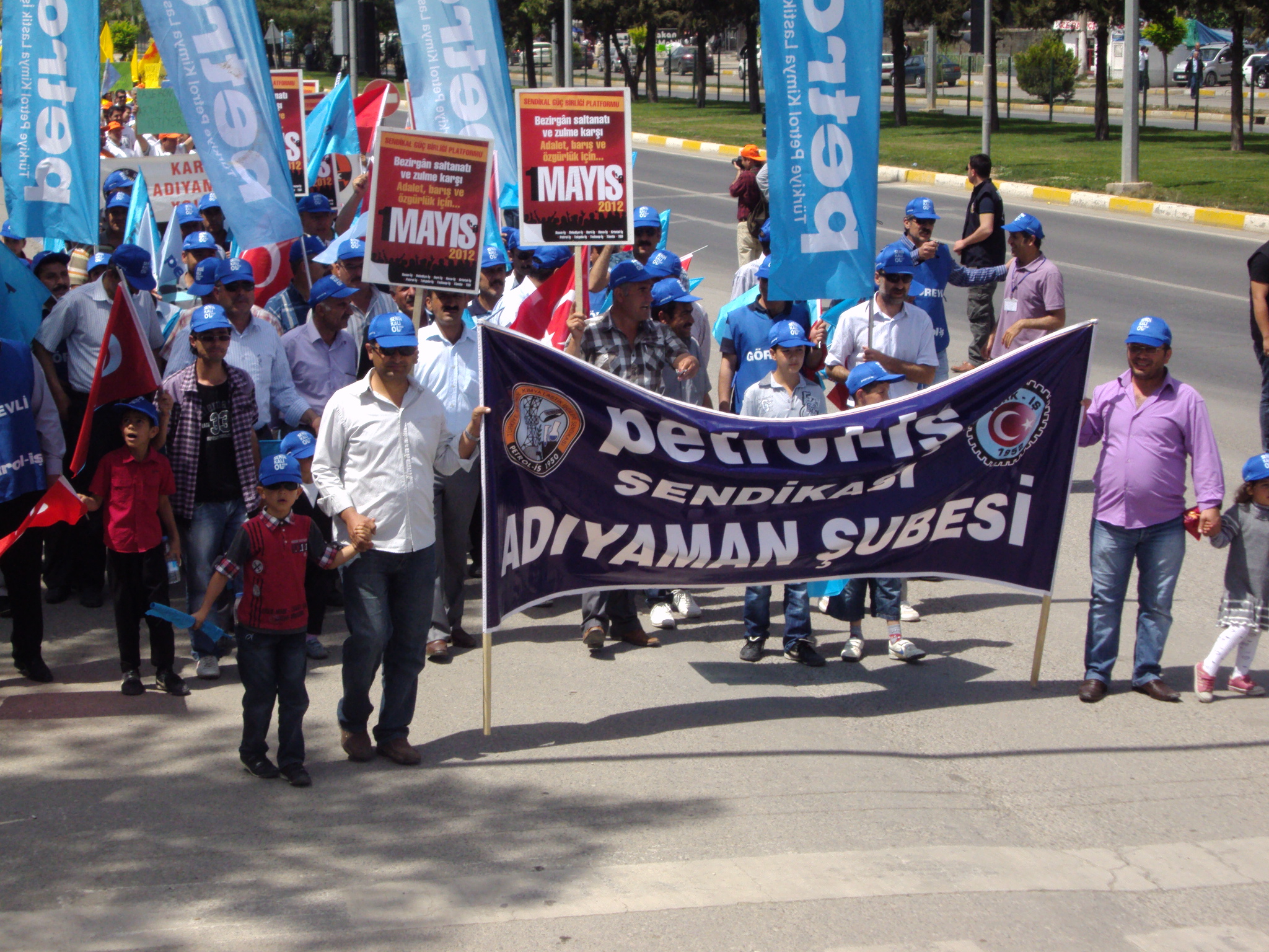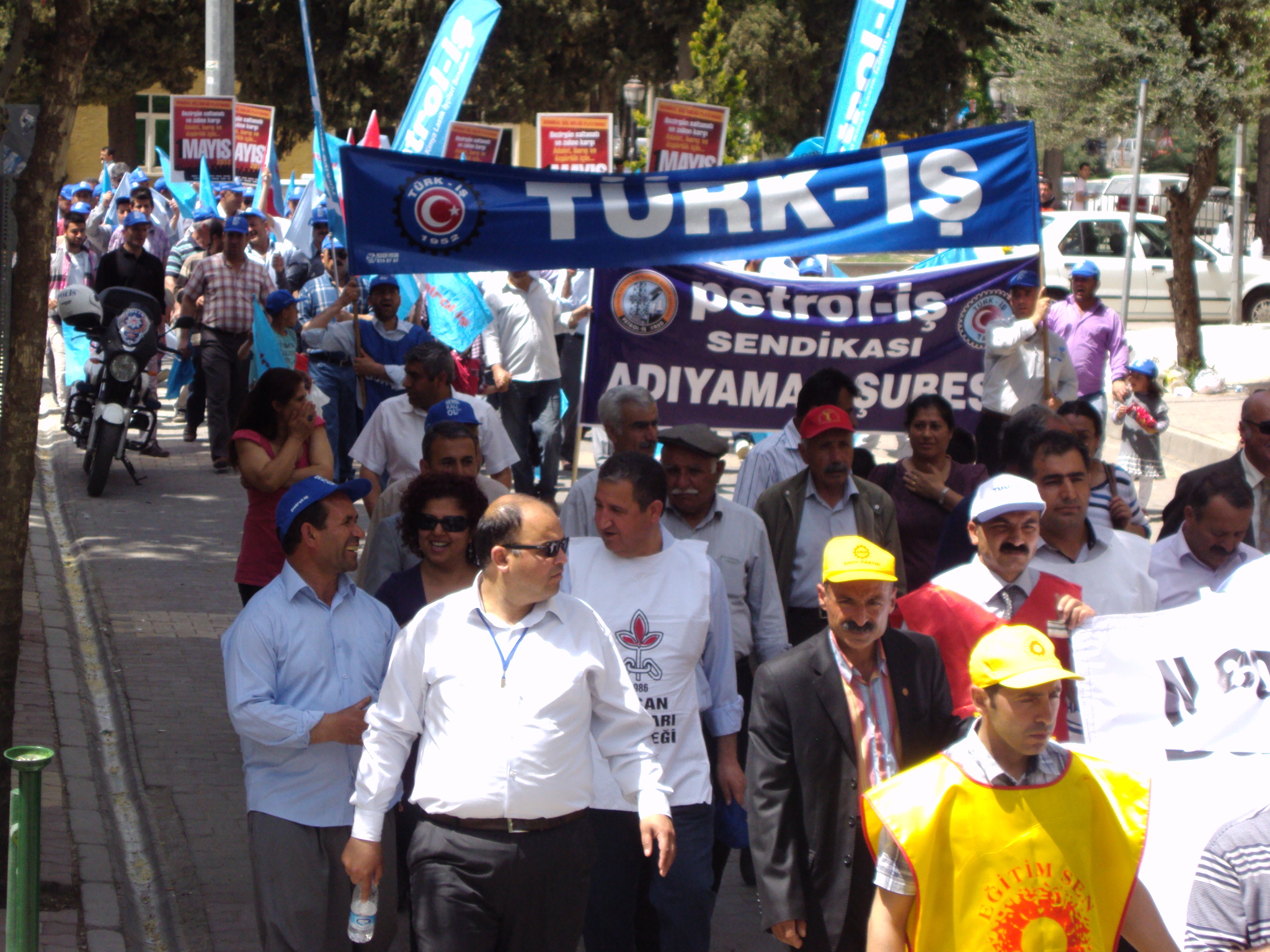 Kutlamalar Mimar Sinan Kültür Parkı önünde oluşturulan kortejle başladı. Kitle, “Yaşasın 1 Mayıs” “Yaşasın İş Ekmek Özgürlük Mücadelemiz”, “Güvenceli İş, Güvenli Gelecek İstiyoruz” sloganları atarak 1.5 km yürüdü ve 1 Mayıs alanına girdi. 1 Mayıs alanında Adıyaman İşsizler Derneği, AKAY DER (Adıyaman Kadın Yaşam Derneği), Tüm Köy Sen Adıyaman Temsilciliği ve Özgür Eğitim Sen üyeleri Adıyaman’da ilk kez 1 Mayıs kutlamalarına katıldı. Karayollarında çalışan Yol- İş üyesi işçilerin “İş ekmek özgürlük” pankartı ile kitlesel olarak katıldığı mitingde Emek Gençliği üyelerinin kitlesel ve coşkulu katılımı dikkat çekti.