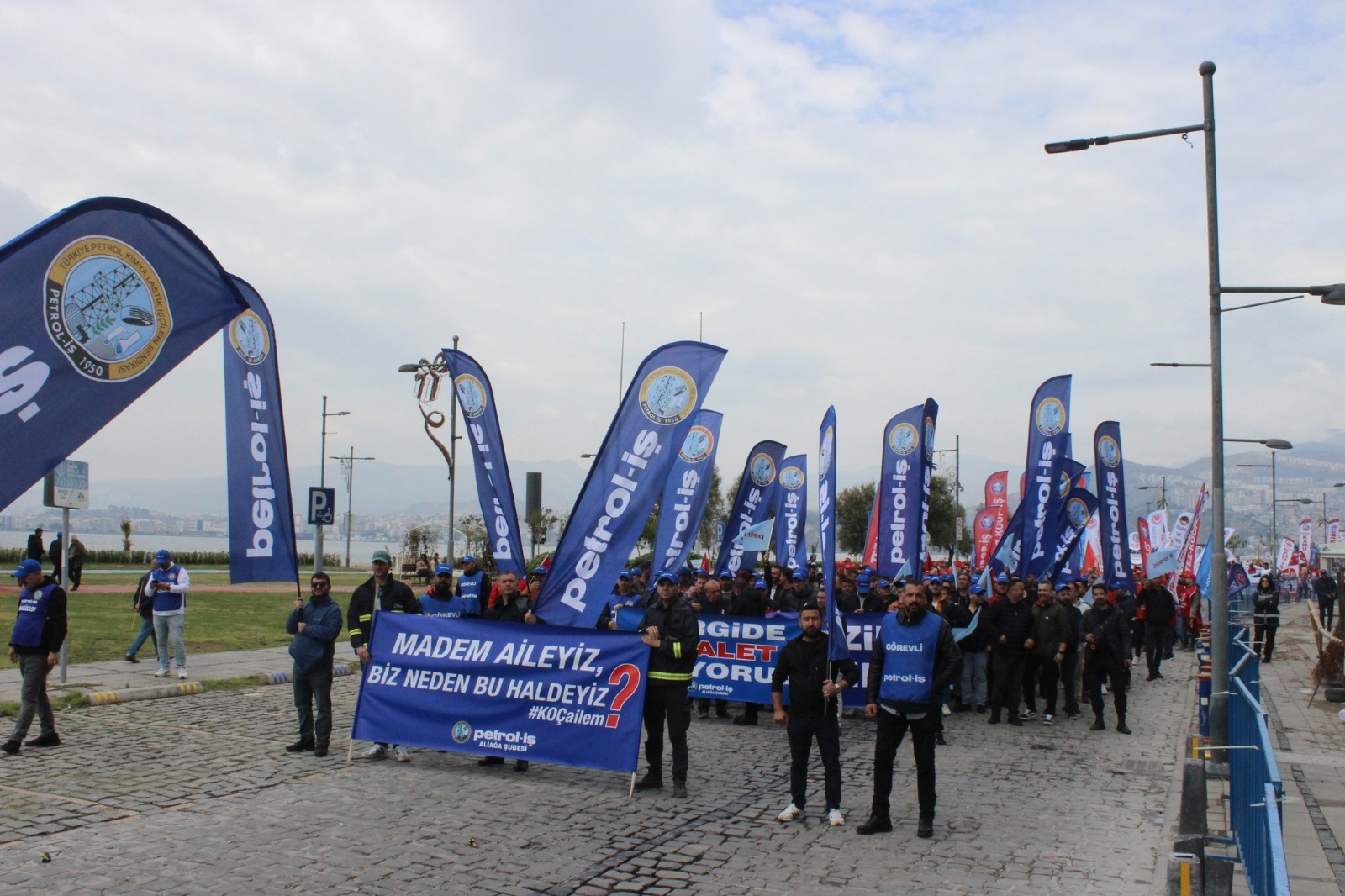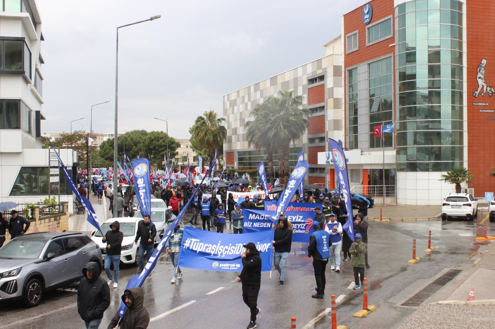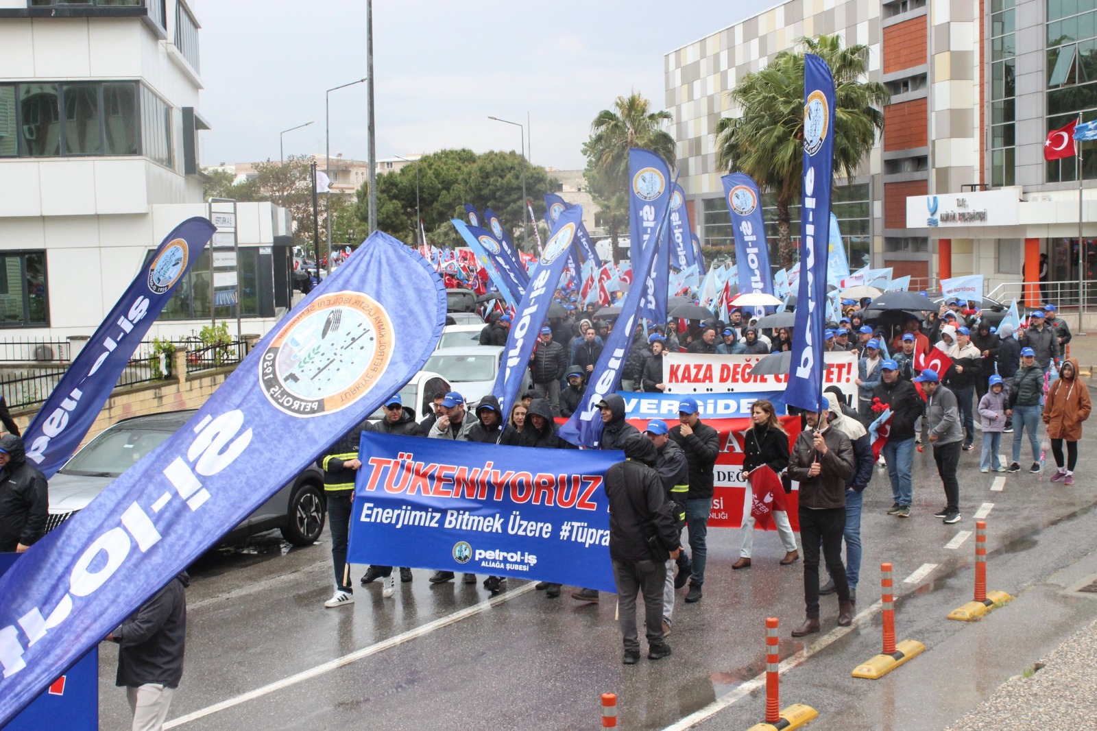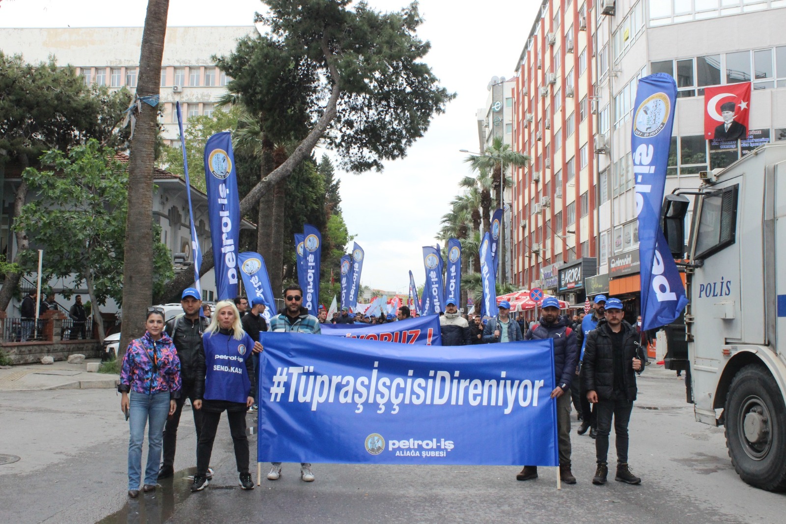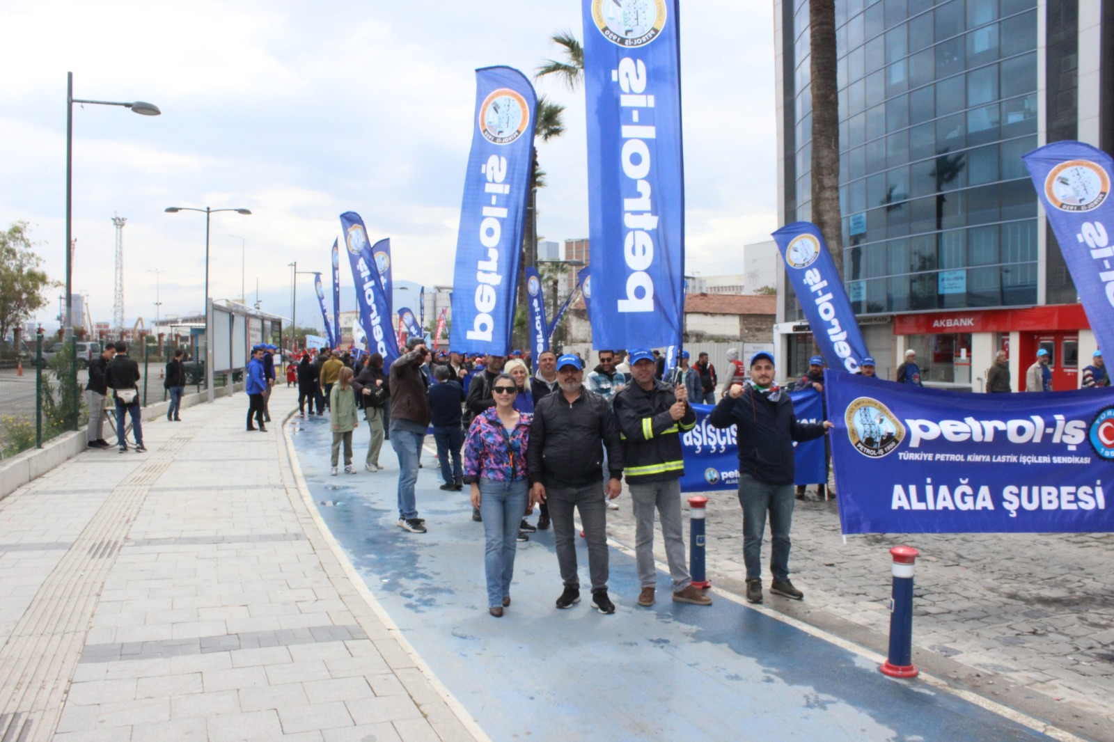 Sabah erken saatlerde Aliağa Şube önünde toplanan kitle, taşıdıkları pankart ve güçlü sloganları ile Demokrasi Meydanı’na yürüdü. Petrol-İş Korteji “Emek Bizim Söz Bizim” “Madem Aileyiz, Biz Neden Bu Haldeyiz!” “TüpraşİşçisiDireniyor”, “Tükeniyoruz; Enerjimiz Bitmek Üzere #Tüpraş” pankartlarıyla yürüdü.
