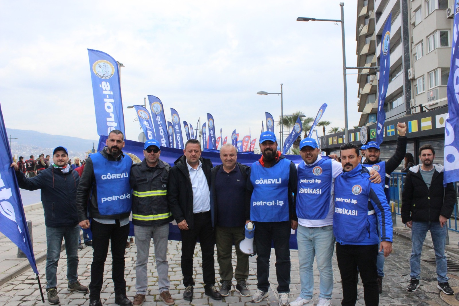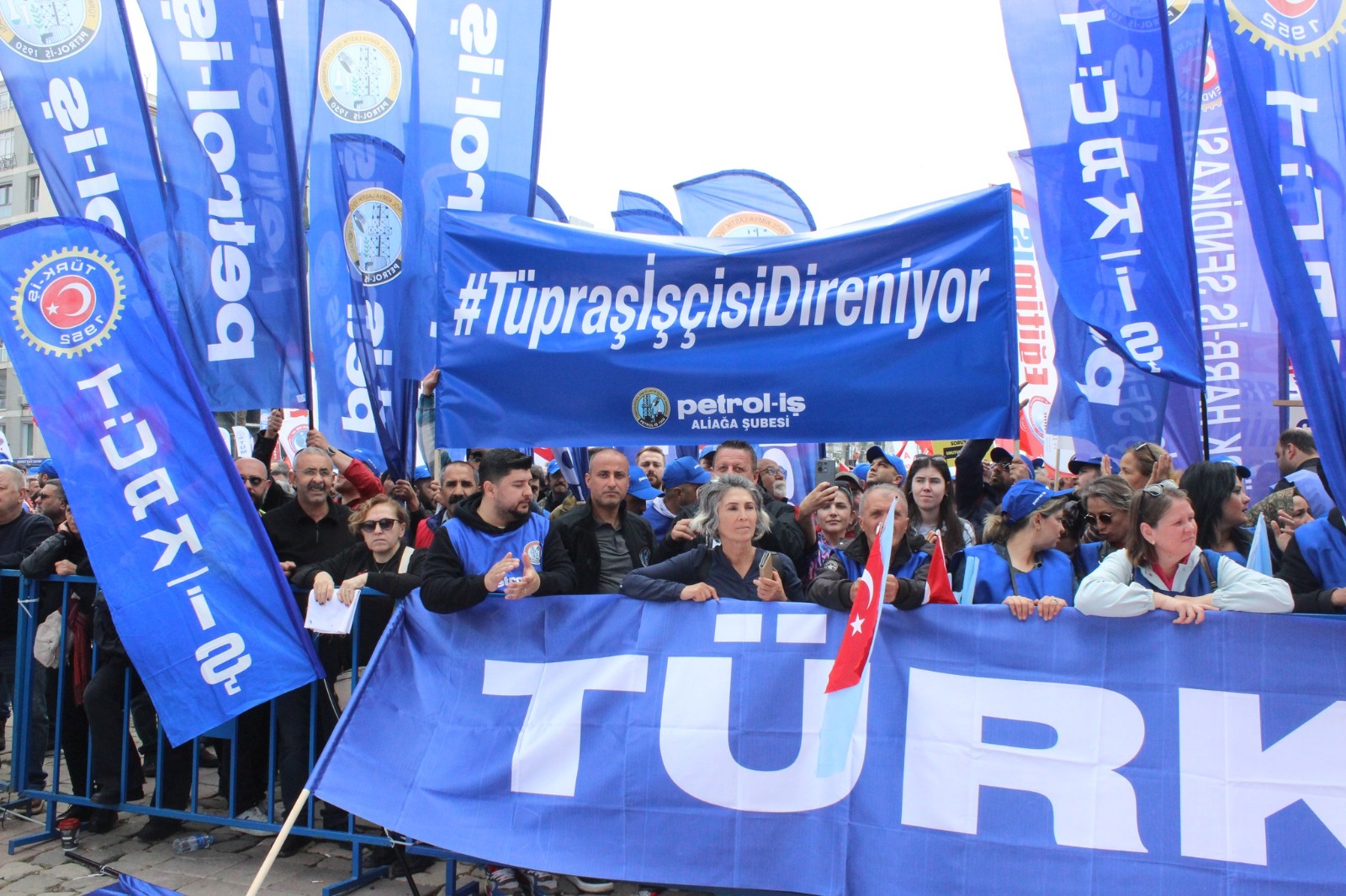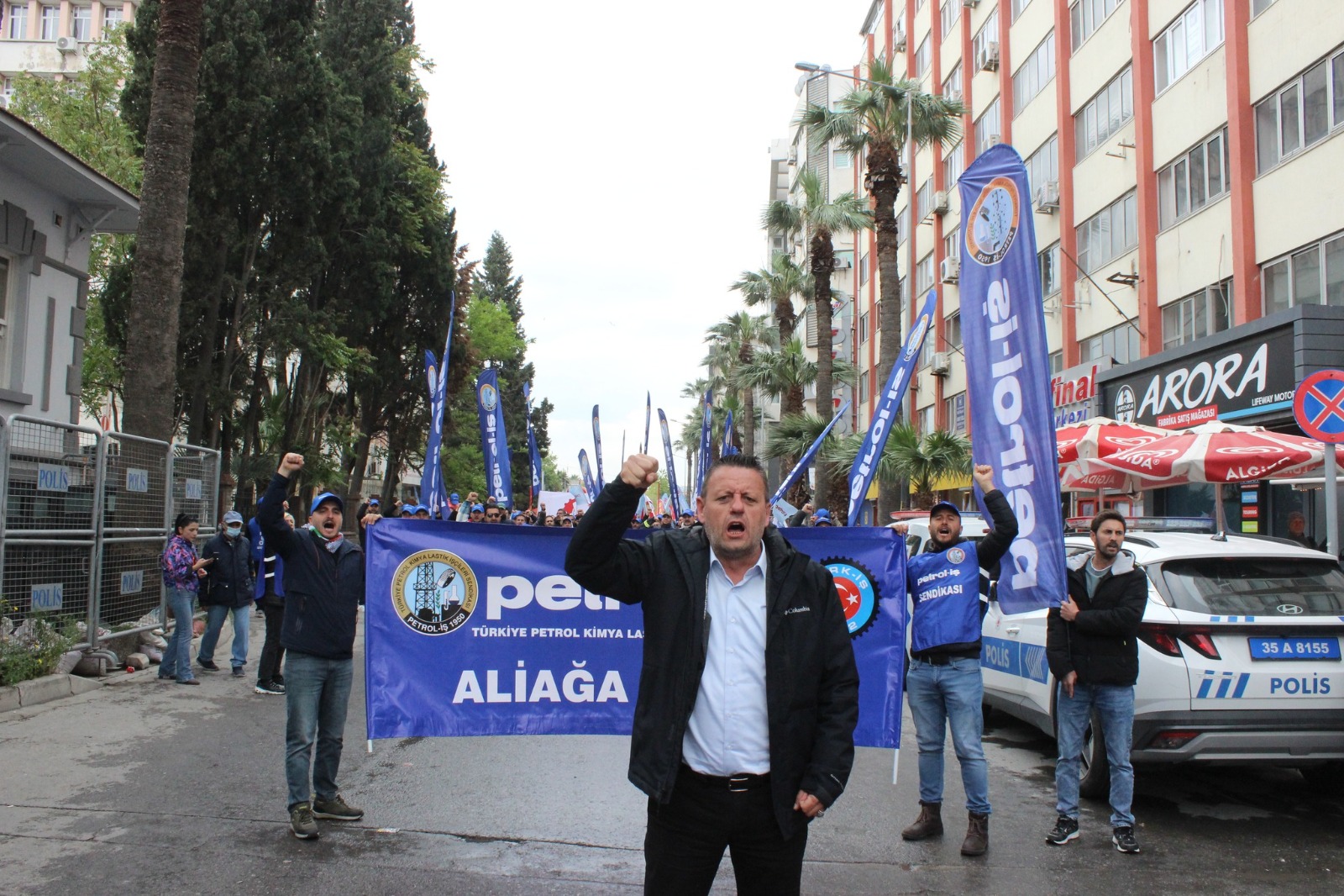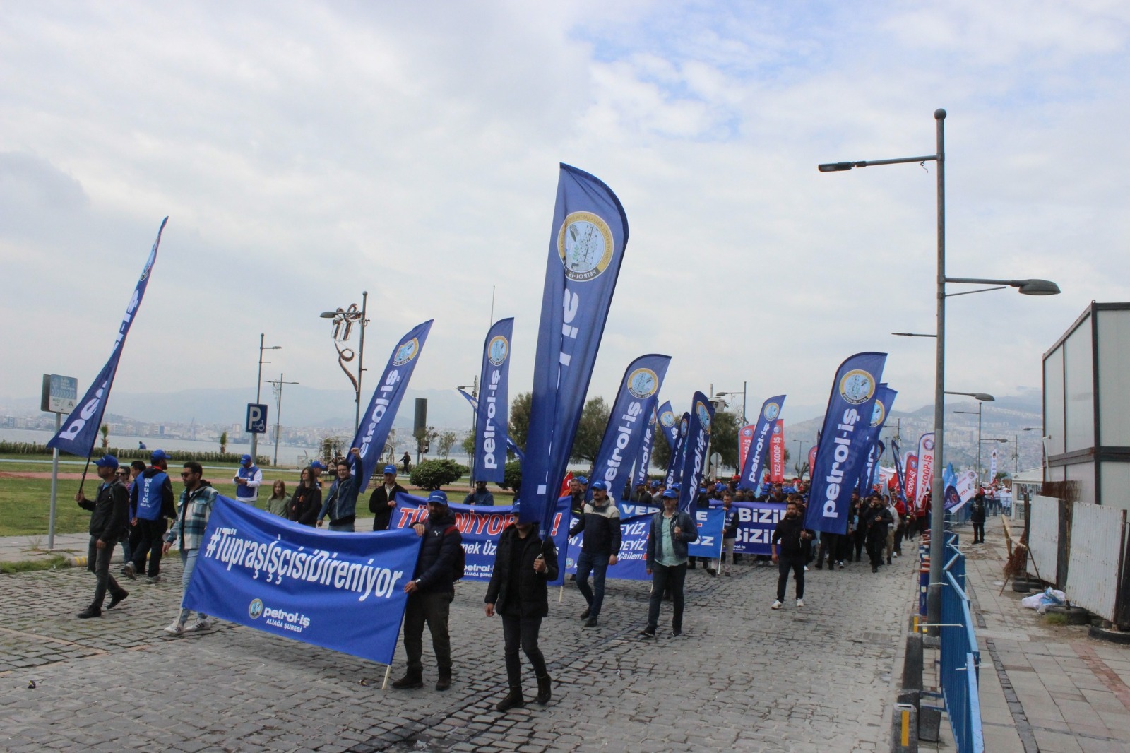 Sabah erken saatlerde Aliağa Şube önünde toplanan kitle, taşıdıkları pankart ve güçlü sloganları ile Demokrasi Meydanı’na yürüdü. Petrol-İş Korteji “Emek Bizim Söz Bizim” “Madem Aileyiz, Biz Neden Bu Haldeyiz!” “TüpraşİşçisiDireniyor”, “Tükeniyoruz; Enerjimiz Bitmek Üzere #Tüpraş” pankartlarıyla yürüdü.