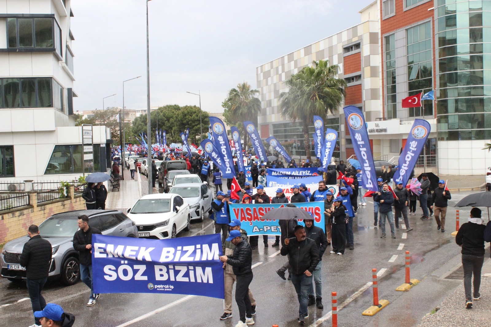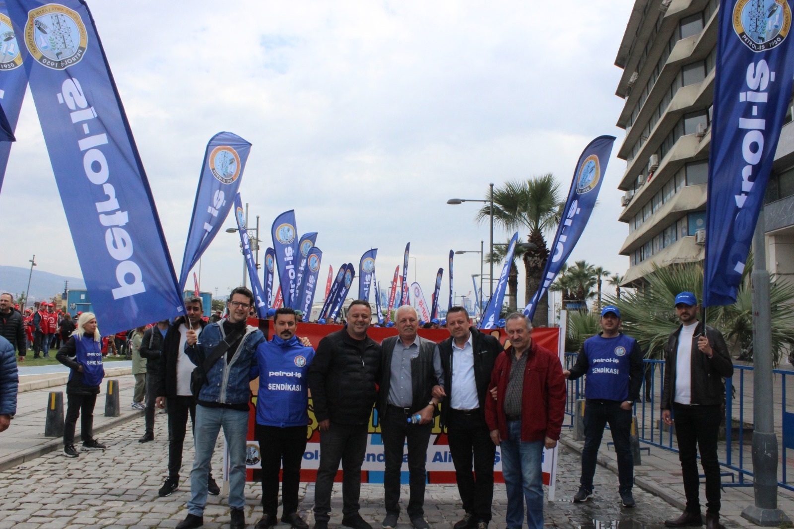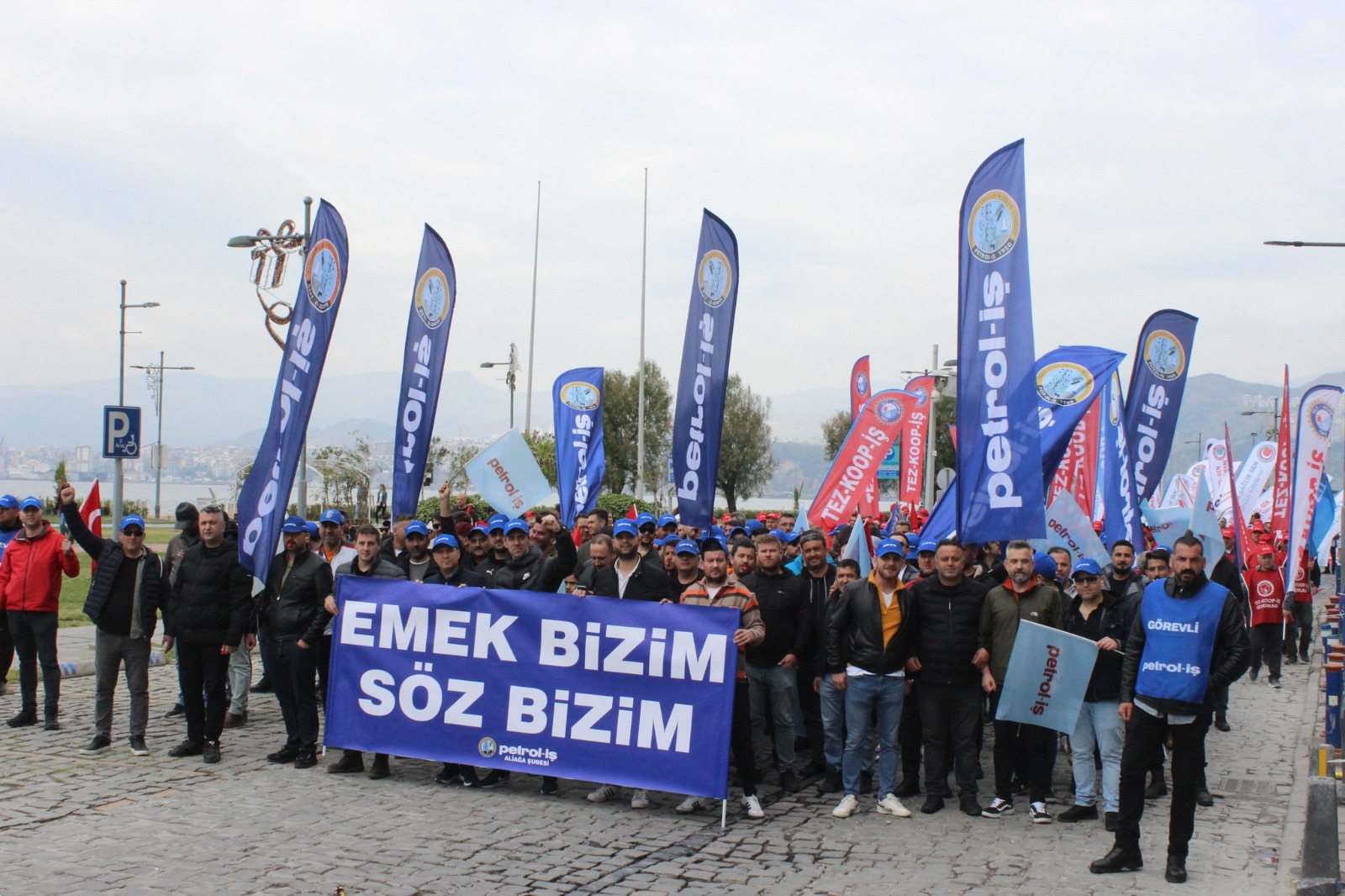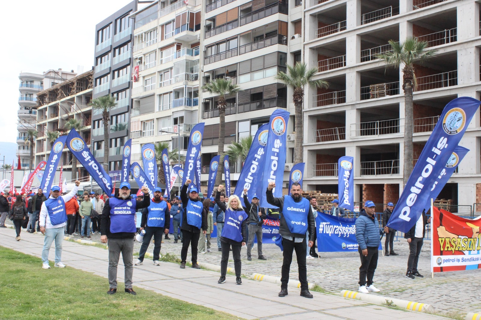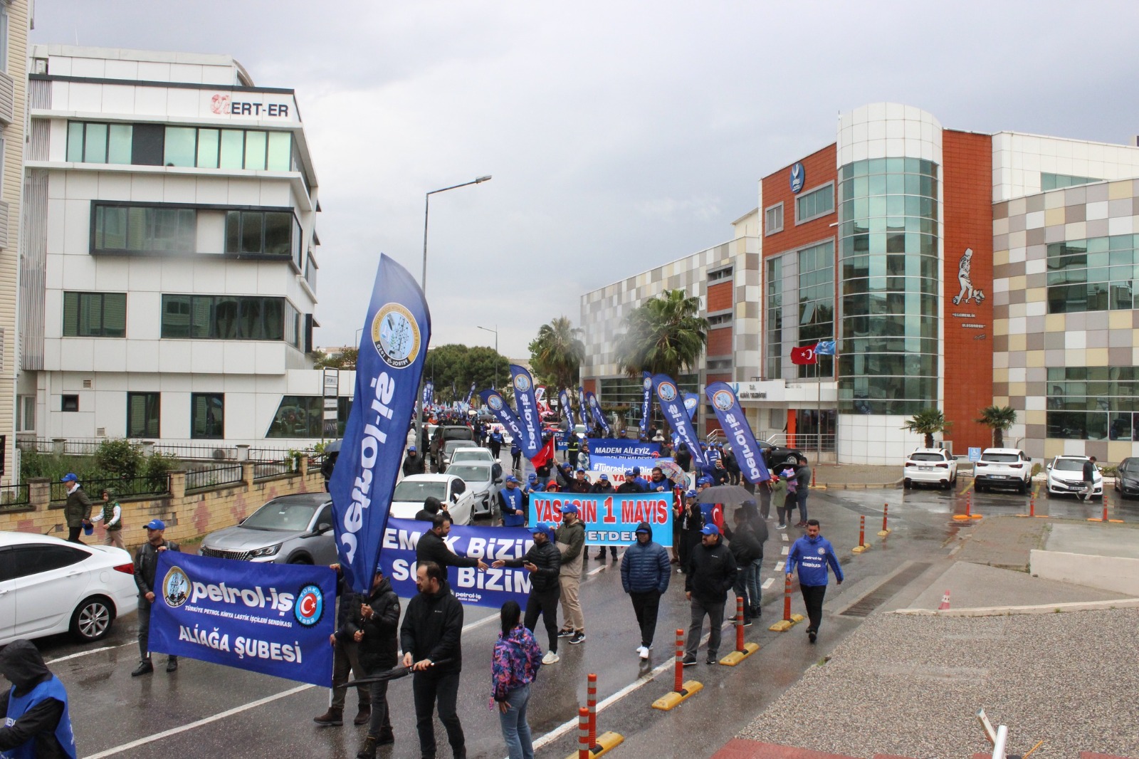 Sabah erken saatlerde Aliağa Şube önünde toplanan kitle, taşıdıkları pankart ve güçlü sloganları ile Demokrasi Meydanı’na yürüdü. Petrol-İş Korteji “Emek Bizim Söz Bizim” “Madem Aileyiz, Biz Neden Bu Haldeyiz!” “TüpraşİşçisiDireniyor”, “Tükeniyoruz; Enerjimiz Bitmek Üzere #Tüpraş” pankartlarıyla yürüdü.
