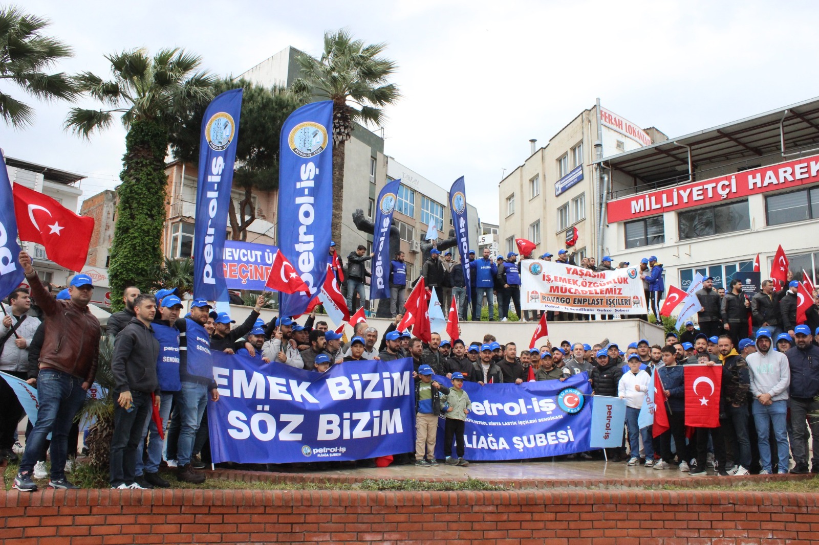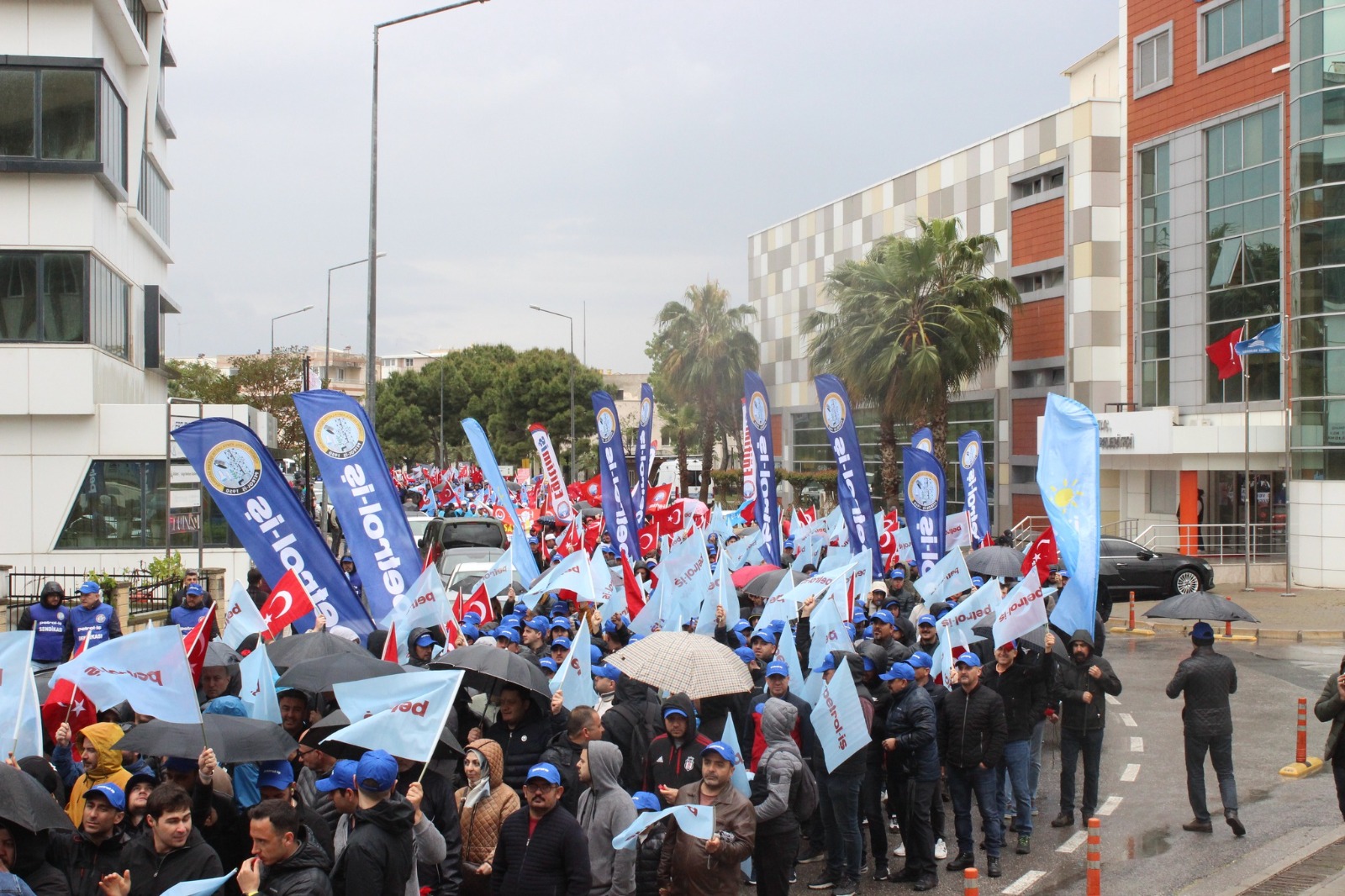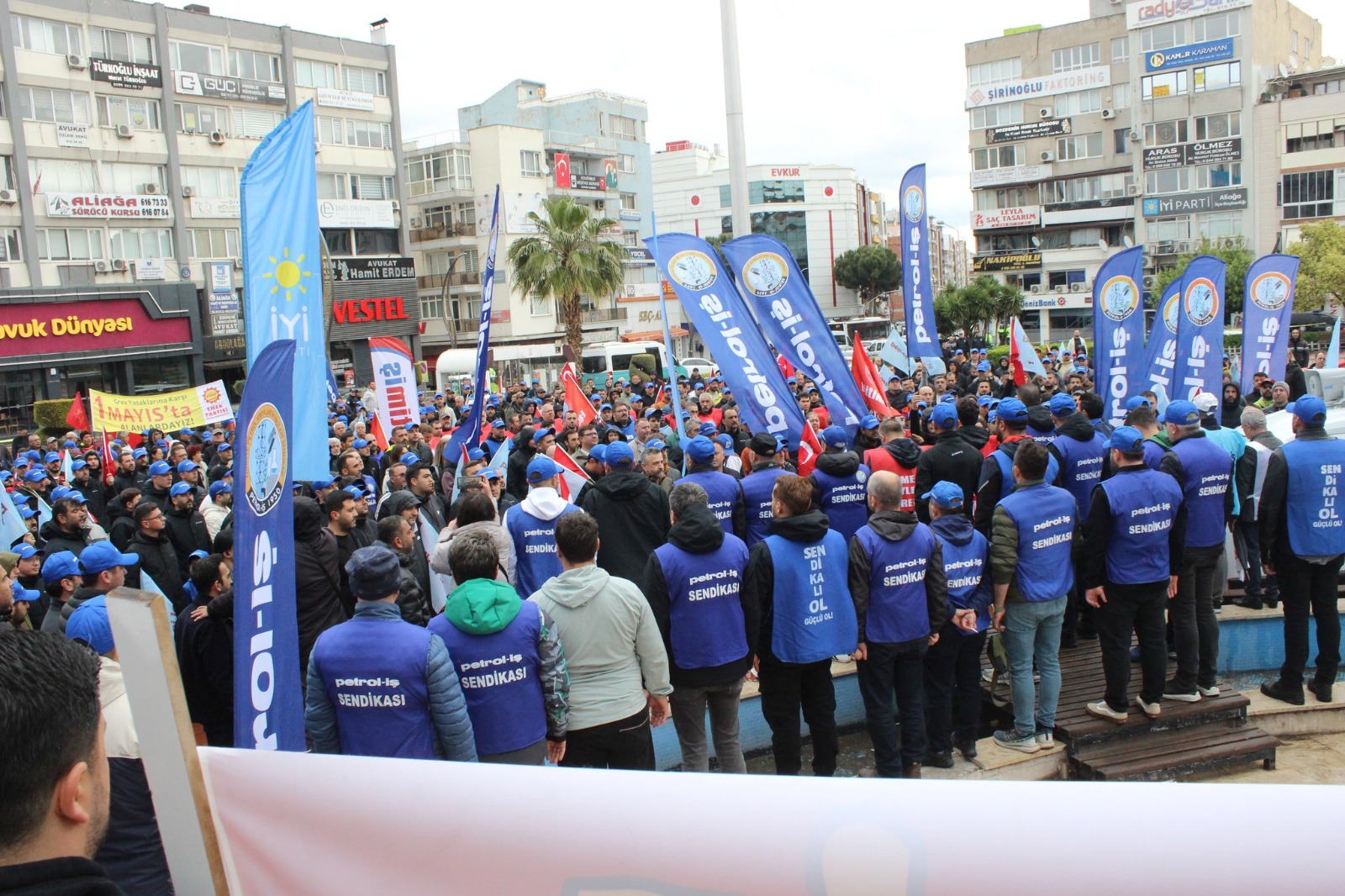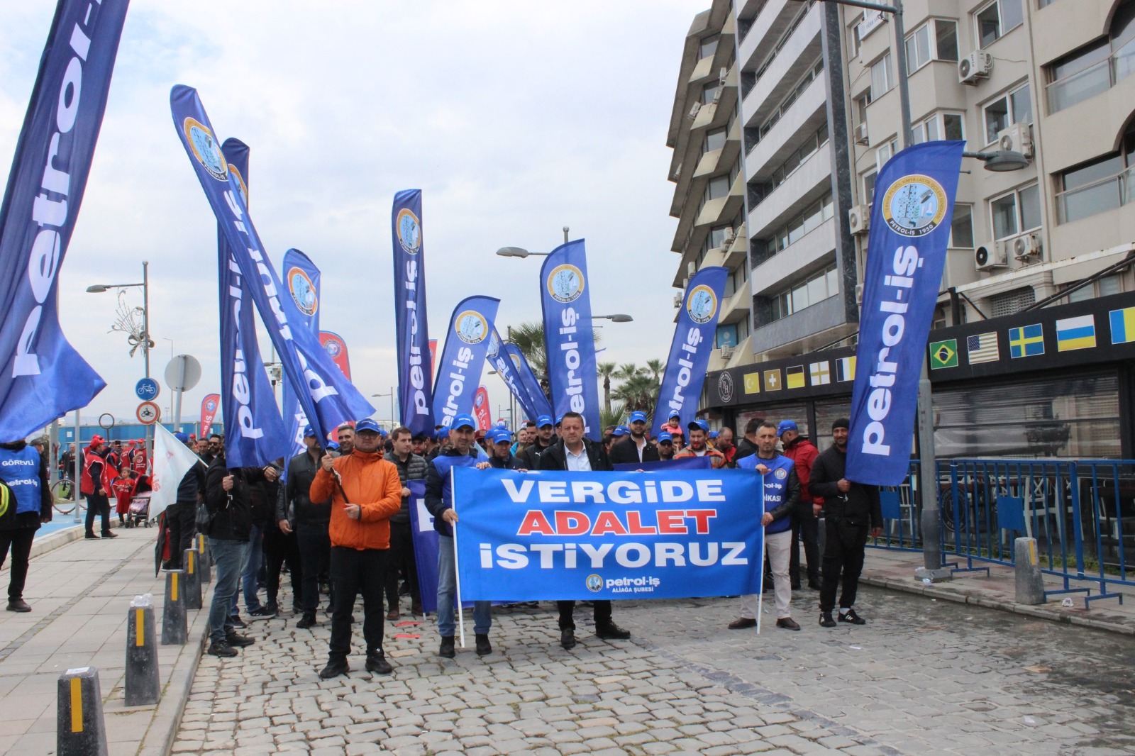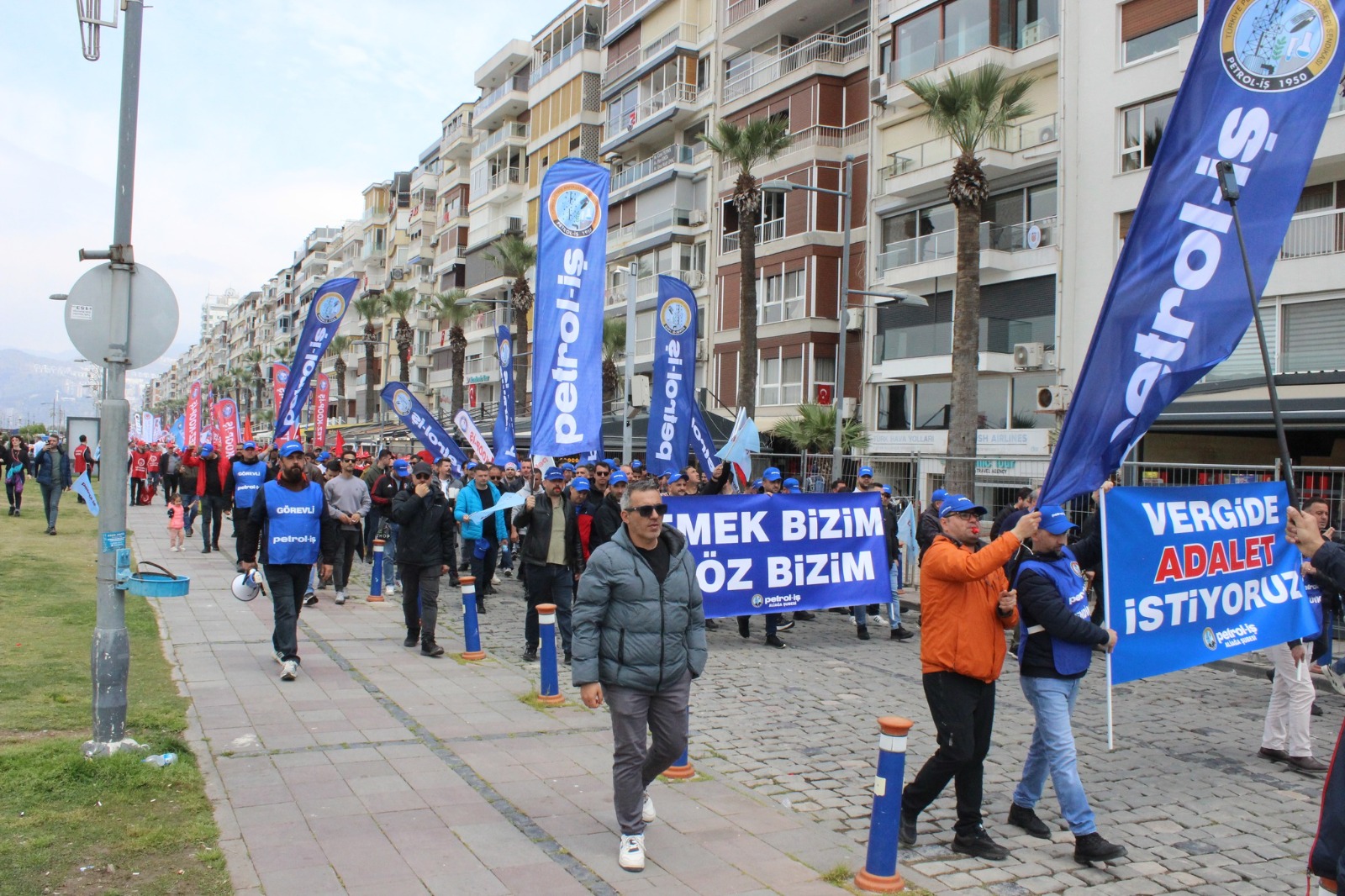 Sabah erken saatlerde Aliağa Şube önünde toplanan kitle, taşıdıkları pankart ve güçlü sloganları ile Demokrasi Meydanı’na yürüdü. Petrol-İş Korteji “Emek Bizim Söz Bizim” “Madem Aileyiz, Biz Neden Bu Haldeyiz!” “TüpraşİşçisiDireniyor”, “Tükeniyoruz; Enerjimiz Bitmek Üzere #Tüpraş” pankartlarıyla yürüdü.