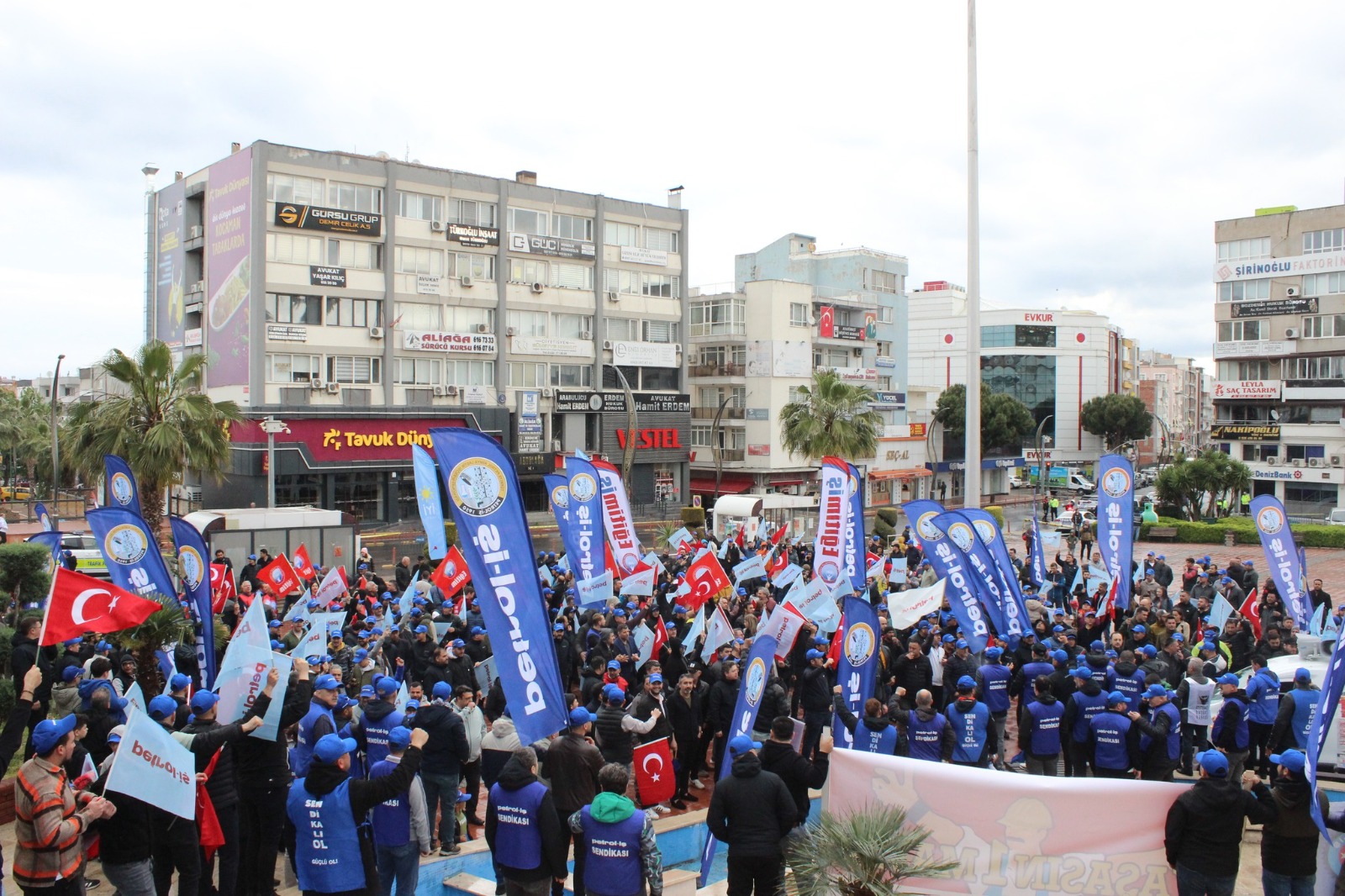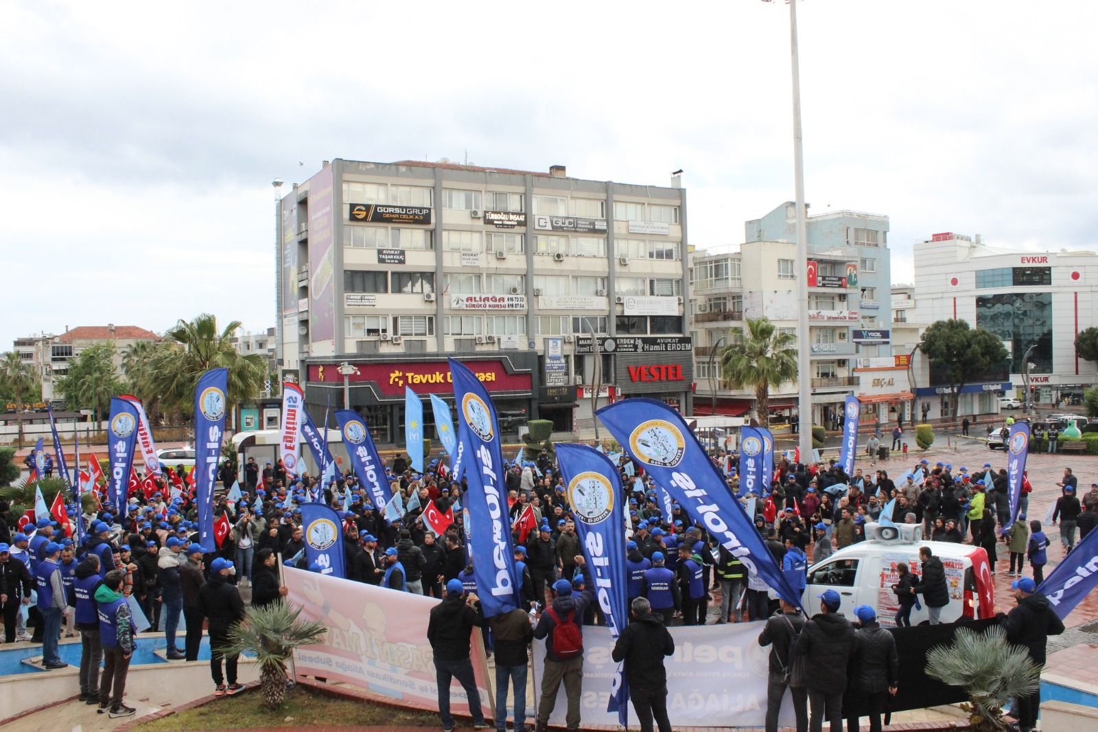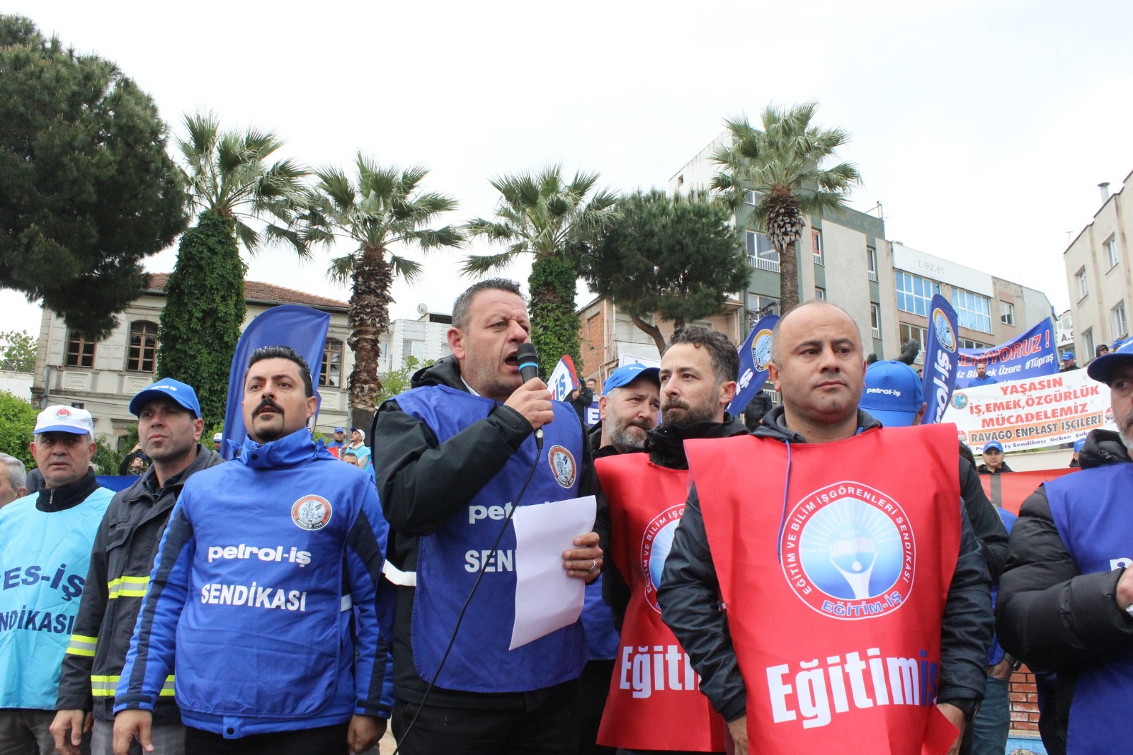Sendikamız Aliağa Şube Başkanı Hasan Toptan kalabalığa hitaben yaptığı konuşmasında, “1 Mayıs işçisi, çiftçisi, memuru, kadını, erkeği, genci, emeklisiyle tüm emekçilerin taleplerini yükselttiği gündür” dedi. 150 yıl önce 8 saatlik iş günü talebiyle başlayan mücadelenin bugün meydanlarda, grev çadırlarında ve direniş alanlarında devam ettiğini ifade etti. “Daha fazla kemer sıkamayız. Asgari ücret yoksulluk sınırının üzerine çıkarılmalı, emekli maaşları insanca yaşam koşullarına uygun seviyelere yükseltilmelidir” diyen Toptan, vergi sistemindeki adaletsizliğe de dikkat çekerek bir çalışanın yıllık 2-3 maaşının vergiye gittiğini belirtti.