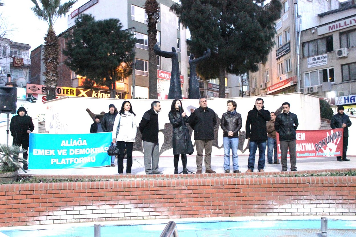 19 Şubat Perşembe günü, Aliağa şubemizinde içinde bulunduğu Aliağa Emek ve Demokrasi Platformu, Kıdem Tazminatlarının Fona Devredilmesi, Özel İstihdam Bürolarının Kurulması ve İç Güvenlik Paketini protesto etmek amacıyla Aliağa Demokrasi Meydanı’nda basın açıklaması yaptı. Basın açıklamasının tam metni aşağıdaki gibidir: