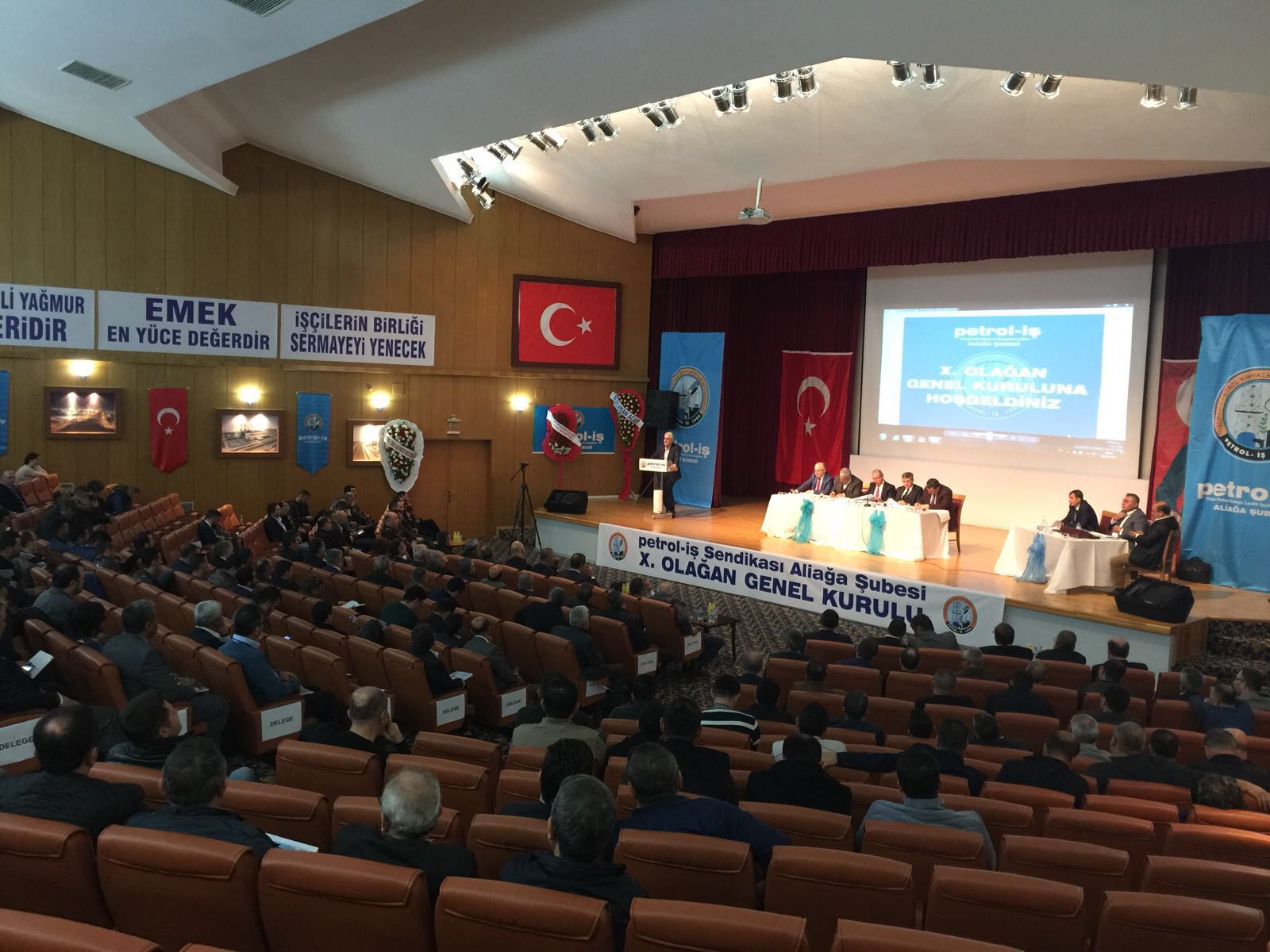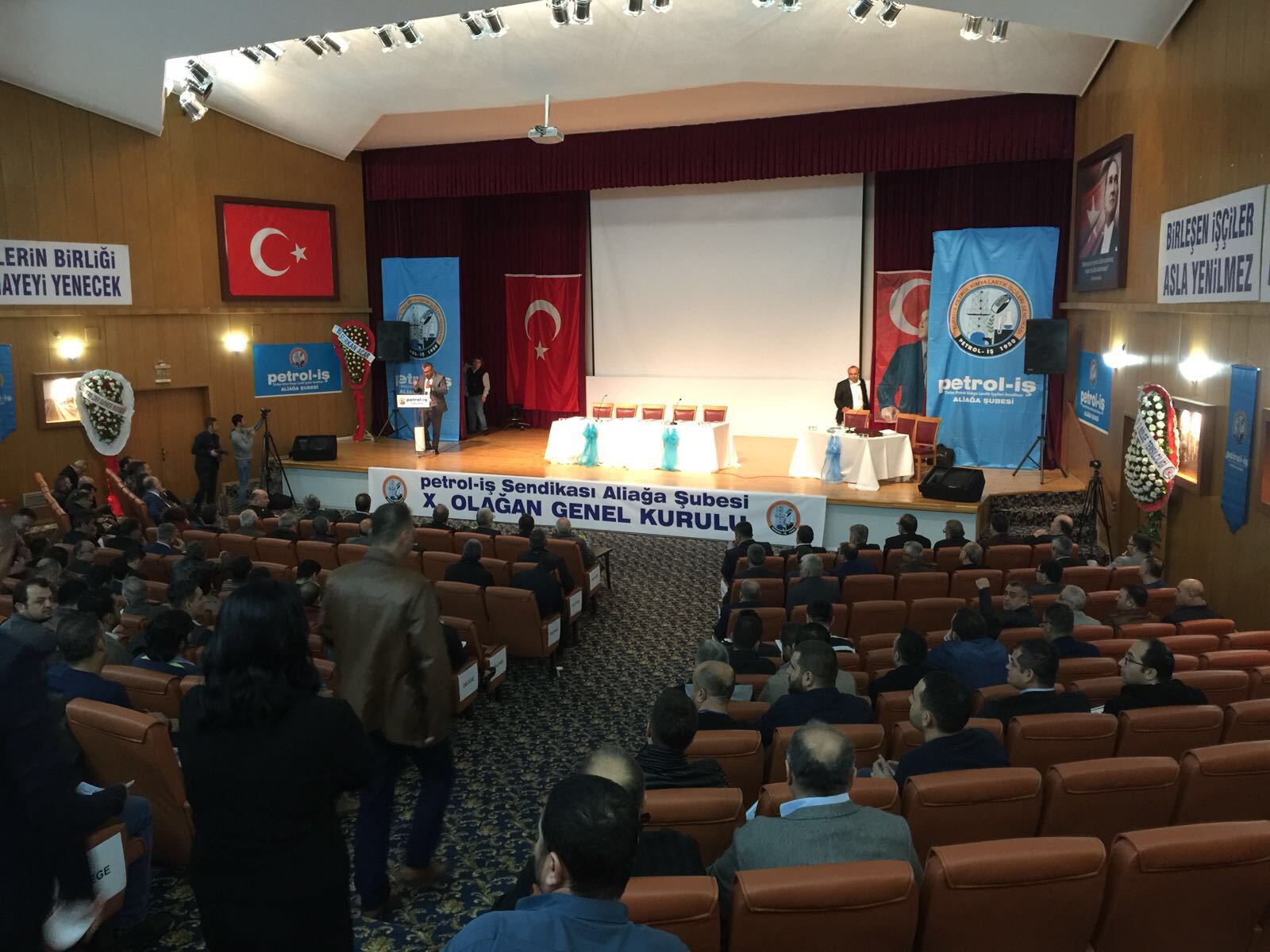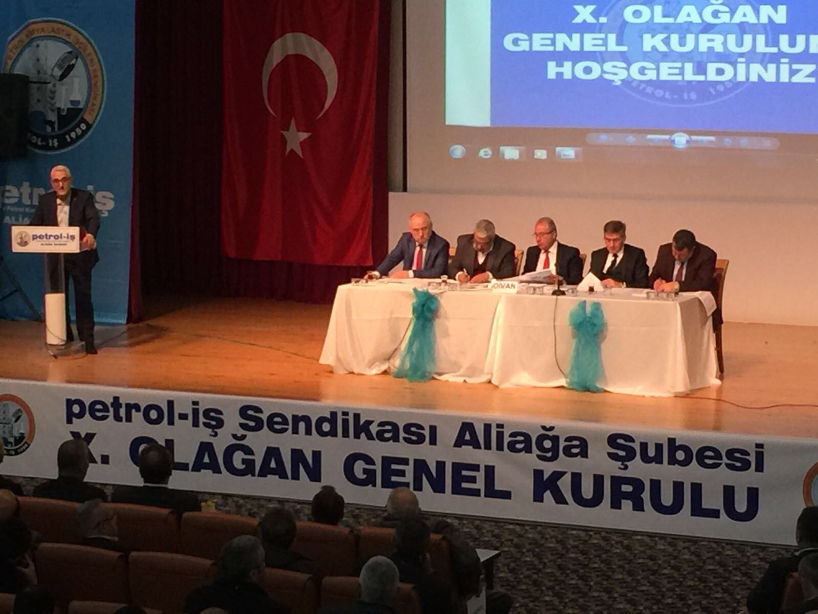 Aliağa Şubemizin 10.Olağan Genel Kurulu’na Petrol-İş Merkez Yönetim Kurulu üyeleri, Denetim ve Disiplin Kurulu üyeleri, şube başkanları, şube yöneticileri, şubemizin örgütlü olduğu işyerlerinden temsilciler ve üyelerimiz de katıldı.