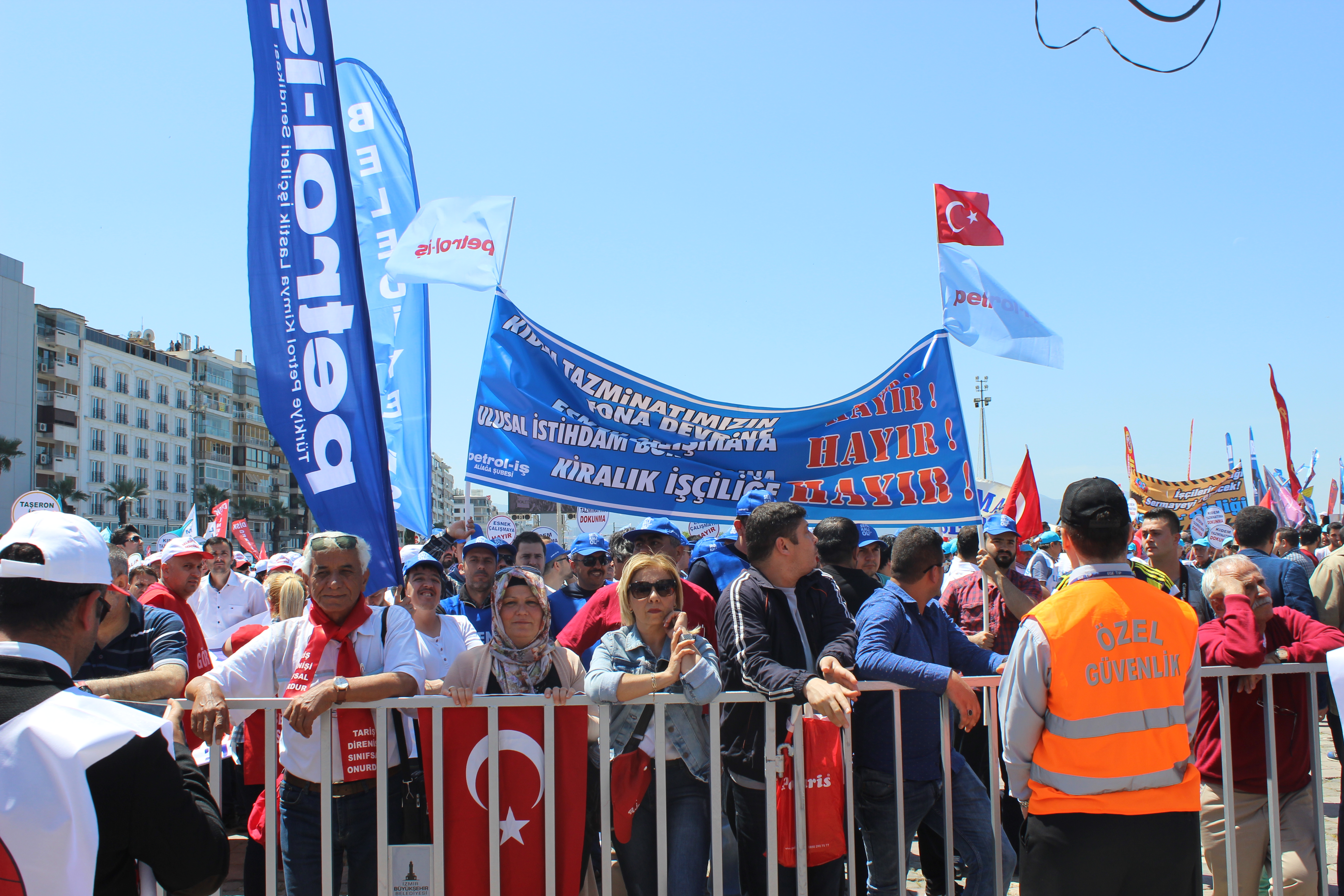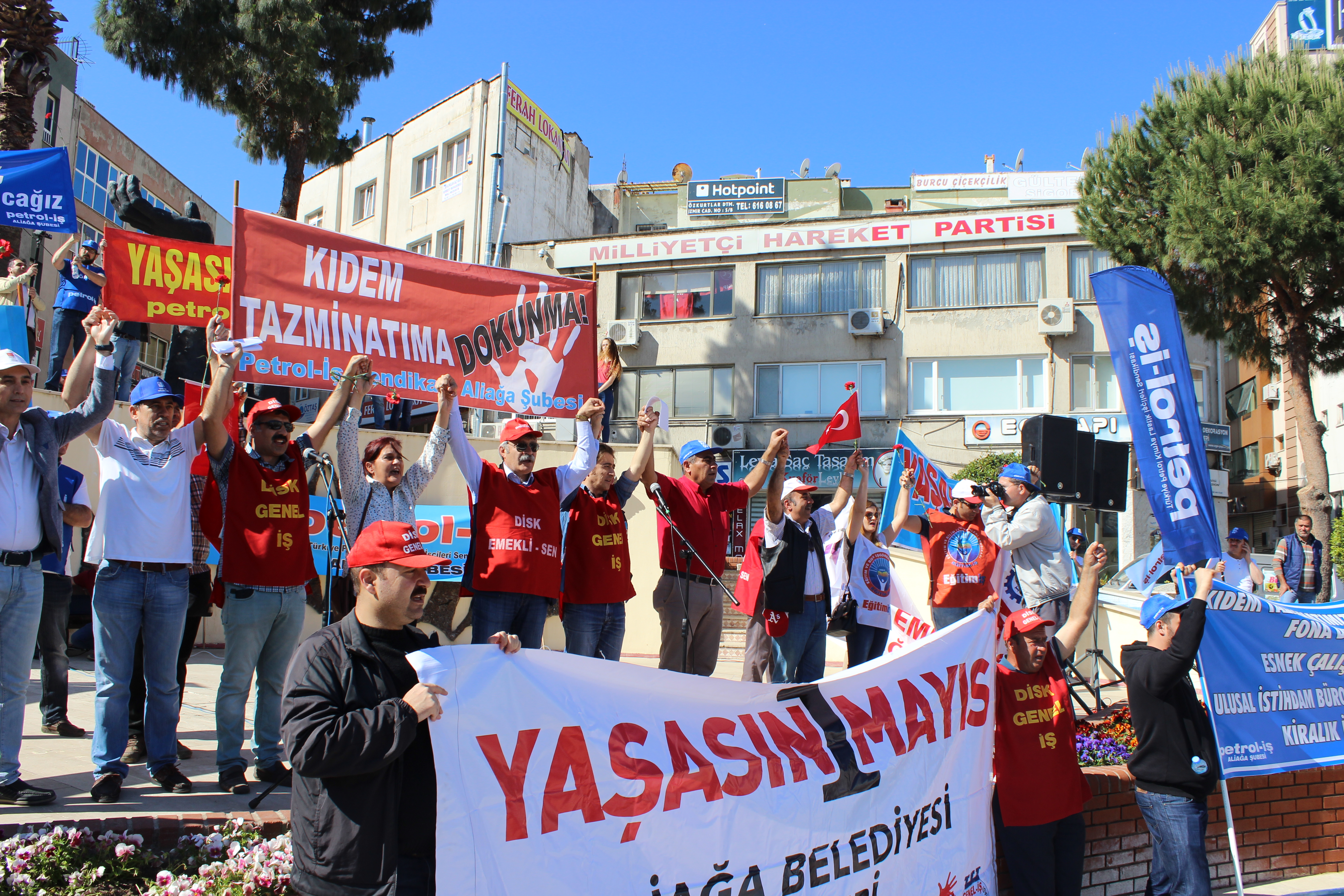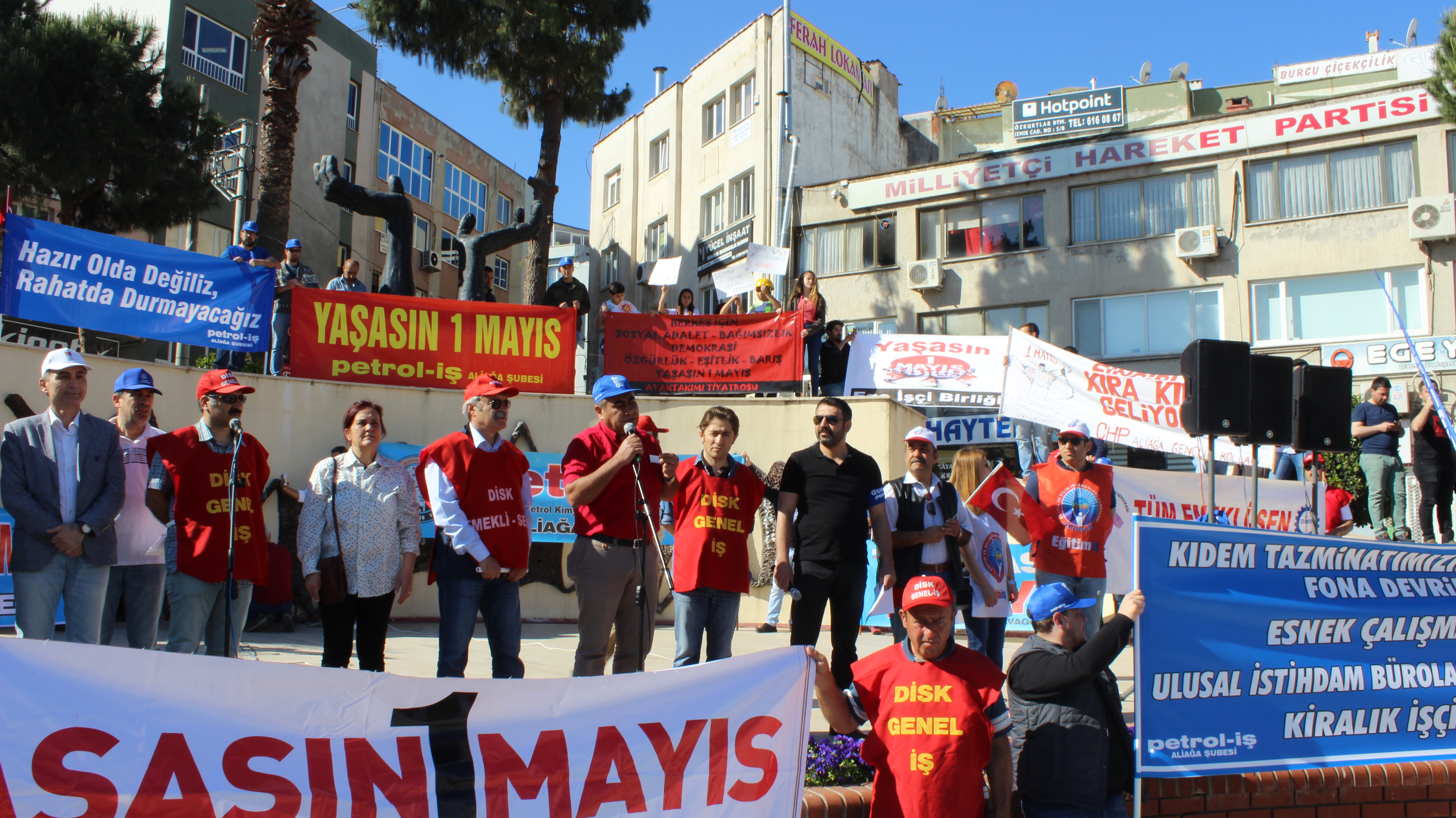 Petrol-İş Aliağa Şube Başkanı Ahmet Oktay “ Aliağa işçi ve emekçi kentidir, Aliağa 35 yıldır emeğini savunmuştur, işçi sınıfının mücadelesini yapmıştır ama Aliağa hiçbir zaman siyaset yapmamıştır. Bizim bu güne kadar siyasetimiz işimiz, ekmeğimiz ve geleceğimizdir” dedi. Ahmet Oktay’ın ardından Emek ve Demokrasi Platformu adına Genel İş Sendikası temsilcisi Doğan Şah Aydın söz aldı. Aliağa’da 1 Mayıs coşkusu, yapılan basın açıklamasının ardından sona erdi.
