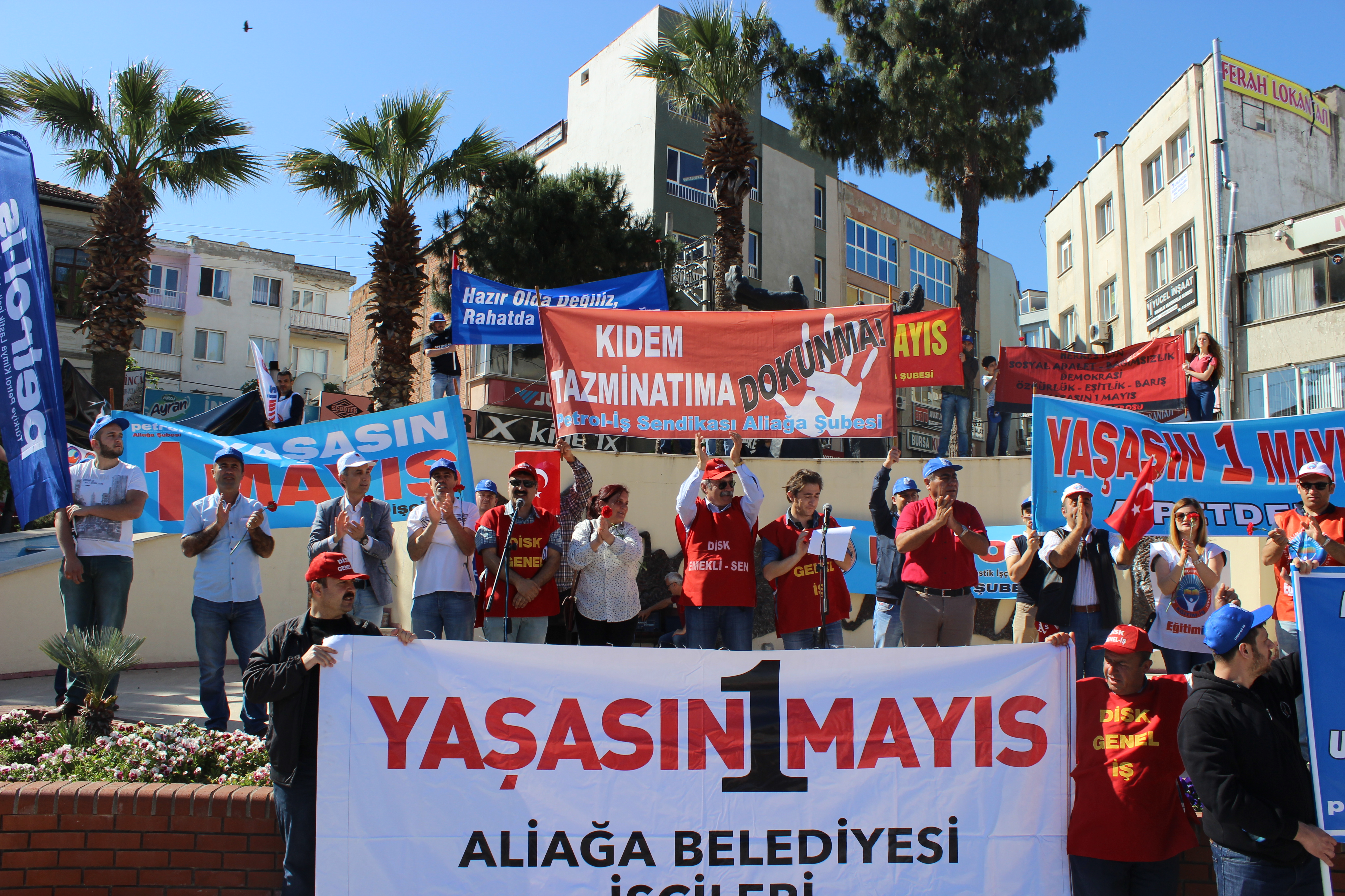 Aliağa Şubemiz işçi sınıfının Uluslararası Birlik, Mücadele ve Dayanışma Günü 1 Mayıs’ı, sabahın erken saatlerinden itibaren örgütlü olduğu işyerlerinden üyelerimizin katılımıyla halaylar eşliğinde kutlamaya başladı. Vardiyadan çıkan üyelerimiz ve Emek ve Demokrasi Platformu bileşenleriyle Şube önünde buluşarak, ‘Yaşasın 1 Mayıs”, “İşte 1 Mayıs Alanlardayız”, sloganlarıyla Aliağa Demokrasi Meydanı’na kortej eşliğinde yürüdü. Esnaf ve vatandaşın alkışlarıyla destek verdiği işçiler; “İş Ekmek Yoksa Barış da Yok”, “Direne Direne Kazanacağız”, “Kölelik Yasanı Al Başına Çal”, “Yaşasın 1 Mayıs Alanlardayız” sloganları attılar.