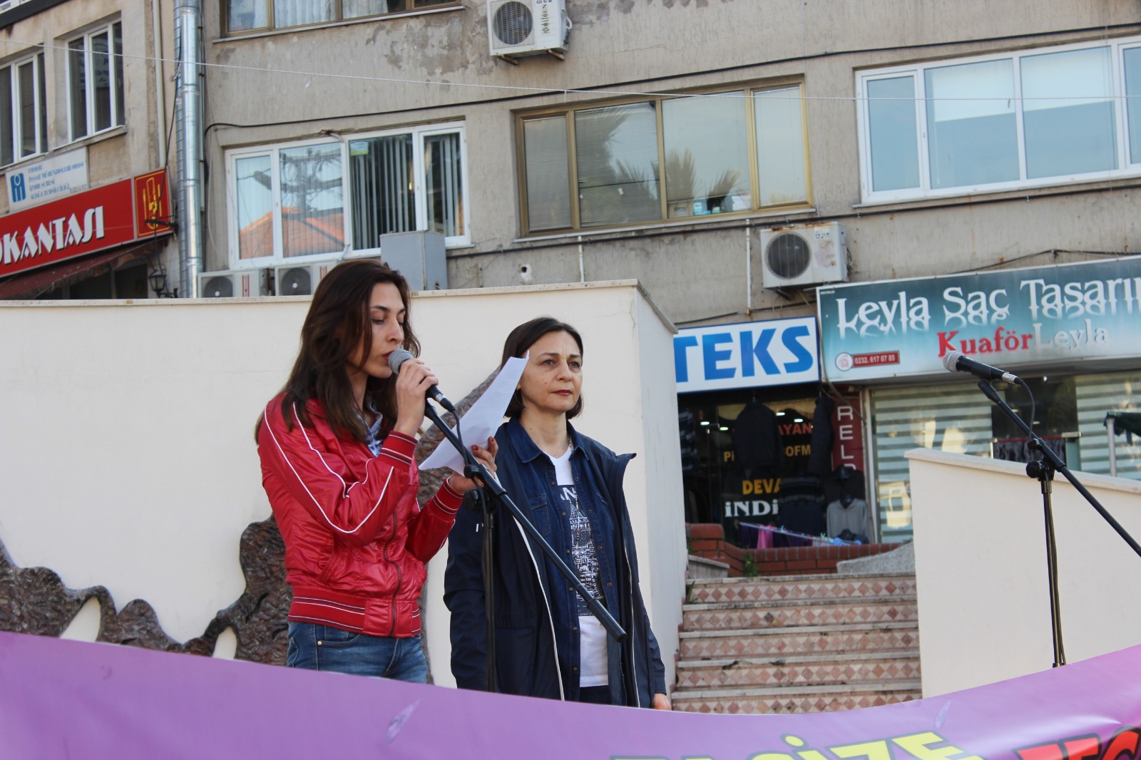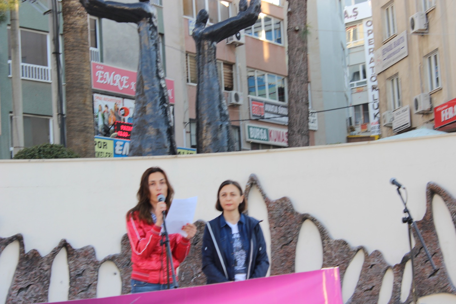 Günün anlam ve önemini belirten konuşmayı Emek ve Demokrasi Platformu adına Aliağa Eğitim Sen üyesi Deniz Gültekin okudu. Gültekin, “Bundan 162 sene önce 8 Mart 1857’de New York’ta çalışma saatlerinin iyileştirilmesi ve ücretlerde artış yapılması talebiyle greve başlayan 40.000 dokuma işçisi kadın o güne kadar yapılmış en kitlesel kadın eylemiyle greve gitmiş, polisin kadın işçilere saldırması sonucu kendini fabrikaya kilitleyen 129 kadın işçi çıkan yangın sonucu hayatını kaybetmiştir. 1921 ‘de Moskova’da yapılan 3. Uluslararası Kadın Konferansında 8 Mart’ın Dünya Emekçi Kadınlar Günü olarak kutlanmasına karar verilmiştir. 8 Mart kadınların asırlardır verdiği özgürlük ve eşitlik mücadelesinin sembolüdür. Bugün Türkiye ‘de ve dünyada kadınlar olarak hep bir ağızdan eşitlik, adalet, özgürlük, emek, barış ve demokrasi talepleriyle alanları doldururken, kadın hakları mücadelesinde bedel ödemiş tüm kadınların bıraktığı mirasa sahip çıkıyor, ataerkil sistemin bir sonucu olarak kadın cinayetine kurban giden tüm kadınları bir kez daha yad ediyoruz. Aynı zamanda direnişlerinin 297. gününde anlaşma sağlayarak direnişlerine son veren Flormar işçisi kız kardeşlerimize de buradan selam gönderiyoruz. Erkek egemen sistemin neresinden tutsak elimizde kalıyor anlayacağınız. Ekonomik, siyasal ve sosyal olarak haklarımıza ve kazanımlarımıza dönük saldırıları arttıran cinsiyetçi politikaların sonucu; Ülkemizde kadın cinayetlerindeki, çocuk istismarındaki, kadına yönelik her türlü şiddet ve tacizdeki artışı, kriz ekonomisiyle beraber kadın istihdamındaki düşüş takip ediyor. Bir yandan iyi hal, haksız tahrik gibi indirimler, çocuk istismarı sonucu açılan davalarda çıkan kararlarla kadın ve çocuklara yönelik şiddetin / istismarın önü açılırken, diğer yandan krizin de etkisiyle kadınlara güvencesiz, niteliksiz, esnek ve eşitsiz çalışma koşulları dayatılıyor. Aile içi şiddet ve benzeri sebeplerle boşanmak isteyen kadının boşanması zorlaştırılmaya çalışılırken kadının nafaka hakkına göz dikilerek durum kadın aleyhine hepten zorlaşıyor. Okula yollanmak yerine çocuk yaşta evlendirilen, aile içinde ekonomik şiddete maruz kalan / maaşına kocası tarafından el konulan, hamile olduğu için işten atılan kadınları tartışmak yerine nafaka mağduru erkekleri tartışıyor olmaları bile durumun vahametini gözler önüne seriyor.” İfadelerine yer verdi.