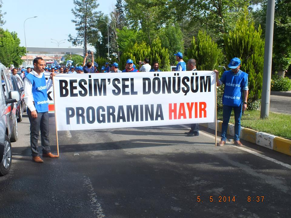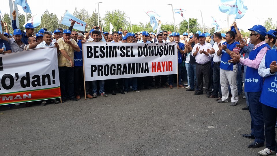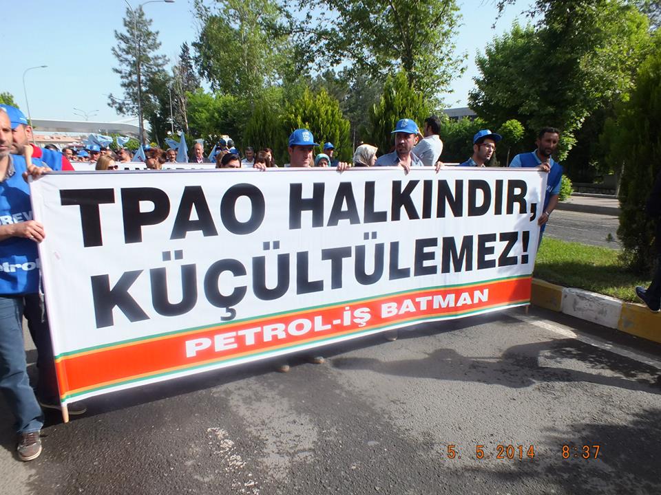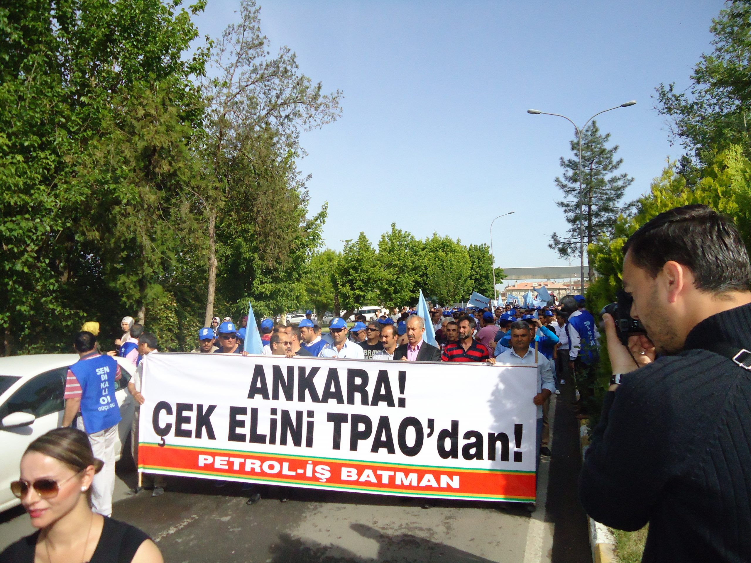 Petrol-İş Genel Başkanı Mustafa Öztaşkın ile Sendika Genel Örgütlenme ve Eğitim Sekreteri Nimetullah Sözen’in de hazır bulunduğu Batman’daki iş bırakma eyleminde, Saat 9.00’da itibaren Bölge Müdürlüğü dış kapısı önünde yüzlerce sendika üyesi toplandı. Petrol-iş üyeleri daha sonra “TPAO halkındır küçültülemez” “Besim’le dönüşüm programına hayır”, “Ankara çek elini TPAO’dan” pankartları, “TPAO bizimdir bizim kalacak” sloganı eşliğinde TPAO Bölge Müdürlüğü binasına doğru yürüdüler.