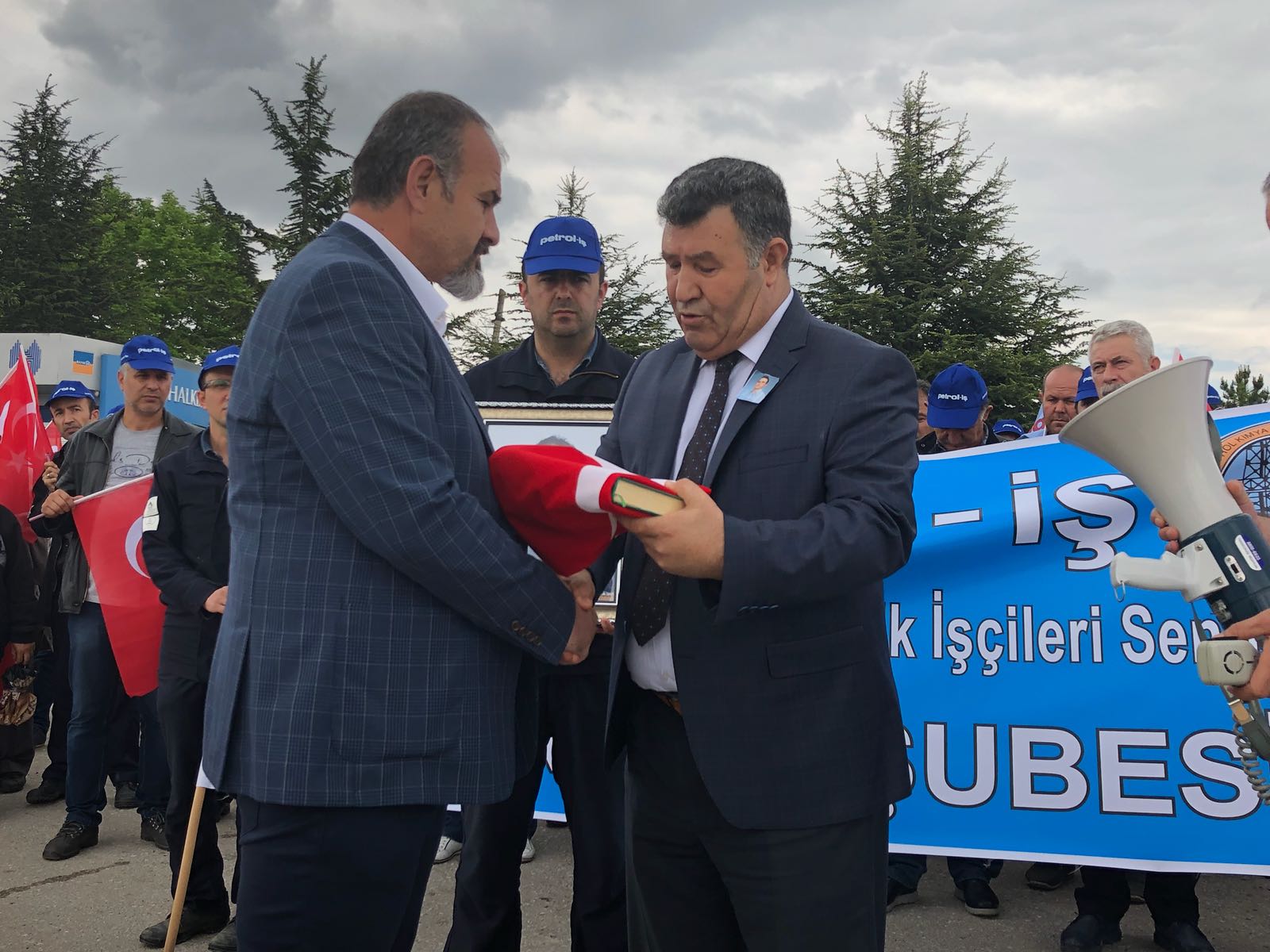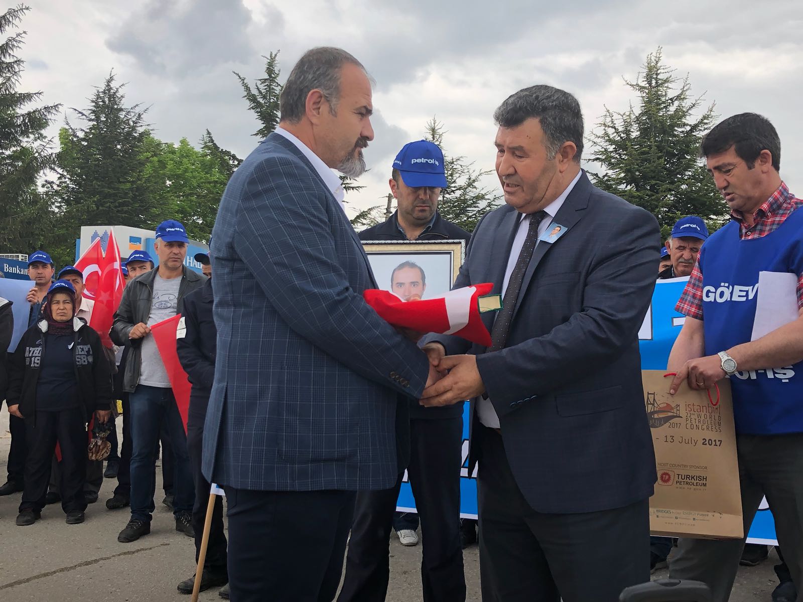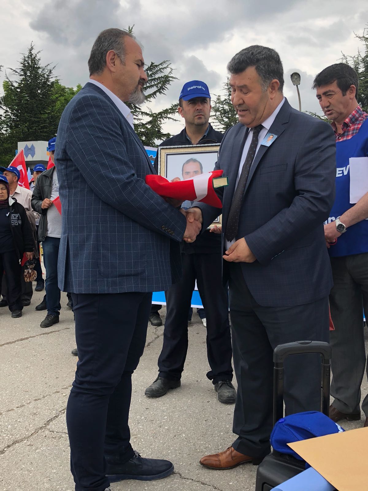 Ankara Şube Başkanımız Şuayip Gül basın açıklamasının ardından vefat eden üyemiz Emre ÖZCAN’ın yakınına Türk Bayrağı ve Kuranı Kerim takdim ederek başsağlığı diledi.