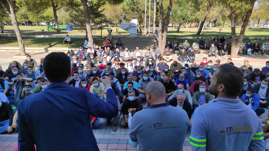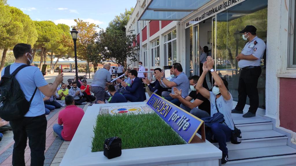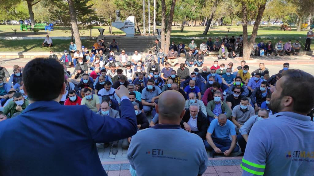 Sendikamız Bandırma Şubesi ve Türkiye Maden-İş Sendikası 10 Eylül Cuma günü Eti Maden İşletmeleri Genel Müdürlüğü ile devam eden toplu sözleşme görüşmelerine ilişkin ortak basın açıklaması gerçekleştirdi. Saat 16.00’da Eti Maden İşletmeleri Genel Müdürlüğü’ne bağlı Bigadiç-Emet-Kırka işyerlerinde toplu iş sözleşmeler ile ilgili eylem kararı alan Maden-İş Sendikası ile ortak yapılan basın açıklamasının ardından, Bandırma Eti Maden Fabrikalarında oturma eylemi yapıldı.
