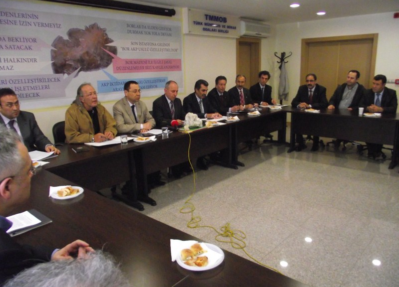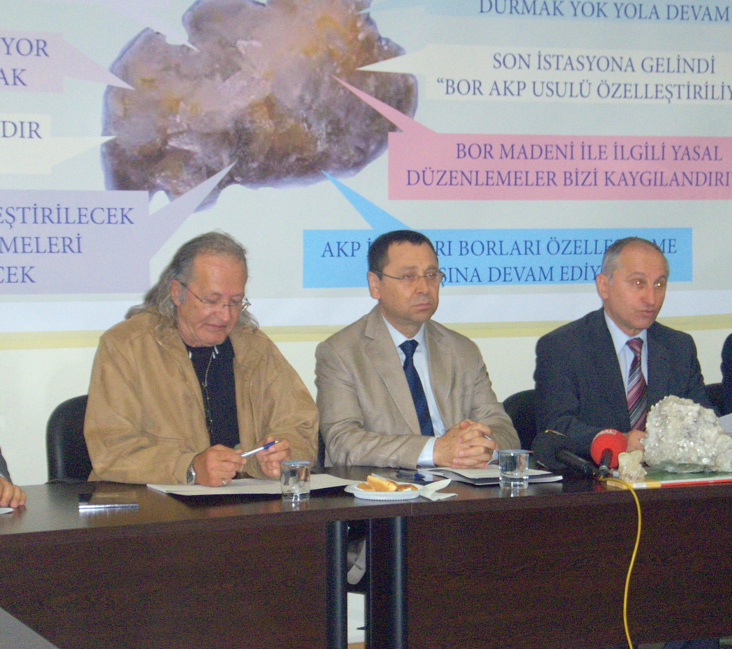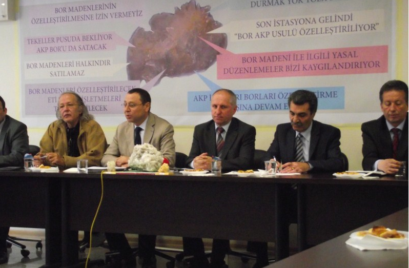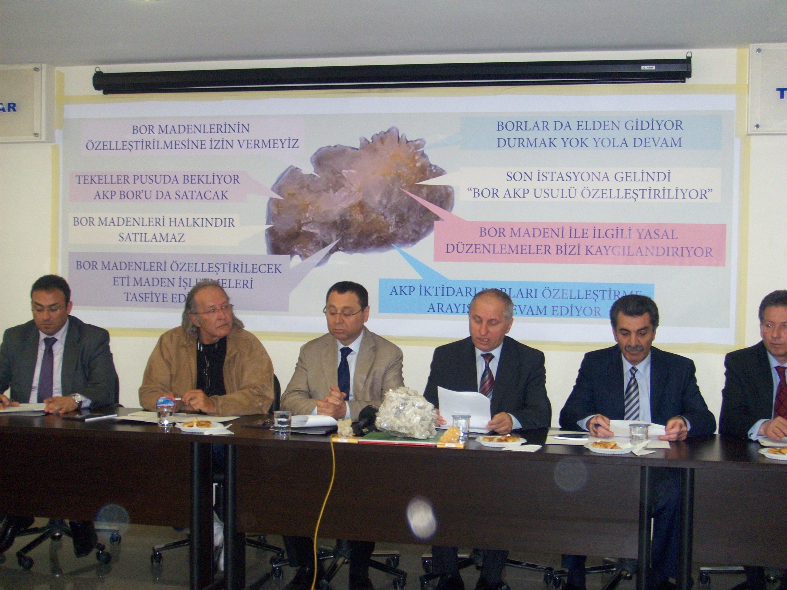 Bor madenlerinin ve bor ürünleri üretiminin özel sektöre devredilmesine yol açacak düzenlemeye karşı ortak tavır geliştirme kararı veren Eti Maden’de örgütlü sendikalar Petrol-İş, Maden-İş Sendikası, ESM, Türk Enerji-Sen, TMMOB Jeoloji Mühendisleri Odası, TMMOB Kimya Mühendisleri Odası, TMMOB Maden Mühendisleri Odası, TMMOB Metalurji Mühendisleri Odası başkanlarının katılımıyla Ankara’da TMMOB Genel Merkezi’nde 20 Nisan’da ortak basın toplantısı düzenlendi.