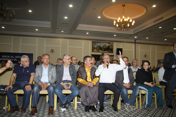 SGBP’nun çalışmalarına da değinen genel başkanımızın açılış konuşmasında altını çizdiği konulardan bir diğeri de çalışma yaşamında hükümetin işçi sınıfına yönelik saldırıları oldu. Öztaşkın kıdem tazminatının sınıfın elinde kalan son kalelerden biri olduğunu belirttikten sonra şöyle devam etti: “ Kıdem tazminatı düzenlemesinde sorun var, algısı yaratılmaya çalışılıyor. Öncelikle bu algıyı kırmalıyız, kıdem tazminatı düzenlemesinde bir sorun yoktur. Bu bizim kazanılmış hakkımızdır ve kazanılmış haklar bize emanettir, onları bizden öncekilerden devraldık, çocuklarımıza ileteceğiz, çocuklarımızın geleceğine ipotek kurulmak isteniyor. Bunu kabul edemeyiz”