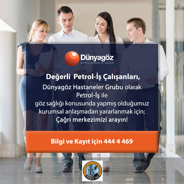 Sendikamızda örgütlü üyelerimizin, göz sağlığı hizmetlerinden daha uygun ücretlerle hizmet alabilmesi için Dünya Göz Hastanesi San. ve Tic. A.Ş. ile anlaşma sağlandı. Ayrıca, dönemlik yapılacak özel kampanyalardan da, üyelerimizin haberdar edilerek yararlanmaları sağlanacaktır.