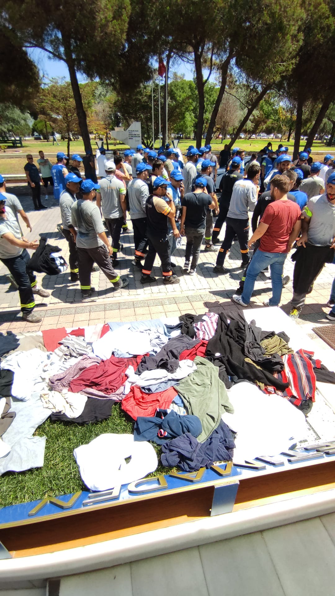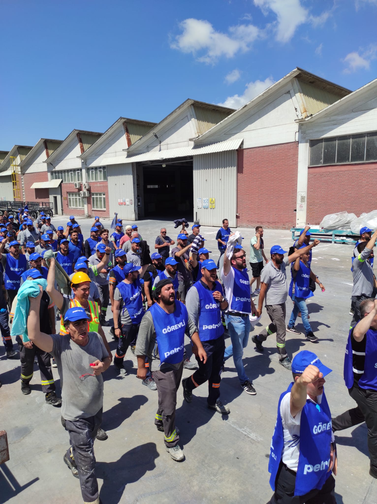 19 Temmuz Çarşamba günü saat 11.45’te fabrika sahası içerisinde sloganlarla yürüyüşün ardından “GİYİM ÇEKLERİ” ile ilgili durumu protesto etmek için müdüriyetin önüne tişörtler atılarak tepki gösterildi.