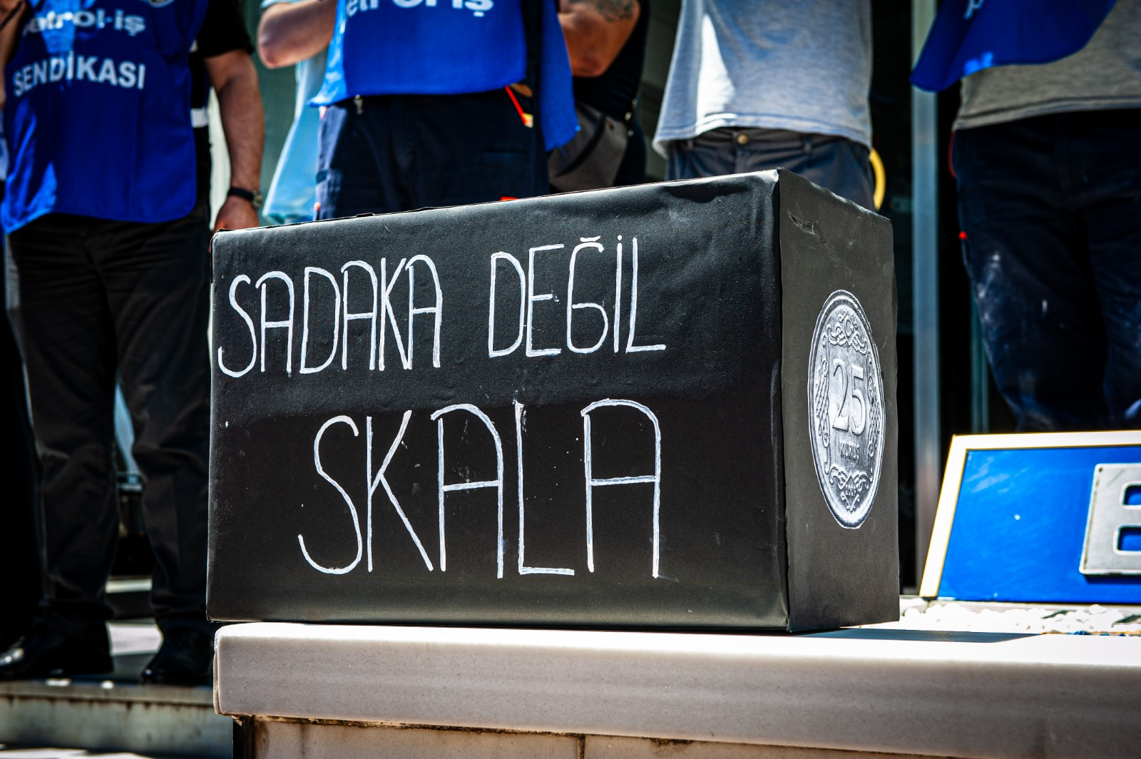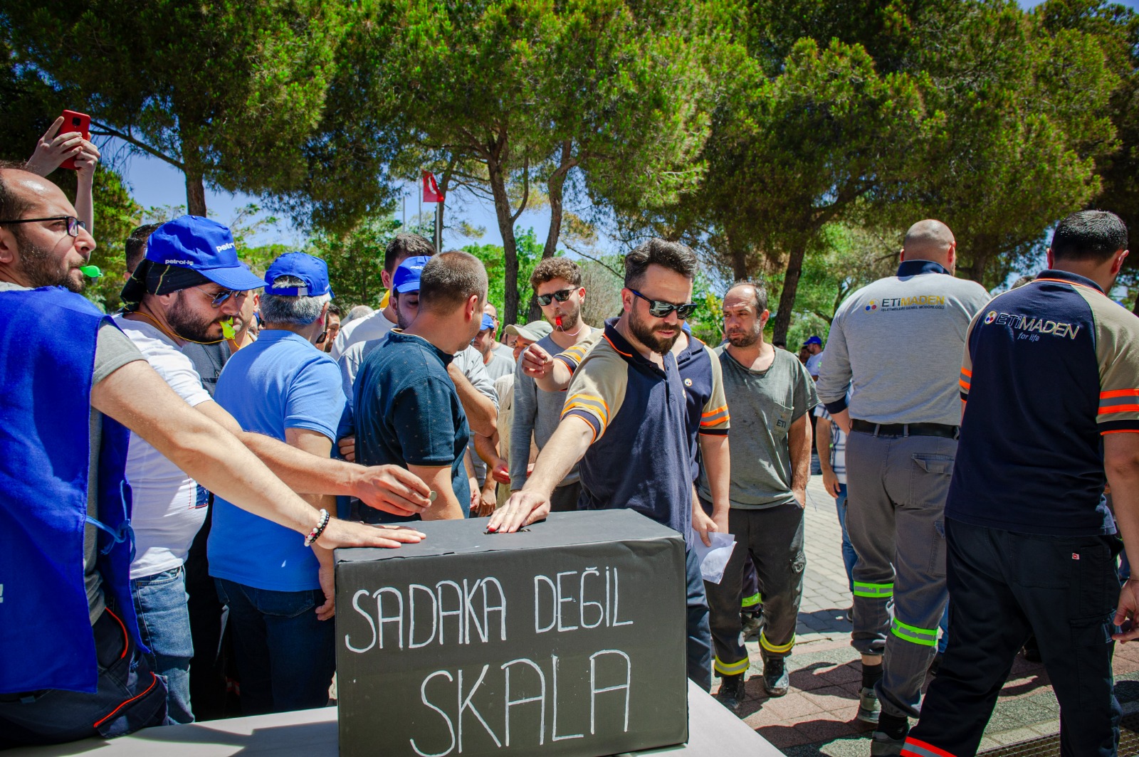 Eti Maden İşletmeleri işyerinde eylemlilik sürecimiz ikinci ve üçüncü gününde de devam etti. 18 Temmuz Salı günü saat 11.45’te şube yönetimi ve üyelerimiz fabrika sahasında sloganlarla yürüyerek müdüriyet önüne ulaştılar. Daha sonra şubemiz tarafından hazırlanan “SADAKA DEĞİL, SKALA” sandığına tüm üyelerimiz 25 kuruş atarak tepki gösterdi.