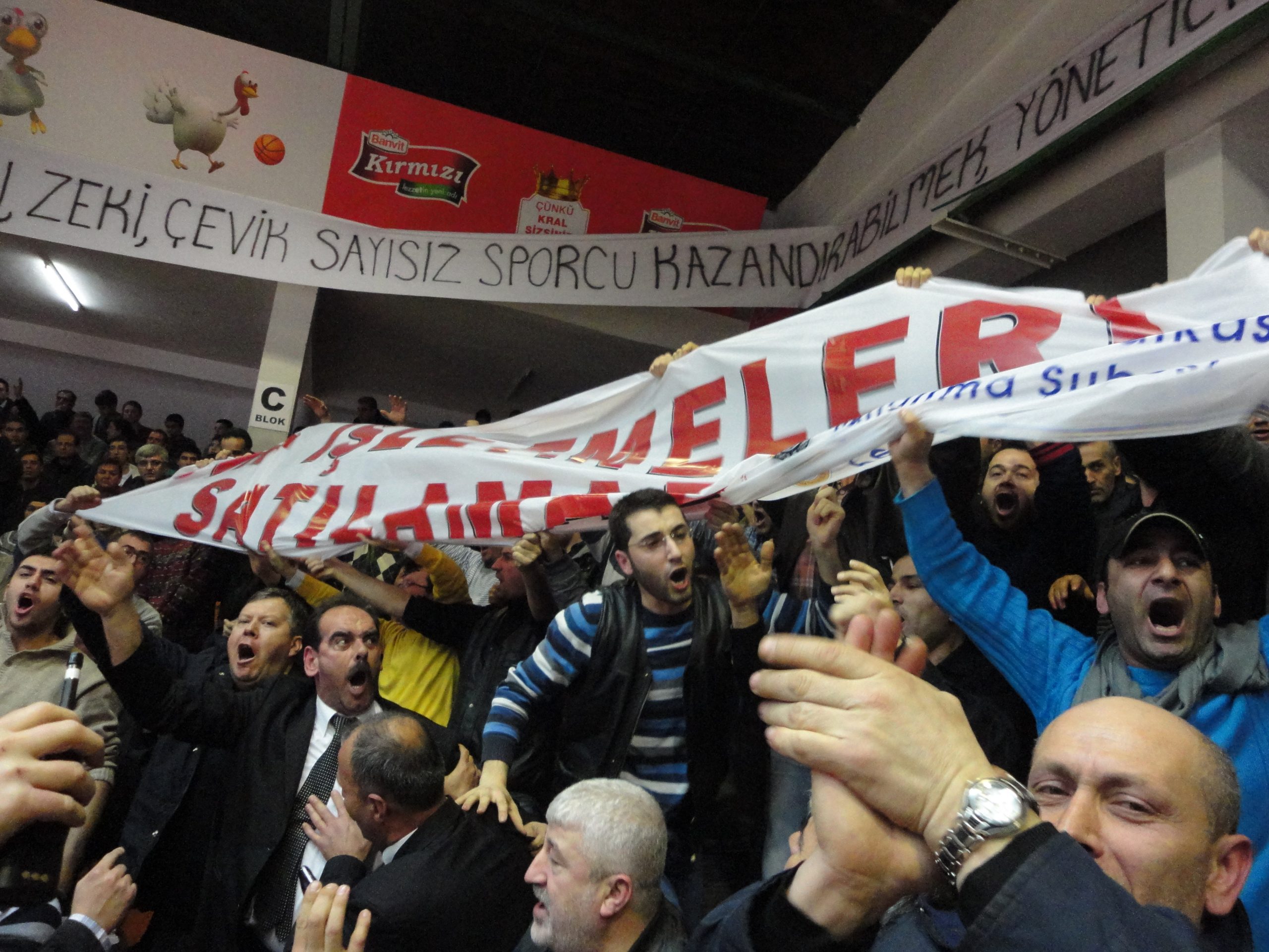 Bor işçisi sahaya indi. Bandırma’da şu anda oynanmakta olan Bandırma Banvitspor- Galatasaray karşılaşması için tribündeki yerini alan yüzlerce bor çalışanı, karşılaşmanın başlaması ile birlikte içlerine giydikleri eylem önlüklerini çıkartarak, bor madenlerinin özelleştirilmesini protesto ettiler.