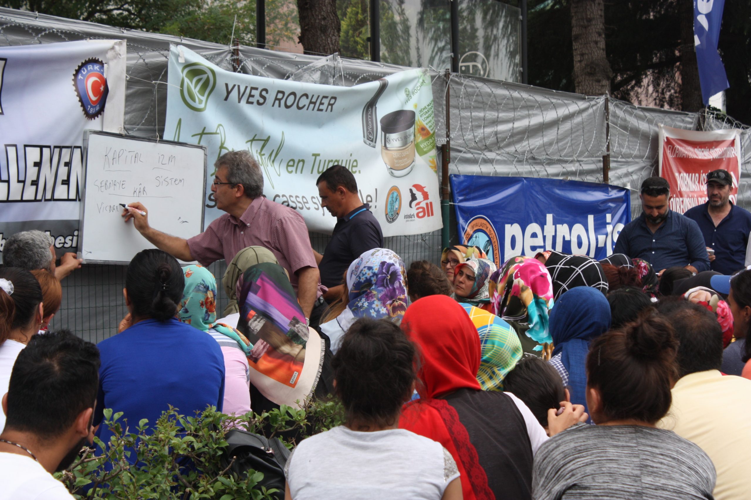 Petrol-İş pankartları ve flamaları önünde, tabureler üzerinde eğitime katılan direnişçi işçiler, ders saati boyunca Erhan Kaplan Hocanın anlattıklarını dikkat ve ilgi ile dinledi. Dersin başlangıcında, kapitalist sistemin hangi esaslar üzerine kurulduğu gerçeği Flormar işçilerinin işten atılması süreci ile ilişkilendirilerek, kapitalizmin kar mantığı üzerine kurulu bir sistem olduğu vurgulandı. Sonrasında, Petrol-İş’in geçmiş dönemde büyük bir mücadele sonucu örgütlediği Novamed işyerinde verilen mücadele  ile Flormar işçilerinin mücadelesinin aynı olduğu, işçilerin  insan onuruna yaraşır iş, ücret ve çalışma koşulları dışında bir taleplerinin olmadığı belirtildi.