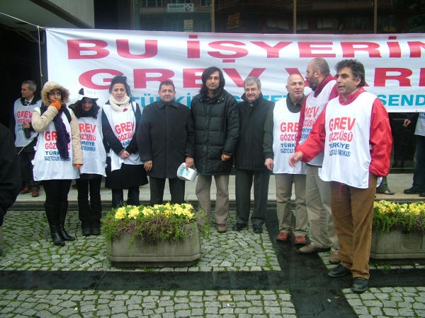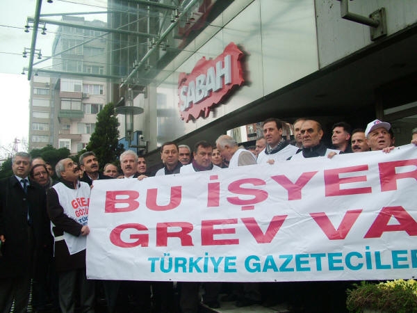 TGS Başkanı Ercan İpekçi, ''Bu iş yerinde grev vardır'' yazılı pankartın asılmasının ardından yaptığı konuşmada, 26 Haziran 2008'de Turkuvaz grubuyla başlayan toplu iş sözleşmesi görüşmelerinde 22 maddede anlaşma sağlandığını, ancak sonrasındaki süreçte tüm girişimlerin sonuçsuz kalması sonucu grev aşamasına gelindiğini belirtti. İnsan Hakları Evrensel Beyannamesi'nin ''Herkesin menfaatlerinin korunması için sendika kurmaya ve bunlara katılmaya hakkı vardır'' maddesinin yanısıra Anayasa'nın da ''Sendikalara üye olmak ve üyelikten ayrılmak serbesttir. Hiç kimse sendikaya üye olmaya, üye kalmaya ve üyelikten ayrılmaya zorlanamaz. Herhangi bir iş yerinde çalışabilmek, işçi sendikasına üye olmak veya olmamak şartına bağlanamaz'' hükümlerini içerdiğini kaydeden İpekçi, ''İnsan hakları, Anayasa, demokrasi kavgası veriyoruz'' diye konuştu.