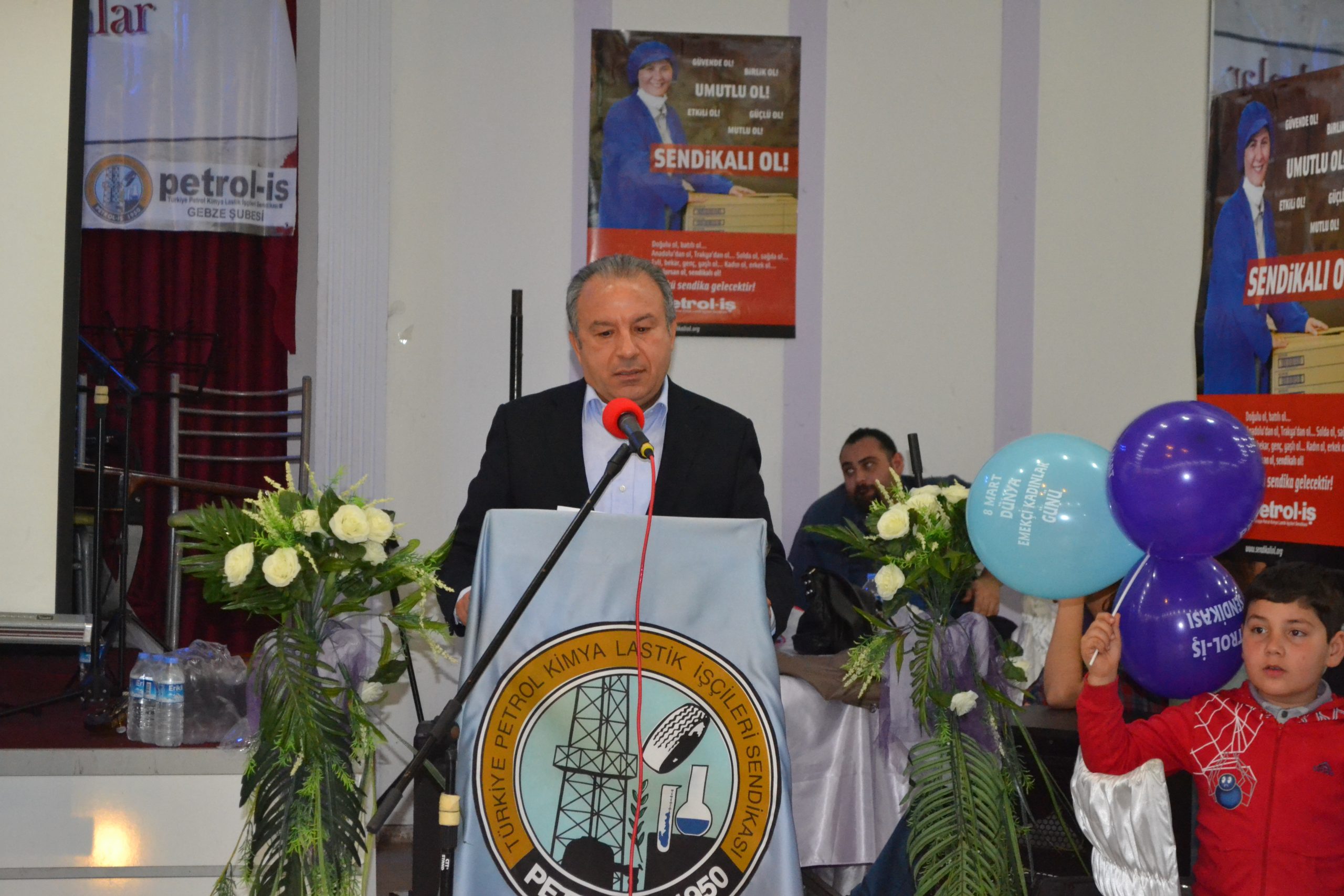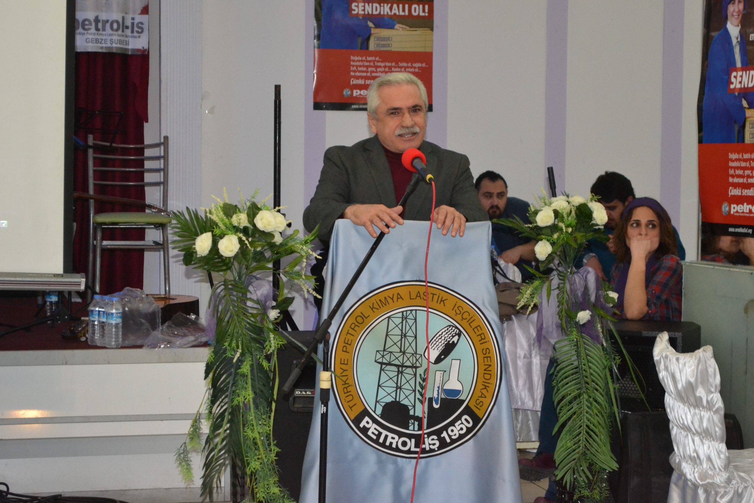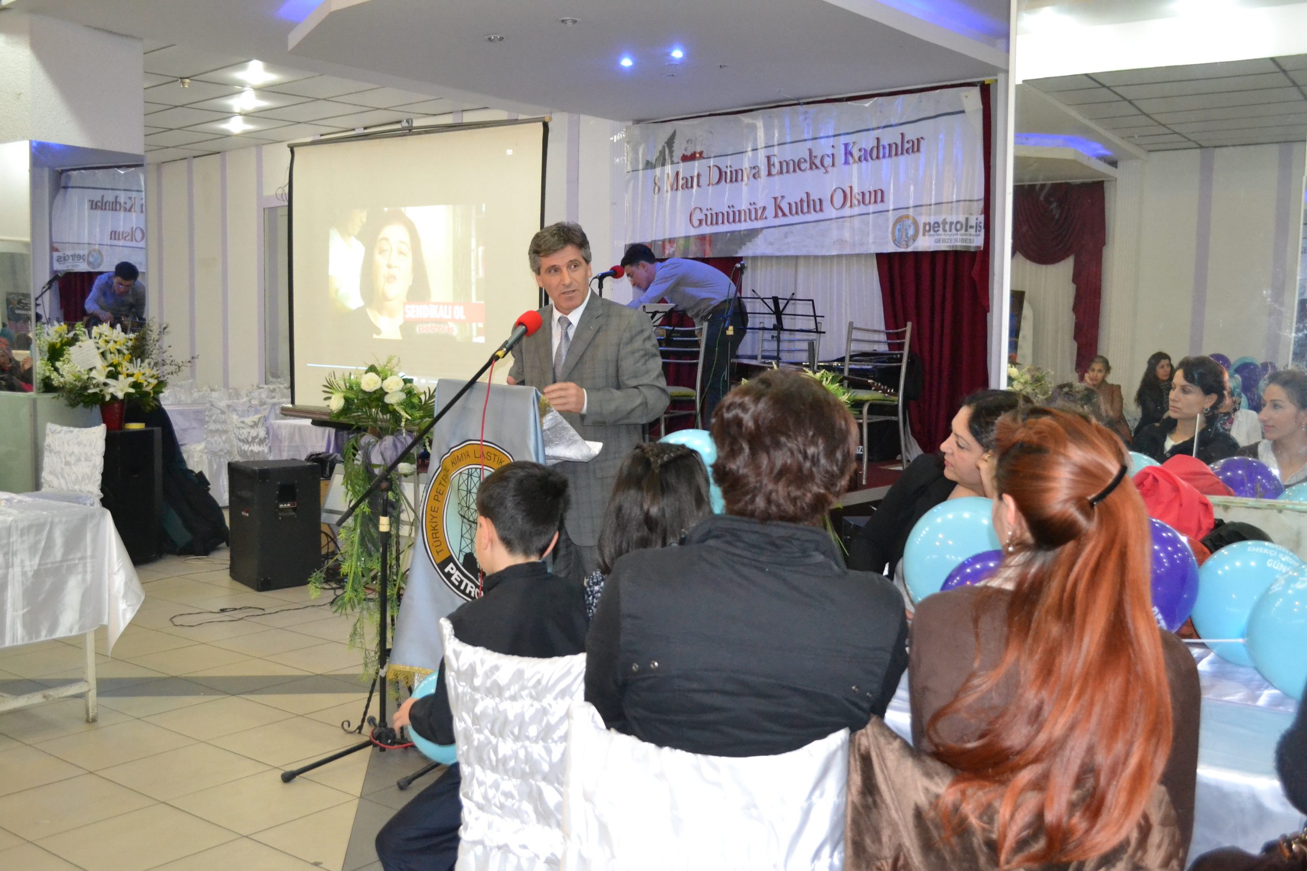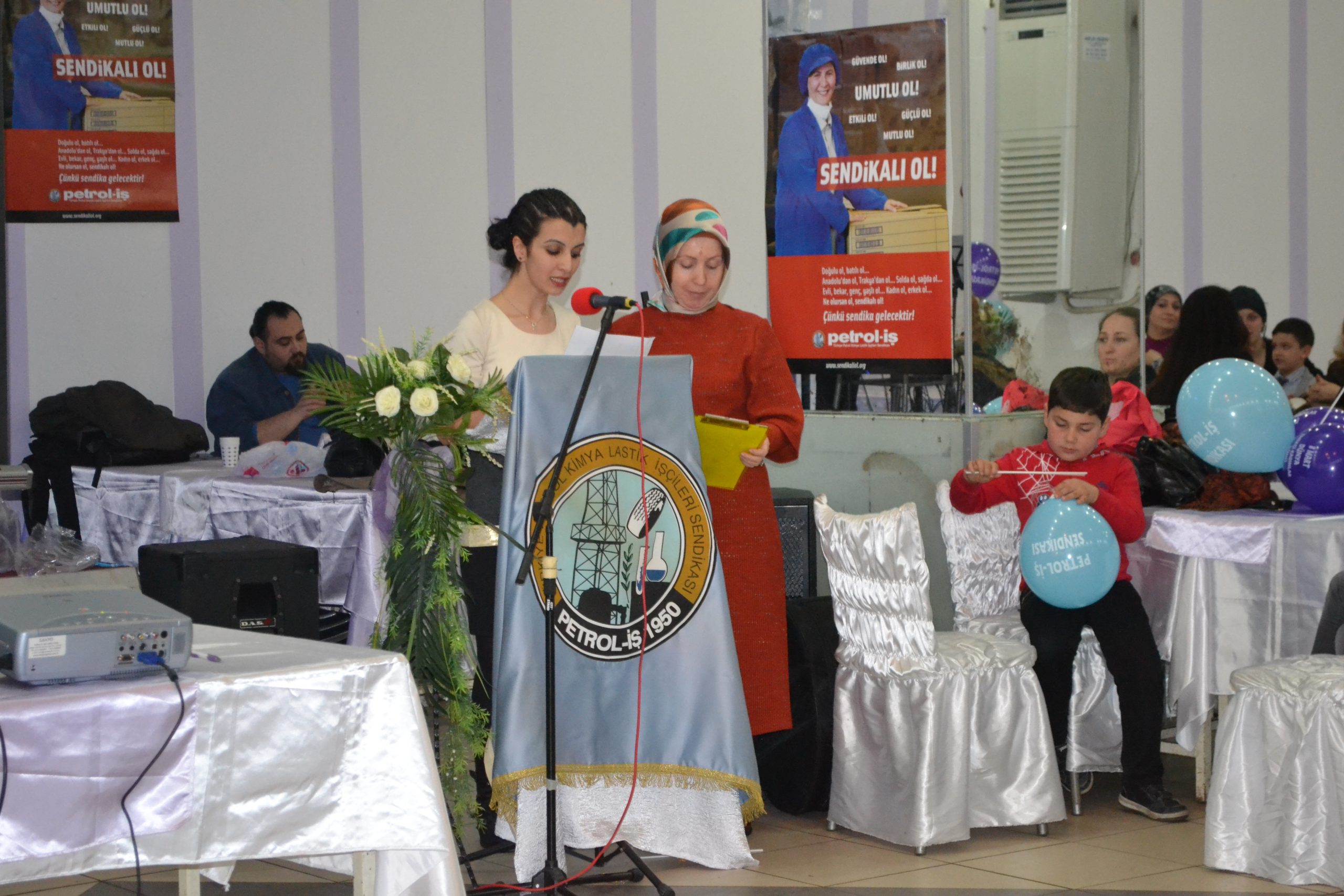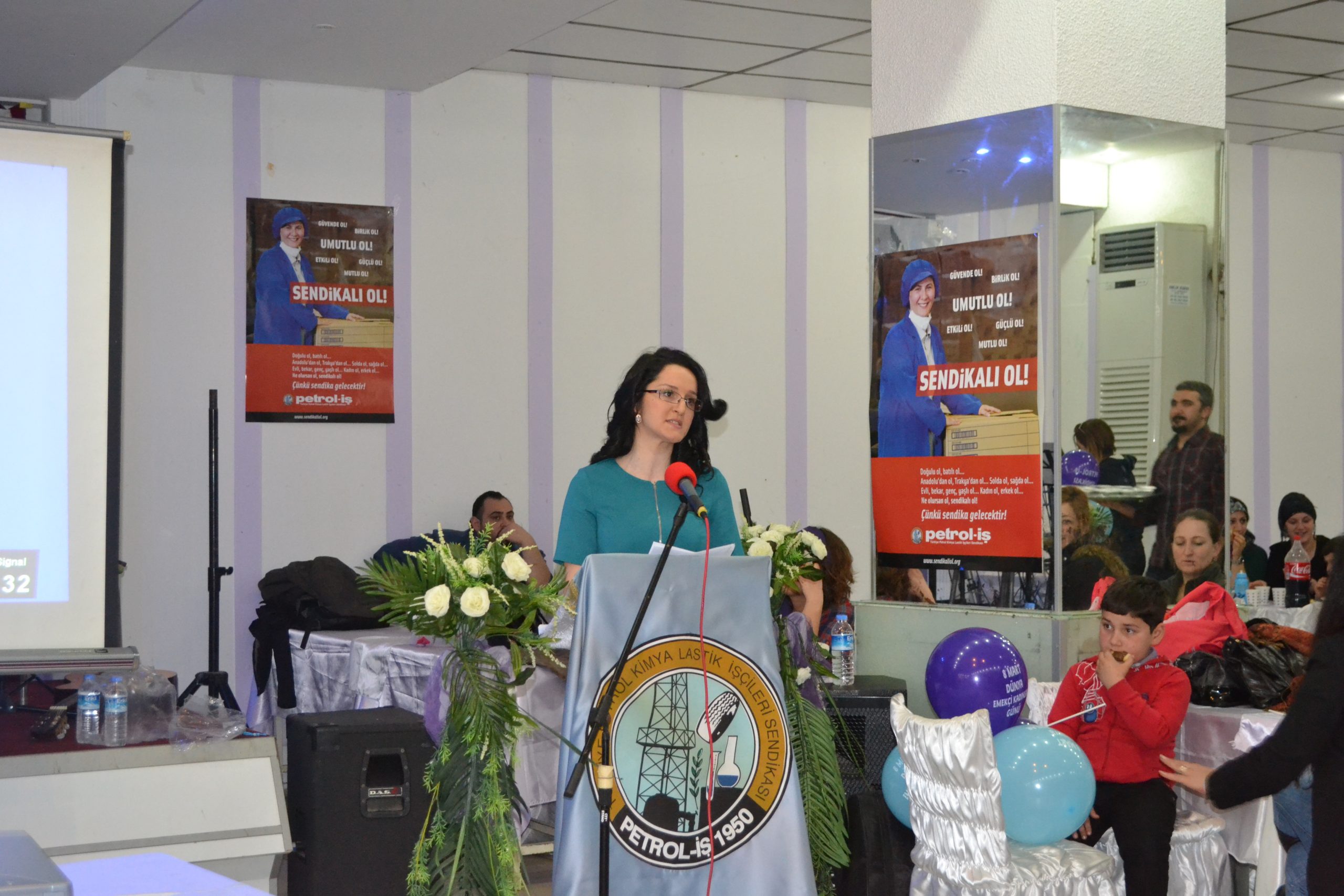 Sunuculuğunu Mecaplast işyeri temsilcisi Emek Nalbant’ın yaptığı etkinlik, 8 Mart’ın tarihçesini anlatan belgesel film gösterimi ile saat 13.00’da başladı.  Açılış konuşmasını  Gebze Şube Başkanımız Süleyman Akyüz yaptı.  Kadın üyelerimizin  8 Mart’ını kutlayan Akyüz, daha sonra günün anlam ve önemini anlattı. Konuşmasında kadınları emek hareketinin içine katma zorunluluğunun altını çizen Akyüz “Kadınların haklarından mahrum kalması bir insanlık sorunudur.  Sizde de kabahat var. Eşitlik ve özgürlük istiyorsanız bir adım önde durmanız gerekiyor. Sizin de eşitlik için çaba sarfetmeniz lazım. Burada çeşitli fabrikalardan kadın üyelerimiz var. Bir dahaki sefere, erkek üyelerimizin eşlerini bekliyoruz, onlar da katılmalıdır bu etkinliğe.” dedi.