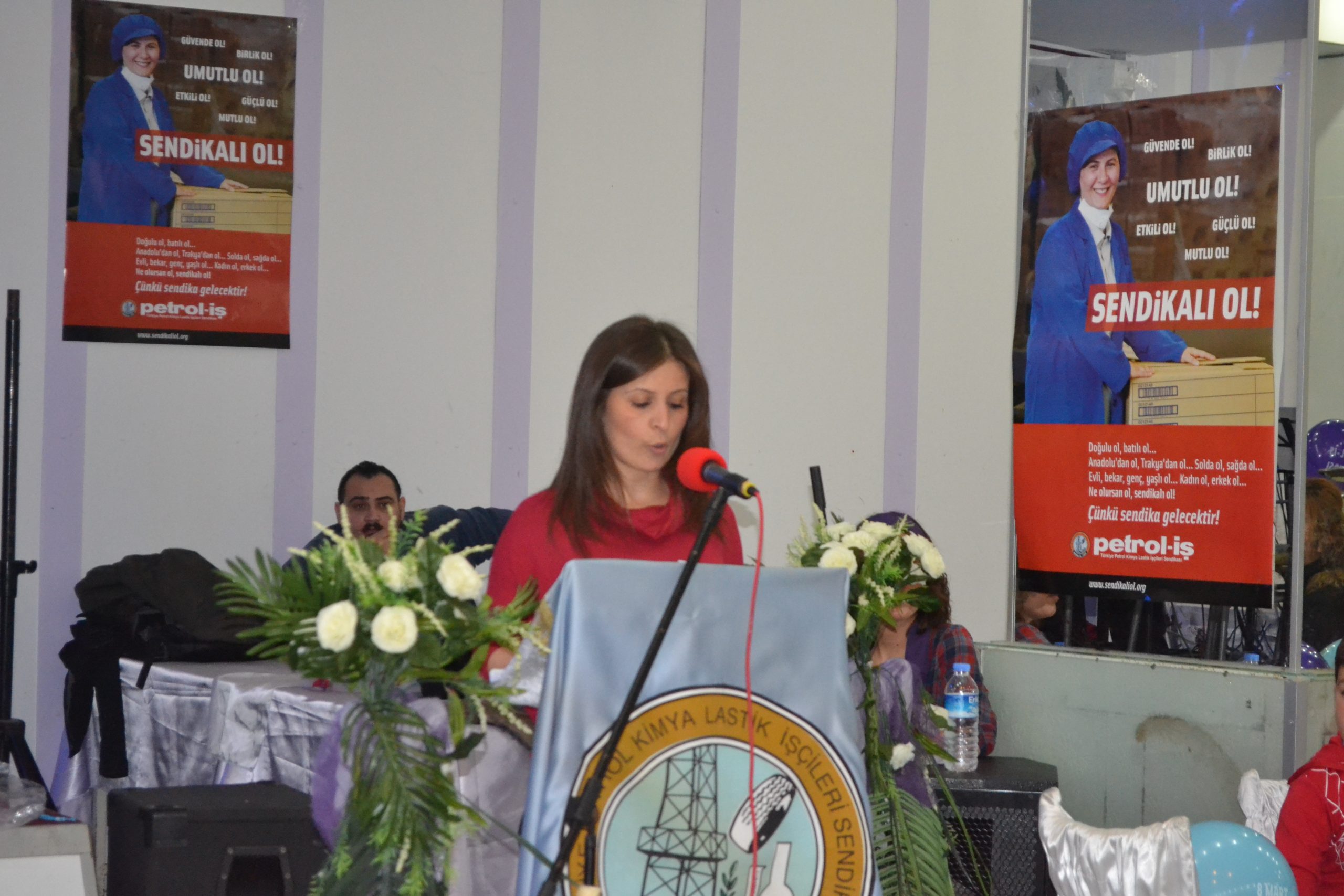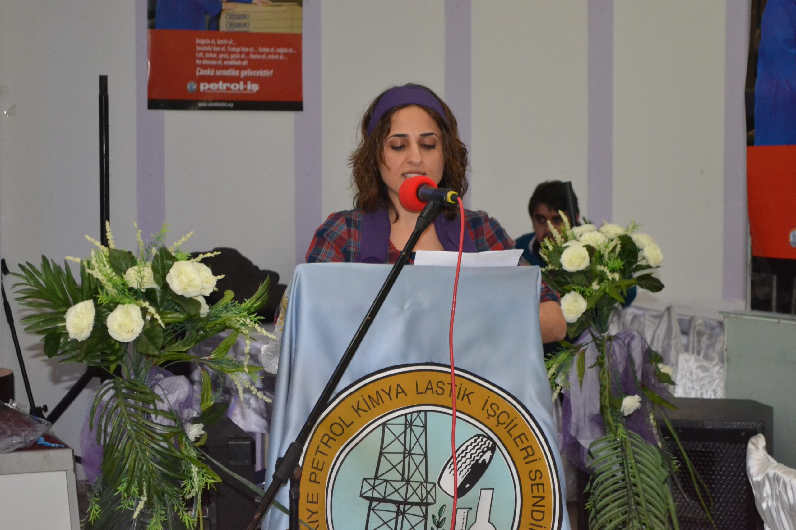 Kadınlara esnek ve yarım zamanlı işleri dayatan AKP Hükümeti’nin, amacının evdeki geleneksel işbölümünün , sürdürülmesi ve kadınların eşlere bağımlılığının iyice artması  olduğunun altını çizdikten sonra sendikalı kadınlar olarak düzenli güvenceli ve sendikalı işler  istediklerini söyleyerek taleplerini şu şekilde sıraladı“ Esnek güvencesiz çalışmaya son. Eşdeğerde işe eşit ücret, çocuklarımızı rahatlıkla bırakabileceğimiz, ücretsiz kreşler ve çocuk bakım evleri istiyoruz. İşyerinde, sokakta, sendikada kadına yönelik şiddete, tacize mobbinge de son verilmesini talep ediyoruz” diyerek sözlerini bitirdi.