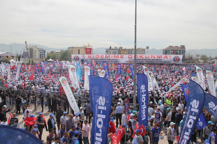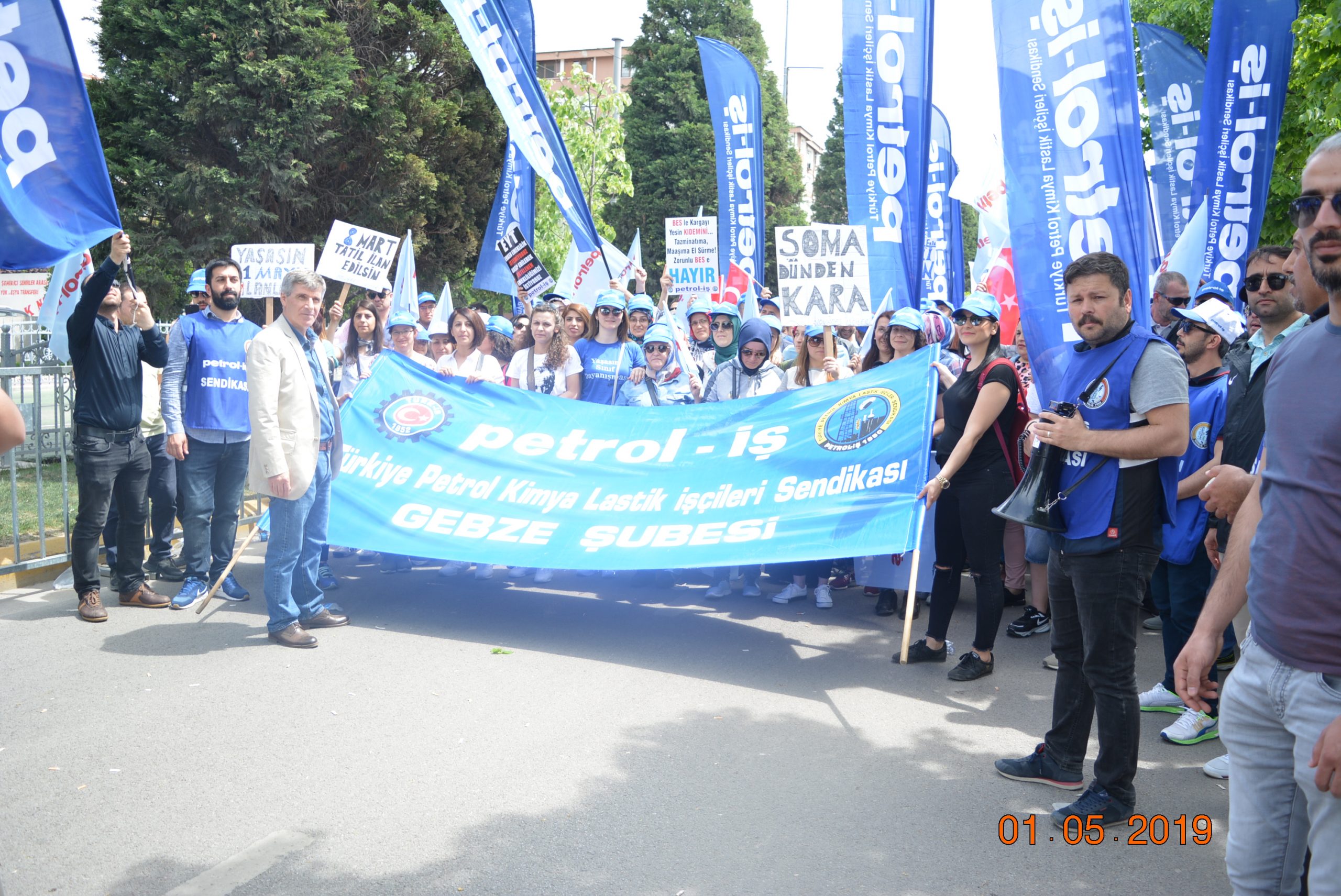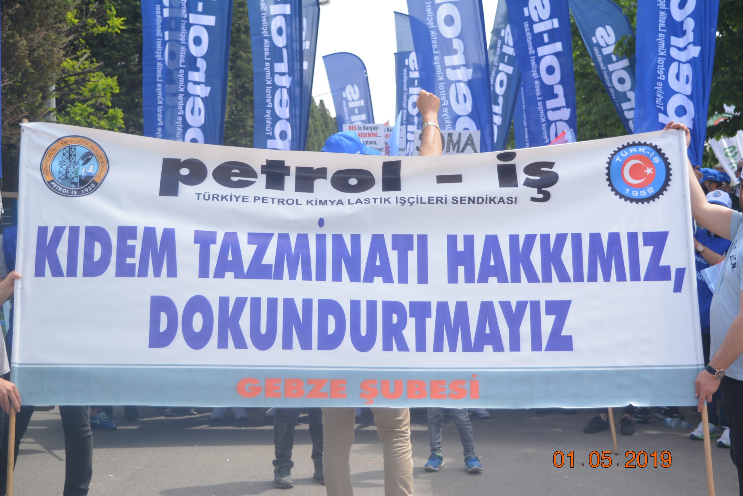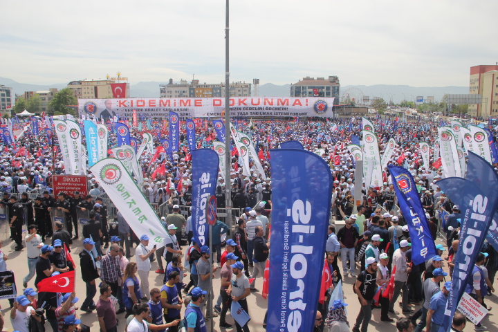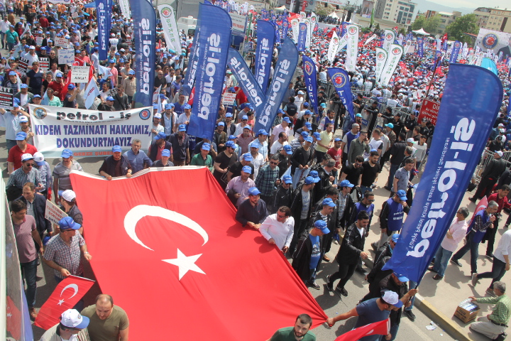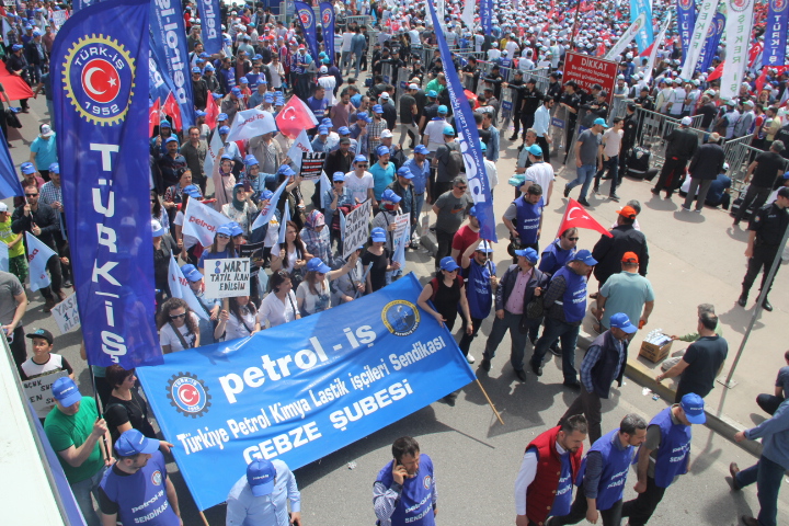Gebze Şubemiz Konfederasyonumuz TÜRK-İŞ’in bu yıl Kocaeli İzmit’te gerçekleştirdiği 1 Mayıs Emek ve Dayanışma Bayramını büyük bir coşku ile kutladı.Türk-İş’e bağlı sendikaların yoğun katılım sağladığı 1 Mayıs kutlamaları Milli İrade Meydanında yüz bin emekçinin katılımı ile gerçekleşti. Türk-iş üyeleri önce Doğu Kışla Parkı’nda 09.00’da bir araya geldi, ardından hep birlikte Rafet Karacan Bulvarı üzerinden Milli İrade Meydanı’na kadar yürüdü. 1 Mayıs kutlamalarına katılan İzmit Belediye Başkanı Fatma Kaplan Hürriyet üyelerimize kısa bir konuşma yaparak 1 Mayıs İşçi Bayramımızı kutladı. Coşkunun hiç düşmediği kutlamalarda sık sık “KIDEMİME DOKUNMA!!’’, KIDEME UZANAN ELLER KIRILSIN’’ sloganları atılarak Milli İrade Meydanına kadar yüründü. Üyelerimiz meydanda çalan emek şarkılarına eşlik ederek, davul zurna eşliğinde eğlendiler. 1 Mayıs’ta Onbinler Tek Ağızdan “Kıdemime Dokunma” Dedi!