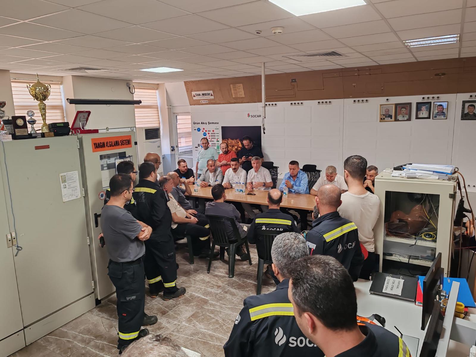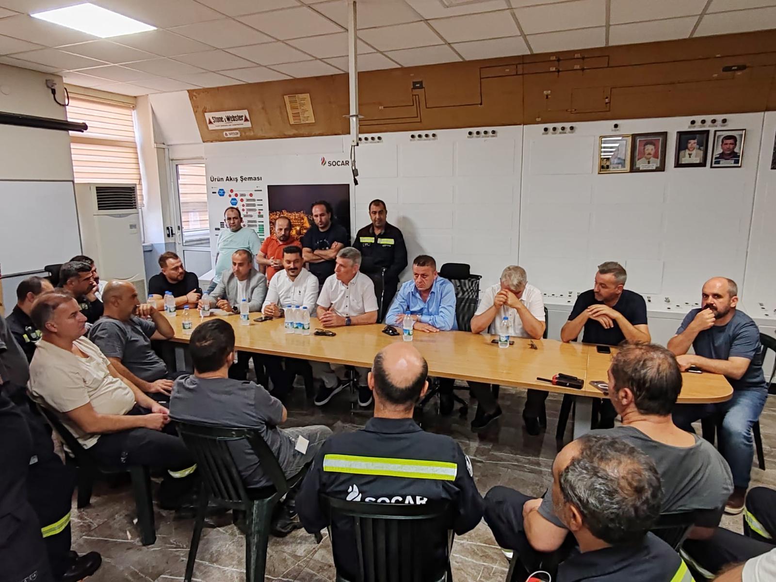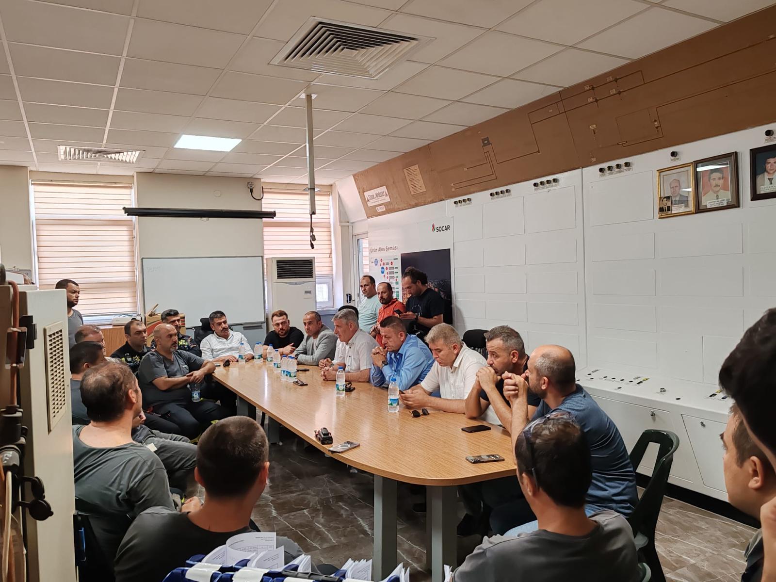 Ravago’nun ardından uzun yıllardır örgütlülüğümüzü koruduğumuz Petkim Petrokimya Etilen Fabrikası ve Star Rafineri MCB Board Kontrol birimini ziyaret eden Genel Başkan, üyelerimizle yaptığı açık toplantının ardından Petkim ve Star işyerlerinin bağlı olduğu SOCAR Grubu Yönetimi ile bir araya geldi. Socar Grubu adına Rafineri ve Petrokimya İş Birimi Başkanı Kanan Mirzayev ve Rafineri ve Petrokimya İş Birimi İnsan Kaynakları Başkan Yardımcısı Levent Kocagül ile görüşen sendikamız heyeti, ülke ekonomisindeki gelişmeler, üyelerimizin çalışma koşulları ve yeni dönem sözleşme süreçlerine dair fikir alışverişinde bulundular.