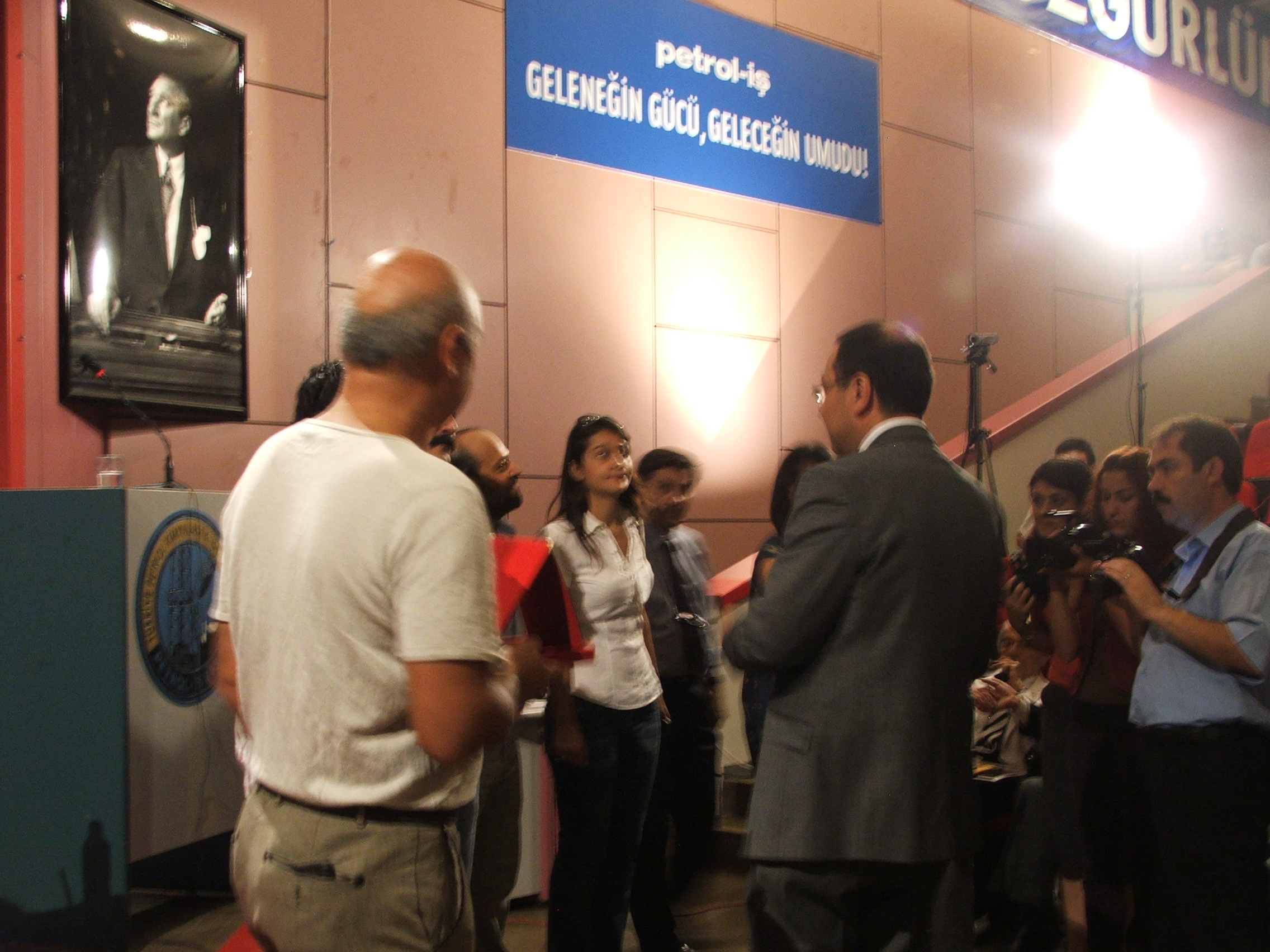 “Sendika Geleceğindir” filminde rol alan oyuncular Altan Gördüm, Feride Çetin, Mehmet Erbil ve Bahadır Bingöl ile film ekibi de Genel Kurul’a katılırken, Genel Başkanımız ekibe plaket verdi. Oyuncular ve film ekibi sahneye davet eden Öztaşkın, kendilerine teşekkür ederek plaketlerini sundu.
