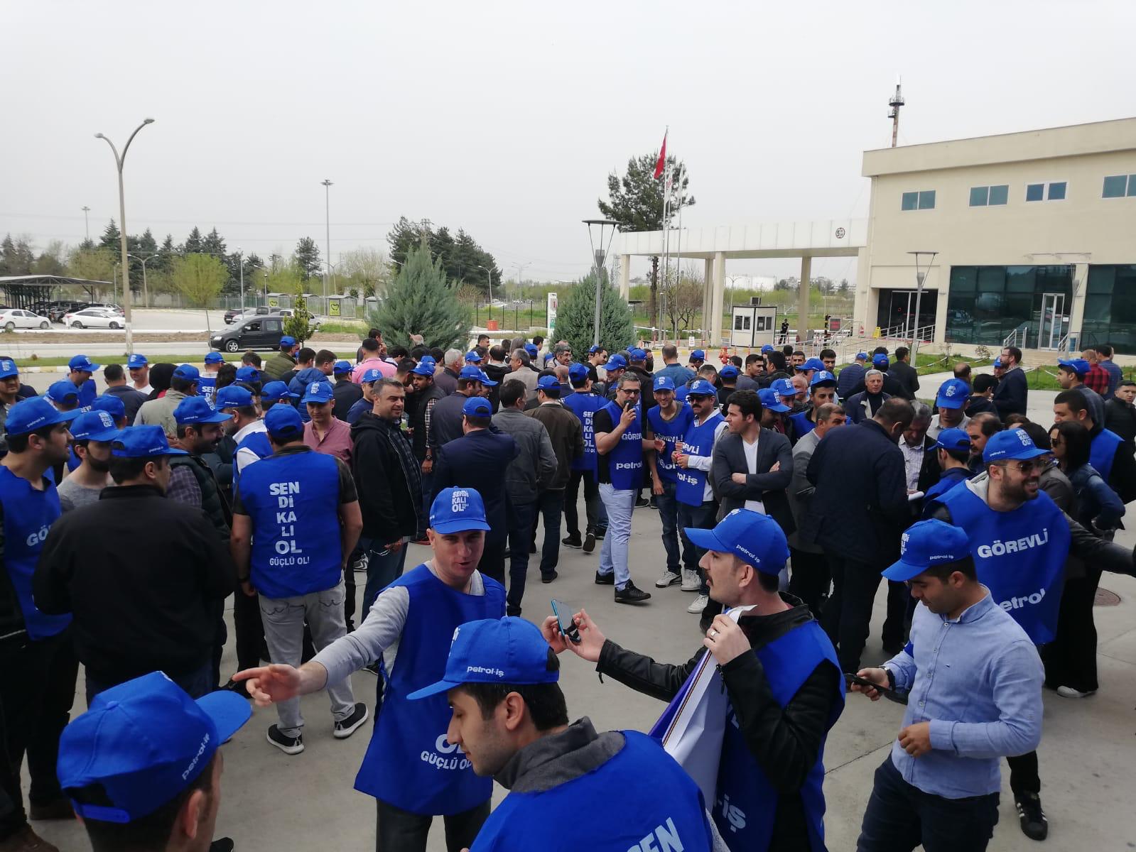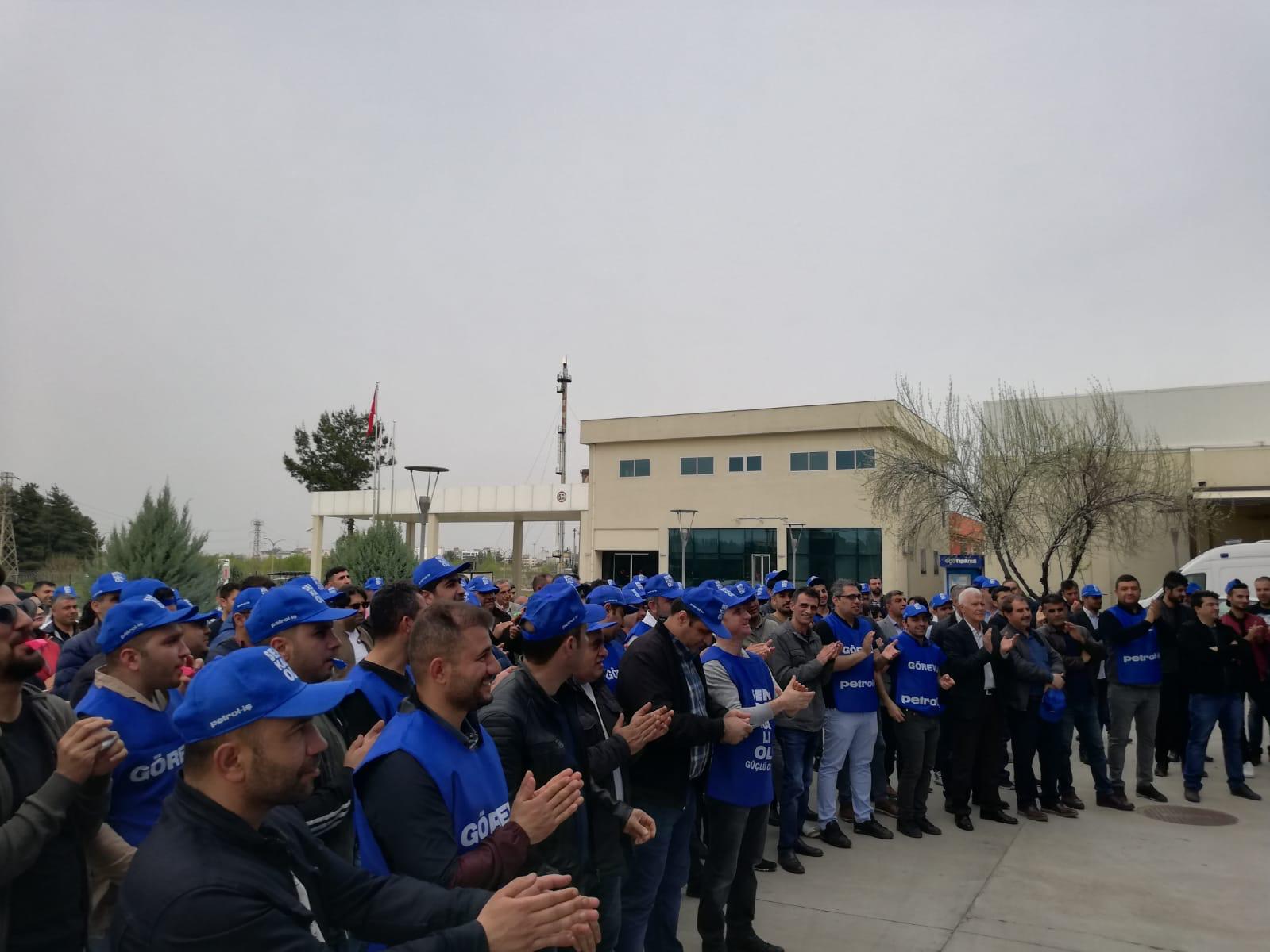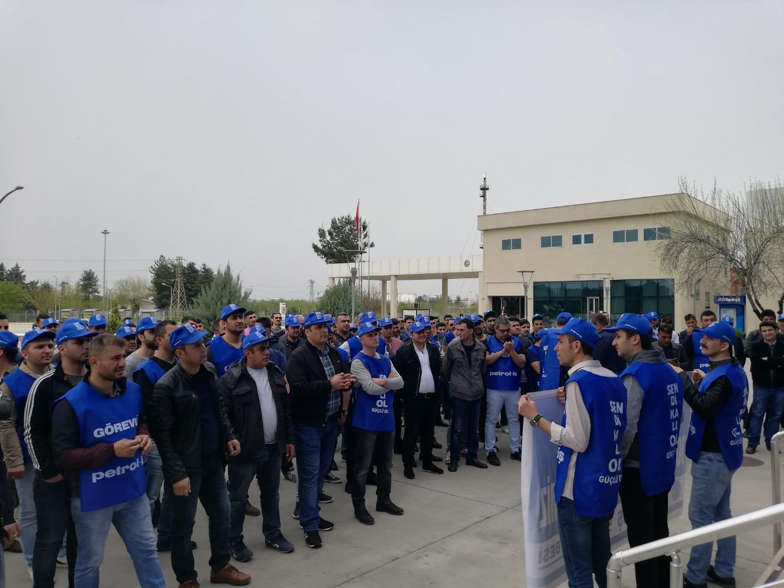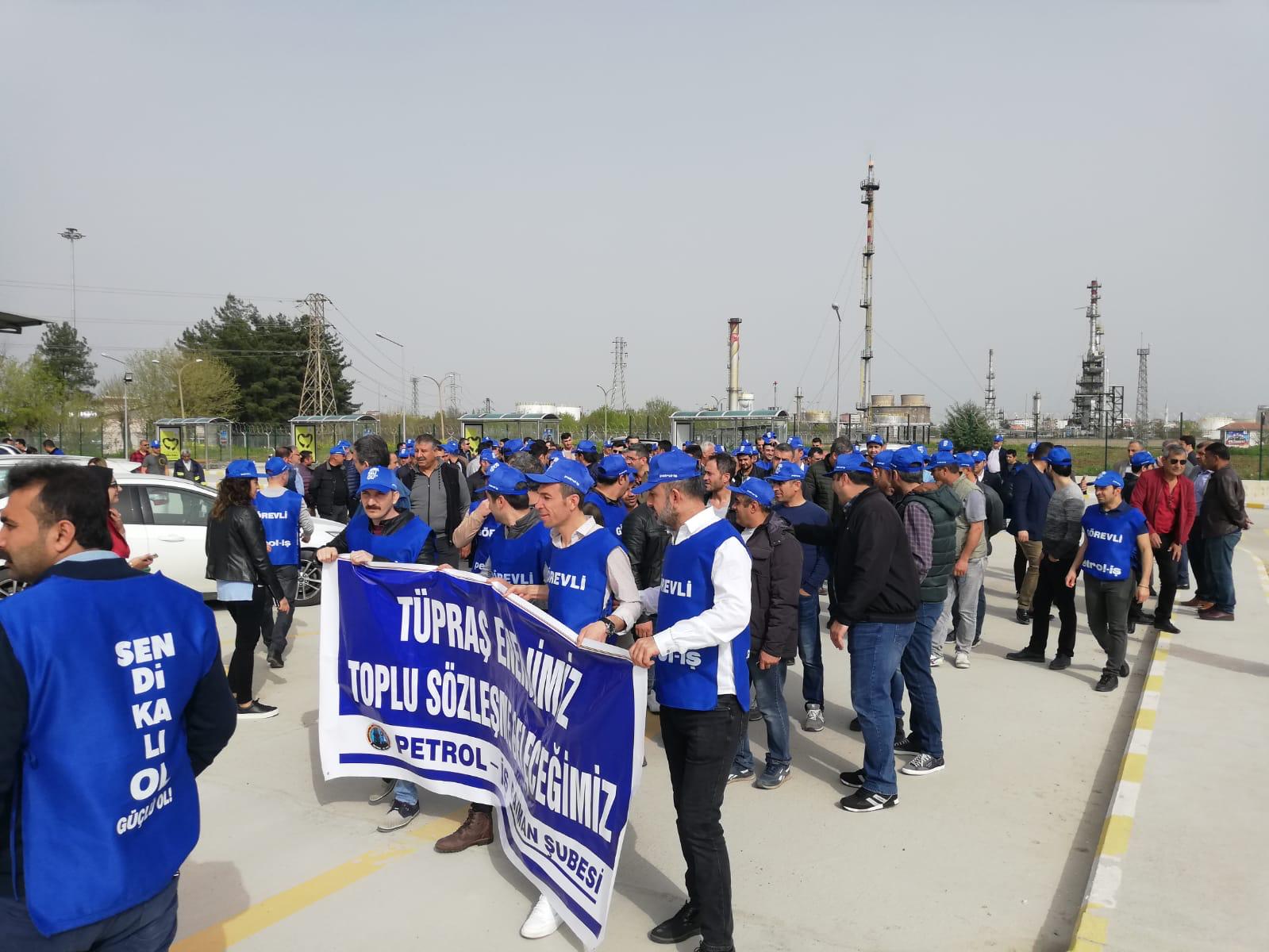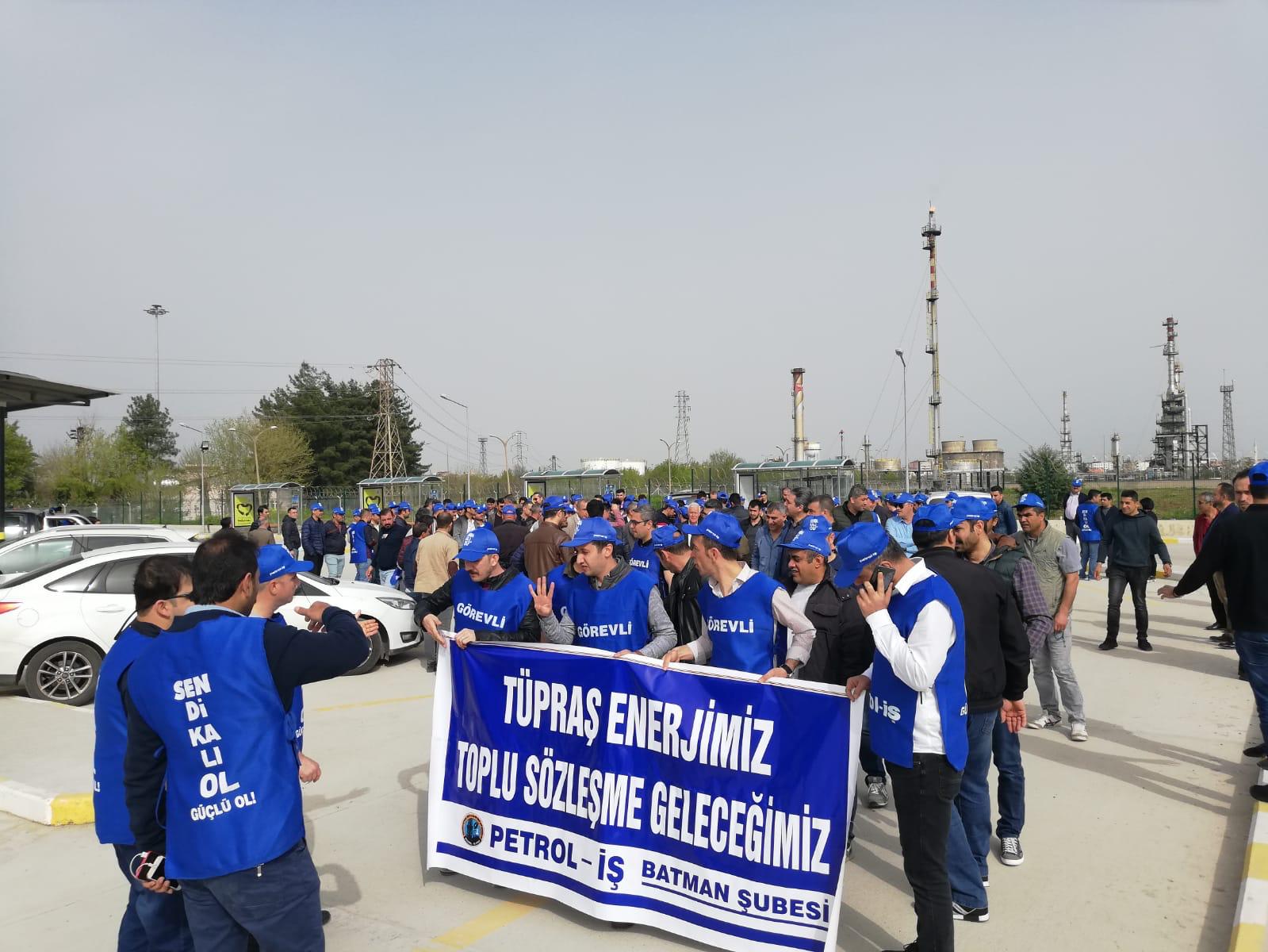 Batman Şubemizin örgütlü olduğu Tüpraş işyerinde toplu iş sözleşme sürecinde devam eden anlaşmazlıklar sebebiyle eylemler eş zamanlı olarak devam ediyor. Toplu İş Sözleşmesi görüşmesinde hiçbir maddemizin geçmemesi ve işverenin bizlere dayattığı vardiya sistemi, sözleşme süresi ve sundukları ücret teklifi sebebiyle 15 Nisan Pazartesi günü 4 Şubemizle (Batman,Kırıkkale,Kocaeli,Aliağa) eş zamanlı başlattığımız eylemlerimiz tam gün olarak sürüyor.