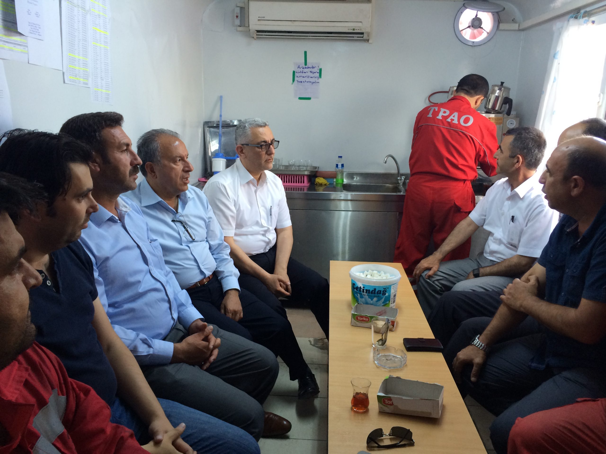 Genel Sekreterimiz Ali Ufuk Yaşar, Genel Yönetim Sekreterimiz Ahmet Kabaca, Adıyaman Şubemizi 17 Haziran Salı günü ziyaret etti. Merkez Yöneticilerimiz Yaşar ve Kabaca’yı Adıyaman Şube Başkanımız Ali Tirpan, Şube Başkan Yardımcılarımız Şahin Yılmaz, Sait Mustafa Daşdelen ve Adıyaman Şube Yönetim Kurulumuz karşıladılar. 1.5 gün boyunca süren yoğun programda merkez yöneticilerimiz ve Adıyaman Şube Yöneticilerimiz TPAO Bölge Müdürlüğünü, atölyeleri, Karakuş üretim ve sondaj sahalarını ziyaret ettiler.