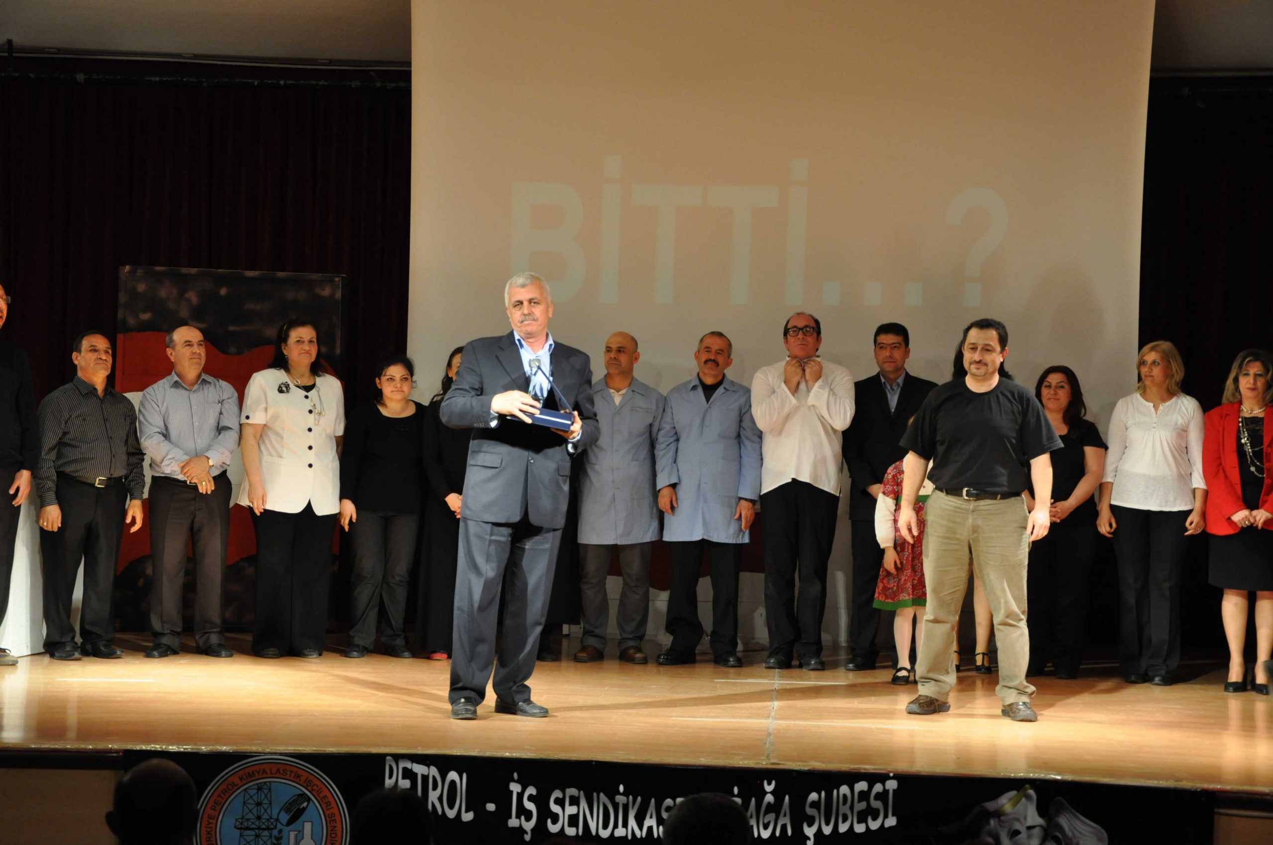 Oyun sonunda sahneye çıkan Petrol-İş Sendikası Aliağa Şube Başkanı İsmail Doğan, Ayaktakımı Tiyatro Topluluğu’na teşekkür ederken, oyun yönetmeni Cihangir Turantaş’a bir plaket takdim etti. Petrol-İş Sendikası Mersin Şube Başkanı Murat Marangoz, dans hocası Yasemin Tüzün’e plaketini takdim ederken, Petrol-İş Sendikası İzmir Şube Başkanı Gani Gündoğdu da oyuna katkılarından dolayı Yılmaz Tüzün’e plaketini sundu. Oyun yönetmeni Cihangir Turantaş, Çağlar Eskici’nin annesi Saime Eskici’yi sahneye davet ederek bir çiçek takdim etti.