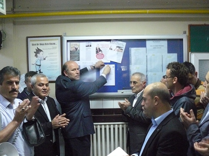 Şube Başkanımız Salih Akduman’ın konuşmasından sonra toplu olarak işyeri yemekhanesine gidilerek, ilan tahtasına grev ilanı asıldı.