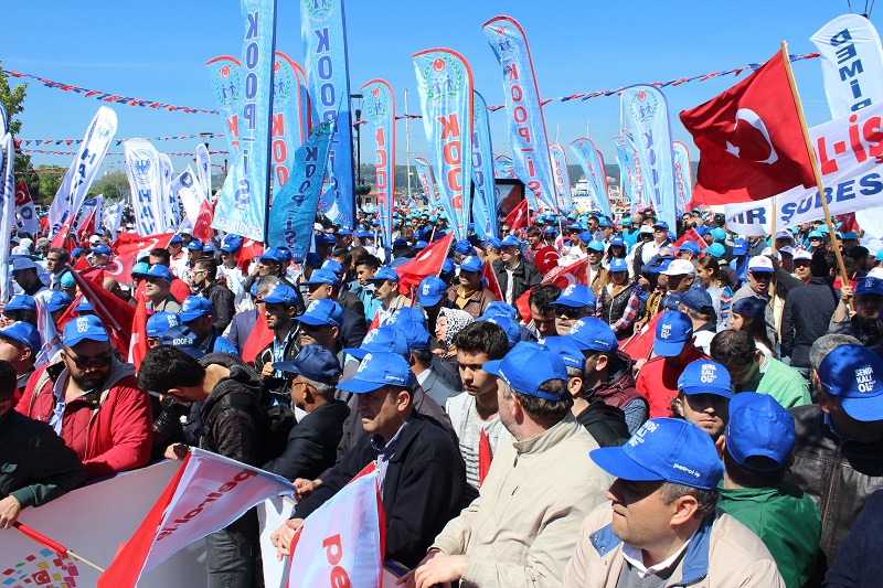 En önde Türk-İş’e bağlı tüm sendikaların genel başkanlarının aralarında Genel Başkanımız Ali Ufuk Yaşar’ın bulunduğu kortej ile Kordon’a kadar yapılan yürüyüşün ardından saat 10.30’da iskeledeki miting meydanına ulaşıldı. Kordon’da yer alan Piri Reis Müzesi önüne büyük bir platform kuruldu. 20 bine yakın işçi bu alanda bir araya geldi. Kortejin alana ulaşmasının ardından Türk-İş Genel Teşkilatlandırma Sekreteri ve Koop-İş Genel Başkanı Eyüp Alemdar açılış konuşmasını yaptı. Alemdar’dan sonra ise Türk-İş Genel Sekreteri ve Türk Metal Genel Başkanı Pevrul Kavlak konuştu. On binlerce emekçiye seslenen Kavlak, konuşmasında Çanakkale’de verilen şanlı direnişe değinerek, Türk işçi hareketinin de verdiği mücadelelerden zaferle ayrılacağını ifade etti.